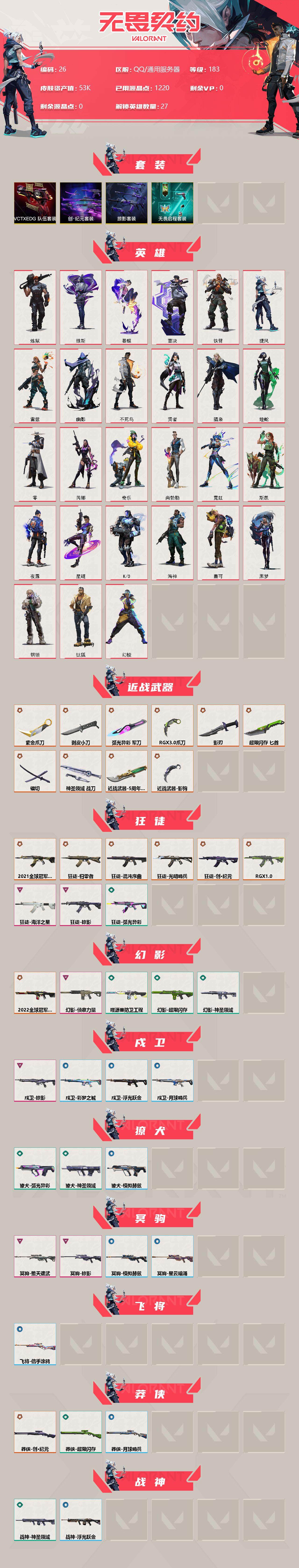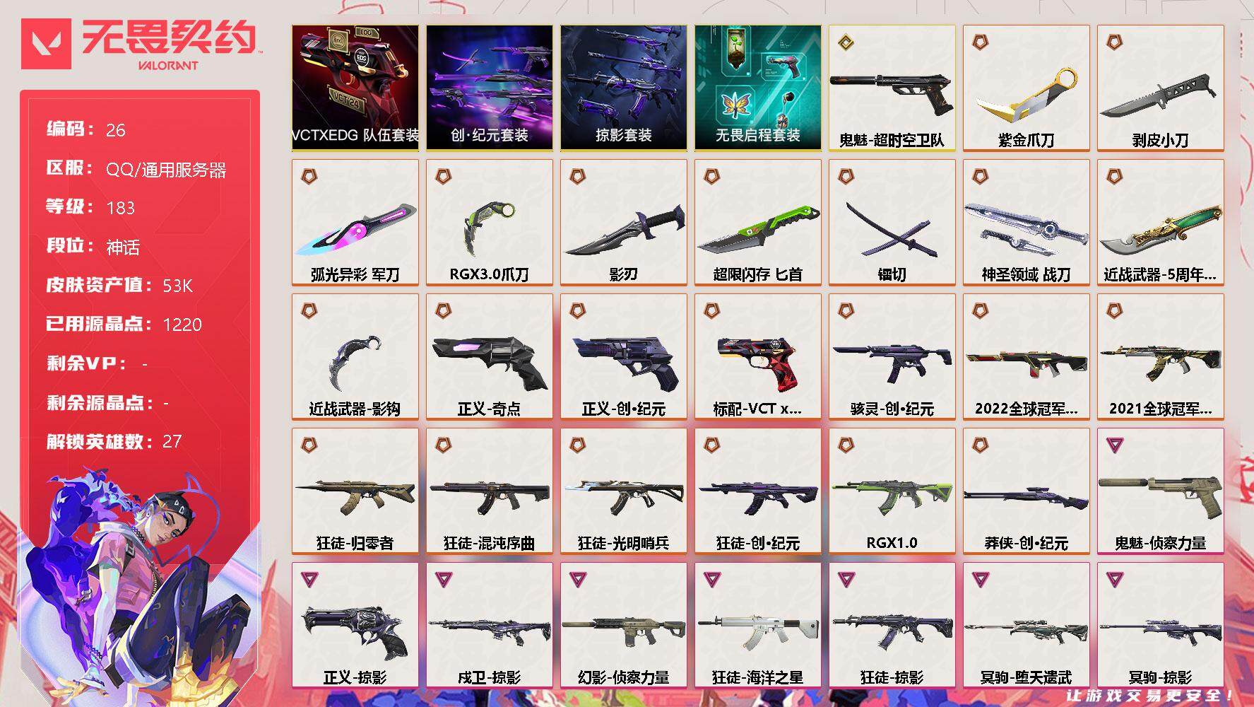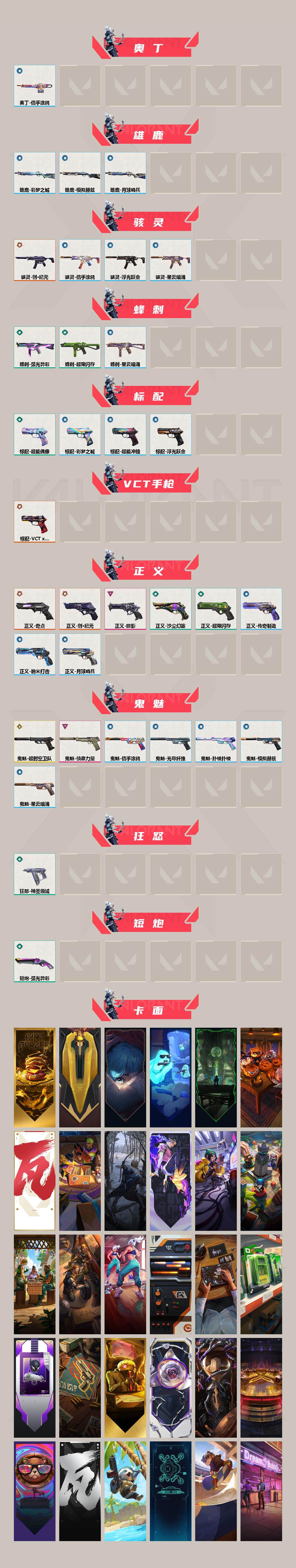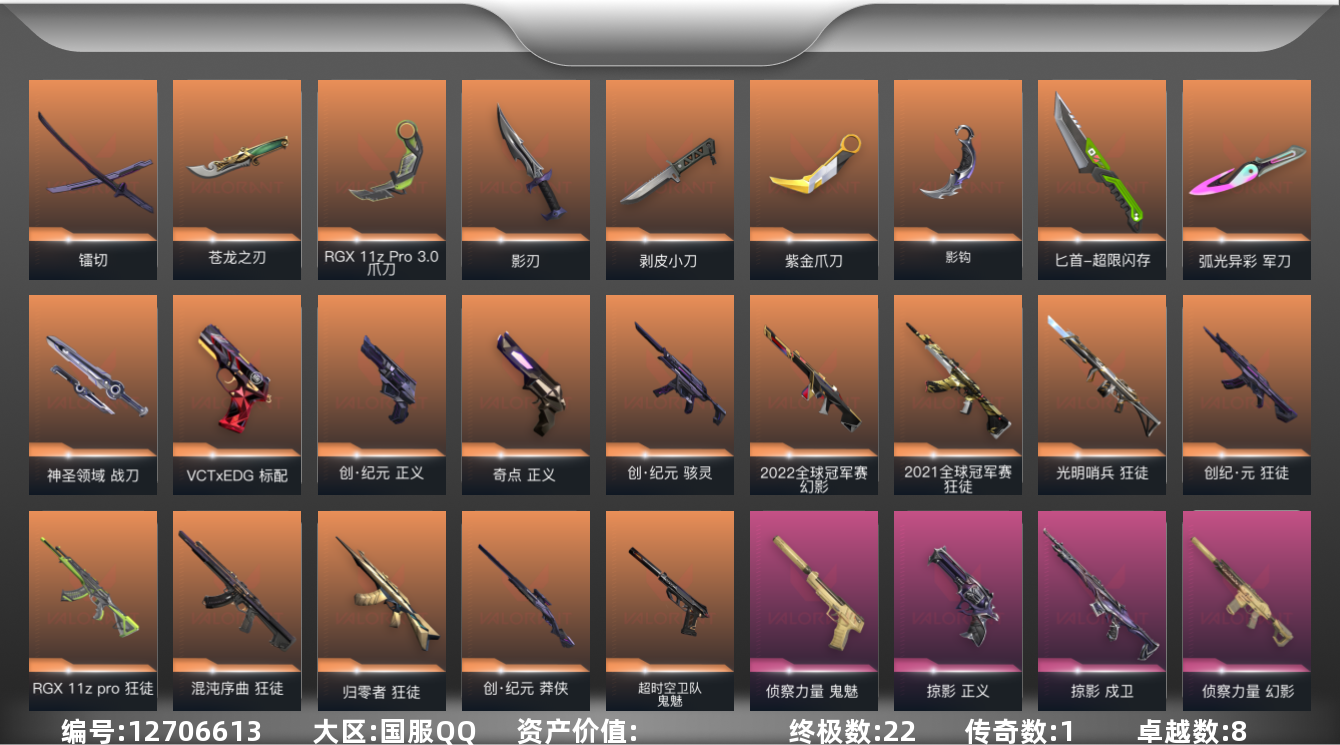 [12706613]【套装】:创·纪元套装,VCTxEDG 队伍套装,掠影套装,无畏启程套装 【英雄】:幻棱,炼狱,维斯,暮蝶,钛狐,壹决,铁臂,捷风,雷兹,幽影,不死鸟,贤者,猎枭,蝰蛇,零,芮娜,奇乐,尚勃勒,霓虹,斯凯,夜露,星礈,K/O,海神,盖可,黑梦,钢锁 【近战 武器】:近战武器-影钩,近战武器-5周年//公测重制版 苍龙之刃,近战武器-剥皮小刀,近战武器-紫金爪刀,近战武器-RGX 11z Pro//3.0 爪刀,近战武器-镭切,近战武器-超限闪存 匕首,近战武器-弧光异彩 军刀,近战武器-影刃,近战武器-神圣领域 战刀 【狂徒】:狂徒-2021全球冠军赛,狂徒-光明哨兵,狂徒-归零者,狂徒-混沌序曲,狂徒-创·纪元,狂徒-RGX 11z Pro,狂徒-掠影,狂徒-海洋之星,狂徒-弧光异彩 【幻影】:幻影-2022全球冠军赛,幻影-侦察力量,幻影-超限闪存,幻影-噬源兽防卫工程,幻影-神圣领域 【戍卫】:戍卫-掠影,戍卫-彩梦之城,戍卫-浮光跃金,戍卫-月球哨兵 【獠犬】:獠犬-弧光异彩,獠犬-神圣领域,獠犬-模拟赫兹 【冥驹】:冥驹-堕天遗武,冥驹-掠影,冥驹-模拟赫兹,冥驹-星云暗涌 【飞将】:飞将-信手涂鸦 【莽侠】:莽侠-创·纪元,莽侠-超限闪存,莽侠-月球哨兵 【战神】:战神-神圣领域,战神-浮光跃金 【奥丁】:奥丁-信手涂鸦 【雄鹿】:雄鹿-彩梦之城,雄鹿-模拟赫兹,雄鹿-月球哨兵 【骇灵】:骇灵-创·纪元,骇灵-浮光跃金,骇灵-信手涂鸦,骇灵-星云暗涌 【蜂刺】:蜂刺-超限闪存,蜂刺-弧光异彩,蜂刺-星云暗涌 【标配】:标配-超能偶像,标配-彩梦之城,标配-超能冲撞,标配-浮光跃金 【VCT手枪】:标配-VCT x EDG 【正义】:正义-奇点,正义-创·纪元,正义-掠影,正义-超限闪存,正义-沙尘幻旅,正义-传奇制造,正义-纳米打击,正义-月球哨兵 【鬼魅】:鬼魅-超时空卫队,鬼魅-侦察力量,鬼魅-光导纤维,鬼魅-模拟赫兹,鬼魅-扑棱扑棱,鬼魅-信手涂鸦,鬼魅-星云暗涌 【狂怒】:狂怒-神圣领域 【短炮】:短炮-弧光异彩 【卡面】:终章:激斗汉堡 卡面,进入射程 卡面,《双城之战》拥抱 卡面,精灵大战 卡面,欢迎来到底城 卡面,南瓜盛典 卡面,VCT CN首冠 卡面,唱片的故事 卡面,钢弓与箭弦 卡面,无畏契约:暮蝶 卡面,排除故障 卡面,战术桌游 卡