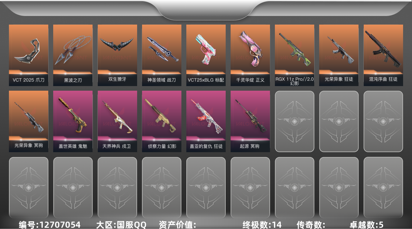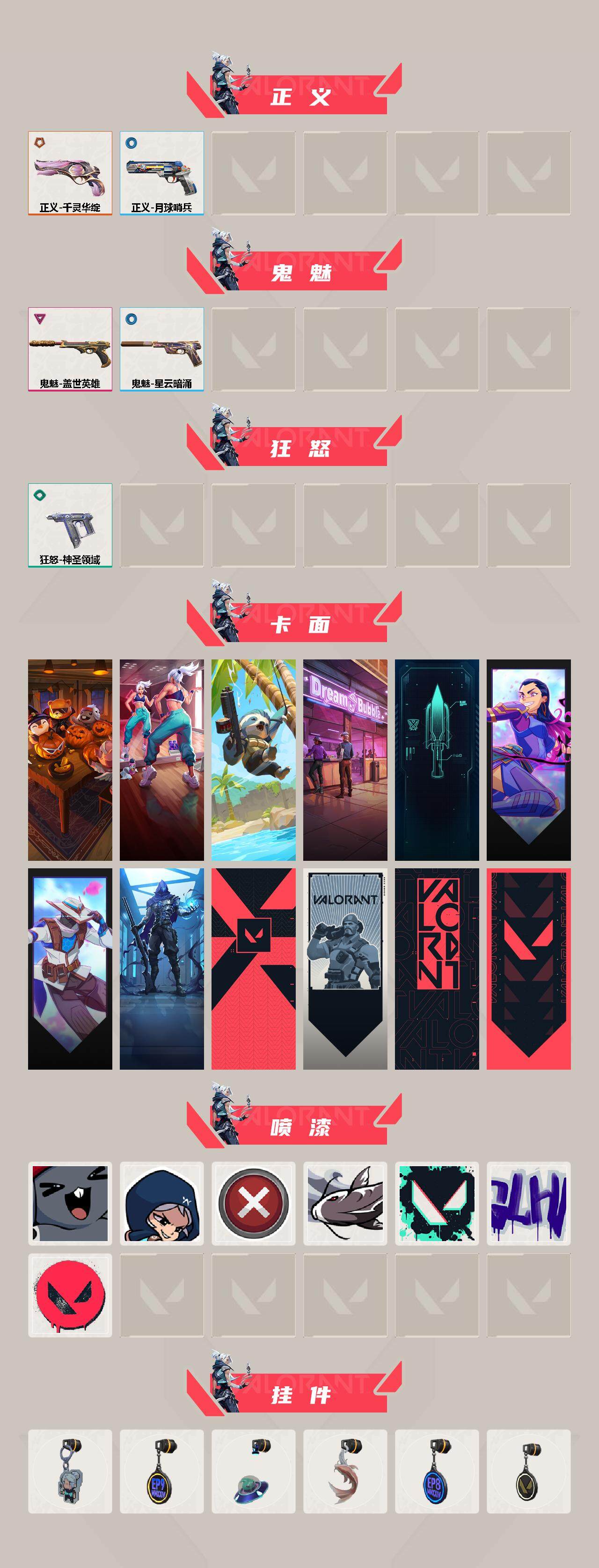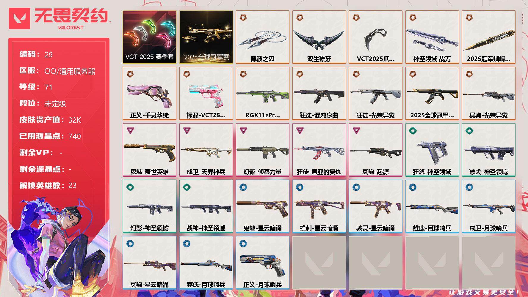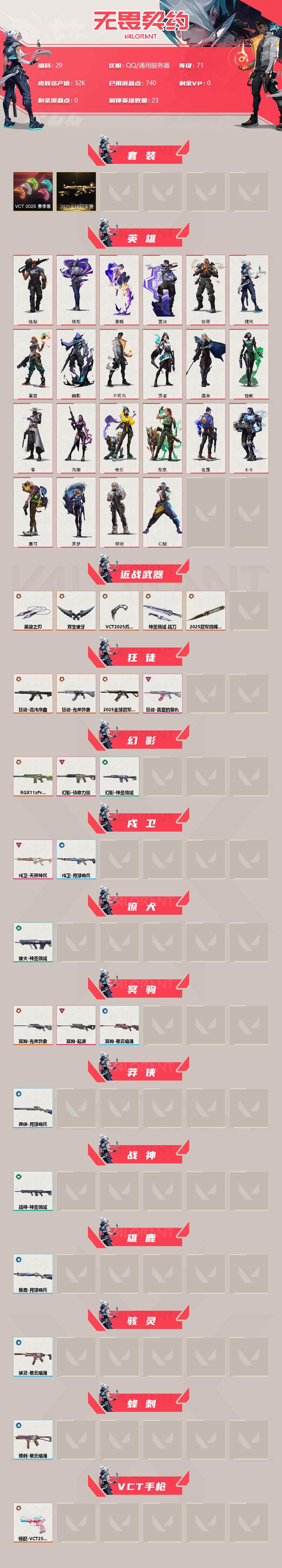 [12707054]【套装】:2025全球冠军赛套装,VCT 2025 赛季套装 【英雄】:幻棱,炼狱,维斯,暮蝶,壹决,铁臂,捷风,雷兹,幽影,不死鸟,贤者,猎枭,蝰蛇,零,芮娜,奇乐,斯凯,夜露,K/O,盖可,黑梦,钢锁 【近战 武器】:近战武器-2025全球冠军赛 蝴蝶刀,近战武器-VCT 2025 爪刀,近战武器-黑波之刃,近战武器-双生獠牙,近战武器-神圣领域 战刀 【狂徒】:狂徒-2025全球冠军赛,狂徒-混沌序曲,狂徒-光荣异象,狂徒-盖亚的复仇 【幻影】:幻影-RGX 11z Pro//2.0,幻影-侦察力量,幻影-神圣领域 【戍卫】:戍卫-天界神兵,戍卫-月球哨兵 【獠犬】:獠犬-神圣领域 【冥驹】:冥驹-光荣异象,冥驹-起源,冥驹-星云暗涌 【莽侠】:莽侠-月球哨兵 【战神】:战神-神圣领域 【雄鹿】:雄鹿-月球哨兵 【骇灵】:骇灵-星云暗涌 【蜂刺】:蜂刺-星云暗涌 【VCT手枪】:标配-VCT25 x BLG 【正义】:正义-千灵华绽,正义-月球哨兵 【鬼魅】:鬼魅-盖世英雄,鬼魅-星云暗涌 【狂怒】:狂怒-神圣领域 【卡面】:南瓜盛典 卡面,热舞环节 卡面,树懒大作战 卡面,梦幻奶茶 卡面,零点嗅探设计图 卡面,无畏契约GO!第一卷:芮娜 卡面,无畏契约GO!第一卷:零 卡面,暗枪 卡面,代号红色 卡面,新兵报到 卡面,V契约 卡面,无畏契约 卡面 【喷漆】:超级粉丝 喷漆,捷风差距 喷漆,买装还是存钱 喷漆,松叶 喷漆,胜利属于无畏契约 喷漆,GLHF 喷漆,无畏契约 喷漆 【挂饰】:袖珍捷风 挂饰,第九季//第一幕 纪念币 挂饰,天外飞客 挂饰,红鳞松叶 挂饰,第八季//第一幕 纪念币 挂饰,无畏契约 纪念币 挂饰