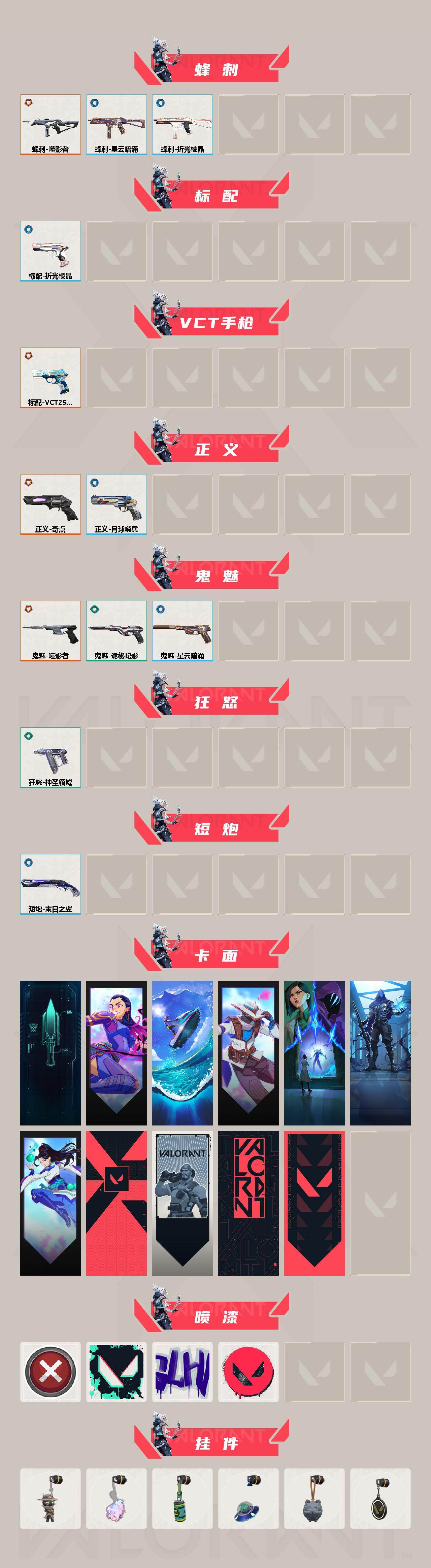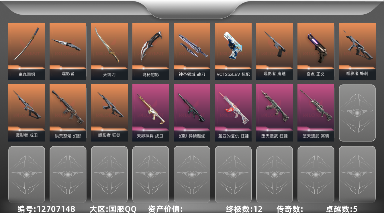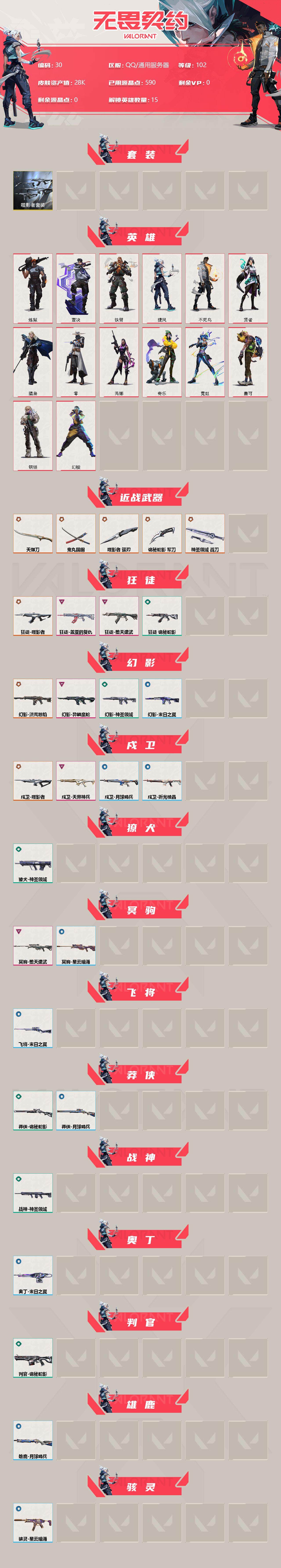 [12707148]【套装】:噬影者套装 【英雄】:幻棱,炼狱,壹决,铁臂,捷风,不死鸟,贤者,猎枭,零,芮娜,奇乐,霓虹,盖可,钢锁 【近战 武器】:近战武器-噬影者 簇刃,近战武器-鬼丸国纲,近战武器-天御刀,近战武器-诡秘蛇影 军刀,近战武器-神圣领域 战刀 【狂徒】:狂徒-噬影者,狂徒-堕天遗武,狂徒-盖亚的复仇,狂徒-诡秘蛇影 【幻影】:幻影-洪荒怒焰,幻影-异鳞魔蛇,幻影-神圣领域,幻影-末日之翼 【戍卫】:戍卫-噬影者,戍卫-天界神兵,戍卫-月球哨兵,戍卫-折光棱晶 【獠犬】:獠犬-神圣领域 【冥驹】:冥驹-堕天遗武,冥驹-星云暗涌 【飞将】:飞将-末日之翼 【莽侠】:莽侠-诡秘蛇影,莽侠-月球哨兵 【战神】:战神-神圣领域 【奥丁】:奥丁-末日之翼 【判官】:判官-诡秘蛇影 【雄鹿】:雄鹿-月球哨兵 【骇灵】:骇灵-星云暗涌 【蜂刺】:蜂刺-噬影者,蜂刺-星云暗涌,蜂刺-折光棱晶 【标配】:标配-折光棱晶 【VCT手枪】:标配-VCT25 x LEV 【正义】:正义-奇点,正义-月球哨兵 【鬼魅】:鬼魅-噬影者,鬼魅-诡秘蛇影,鬼魅-星云暗涌 【狂怒】:狂怒-神圣领域 【短炮】:短炮-末日之翼 【卡面】:零点嗅探设计图 卡面,无畏契约GO!第一卷:芮娜 卡面,复古浪潮 卡面,无畏契约GO!第一卷:零 卡面,蝰蛇vs幽影 卡面,暗枪 卡面,无畏契约GO!第一卷:贤者 卡面,代号红色 卡面,新兵报到 卡面,V契约 卡面,无畏契约 卡面 【喷漆】:买装还是存钱 喷漆,胜利属于无畏契约 喷漆,GLHF 喷漆,无畏契约 喷漆 【挂饰】:无畏契约GO!第一卷 零 挂饰,超能偶像 挂饰,Z世代特饮 挂饰,天外飞客 挂饰,《双城之战》魄罗 挂饰,无畏契约 纪念币 挂饰