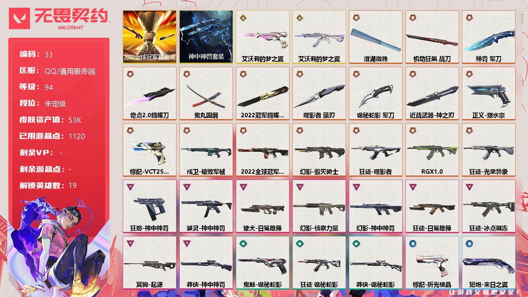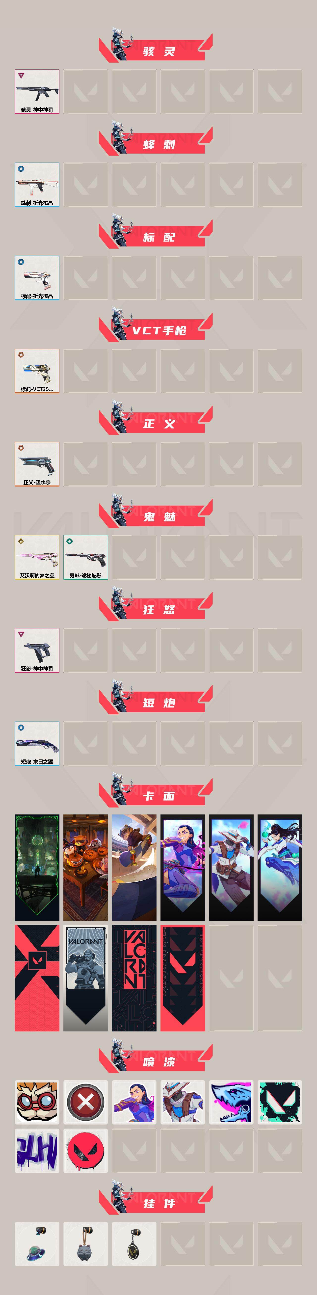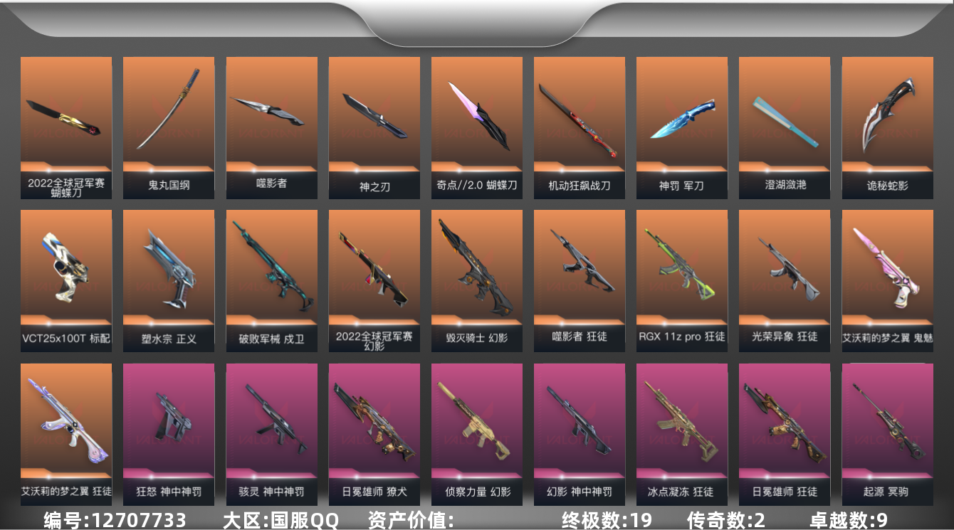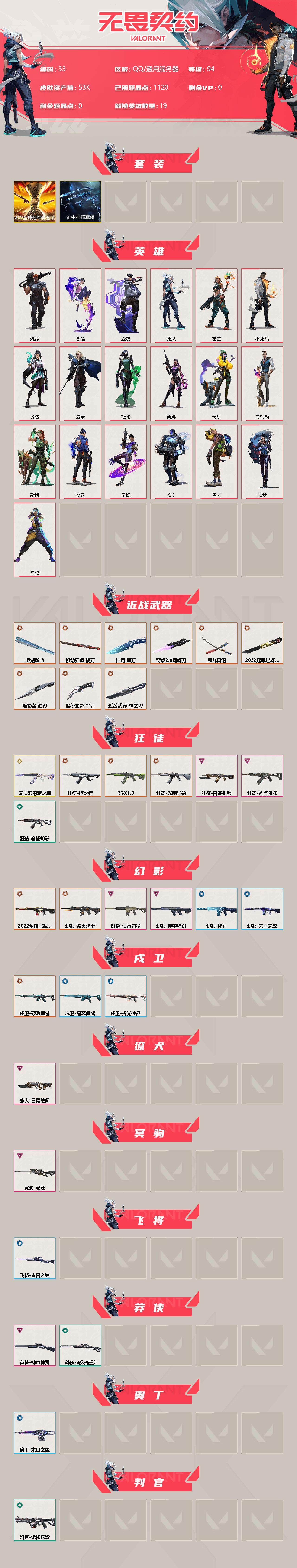 [12707733]【套装】:2022全球冠军赛套装,神中神罚套装 【英雄】:幻棱,炼狱,暮蝶,壹决,捷风,雷兹,不死鸟,贤者,猎枭,蝰蛇,芮娜,奇乐,尚勃勒,斯凯,夜露,星礈,K/O,盖可,黑梦 【近战 武器】:近战武器-2022全球冠军赛 蝴蝶刀,近战武器-神之刃,近战武器-奇点//2.0 蝴蝶刀,近战武器-噬影者 簇刃,近战武器-澄湖潋滟,近战武器-鬼丸国纲,近战武器-机动狂飙 战刀,近战武器-神罚 军刀,近战武器-诡秘蛇影 军刀 【狂徒】:狂徒-艾沃莉的梦之翼,狂徒-噬影者,狂徒-RGX 11z Pro,狂徒-光荣异象,狂徒-冰点凝冻,狂徒-日冕雄师,狂徒-诡秘蛇影 【幻影】:幻影-2022全球冠军赛,幻影-毁灭骑士,幻影-侦察力量,幻影-神中神罚,幻影-神罚,幻影-末日之翼 【戍卫】:戍卫-破败军械,戍卫-晶态集成,戍卫-折光棱晶 【獠犬】:獠犬-日冕雄师 【冥驹】:冥驹-起源 【飞将】:飞将-末日之翼 【莽侠】:莽侠-神中神罚,莽侠-诡秘蛇影 【奥丁】:奥丁-末日之翼 【判官】:判官-诡秘蛇影 【骇灵】:骇灵-神中神罚 【蜂刺】:蜂刺-折光棱晶 【标配】:标配-折光棱晶 【VCT手枪】:标配-VCT25 x 100T 【正义】:正义-塑水宗 【鬼魅】:鬼魅-艾沃莉的梦之翼,鬼魅-诡秘蛇影 【狂怒】:狂怒-神中神罚 【短炮】:短炮-末日之翼 【卡面】:欢迎来到底城 卡面,南瓜盛典 卡面,Clutch 卡面,无畏契约GO!第一卷:芮娜 卡面,无畏契约GO!第一卷:零 卡面,无畏契约GO!第一卷:贤者 卡面,代号红色 卡面,新兵报到 卡面,V契约 卡面,无畏契约 卡面 【喷漆】:都算到了 喷漆,买装还是存钱 喷漆,无畏契约GO!第一卷:芮娜 喷漆,无畏契约GO!第一卷:零 喷漆,暴走萝莉 喷漆,胜利属于无畏契约 喷漆,GLHF 喷漆,无畏契约 喷漆 【挂饰】:天外飞客 挂饰,《双城之战》魄罗 挂饰,无畏契约 纪念币 挂饰