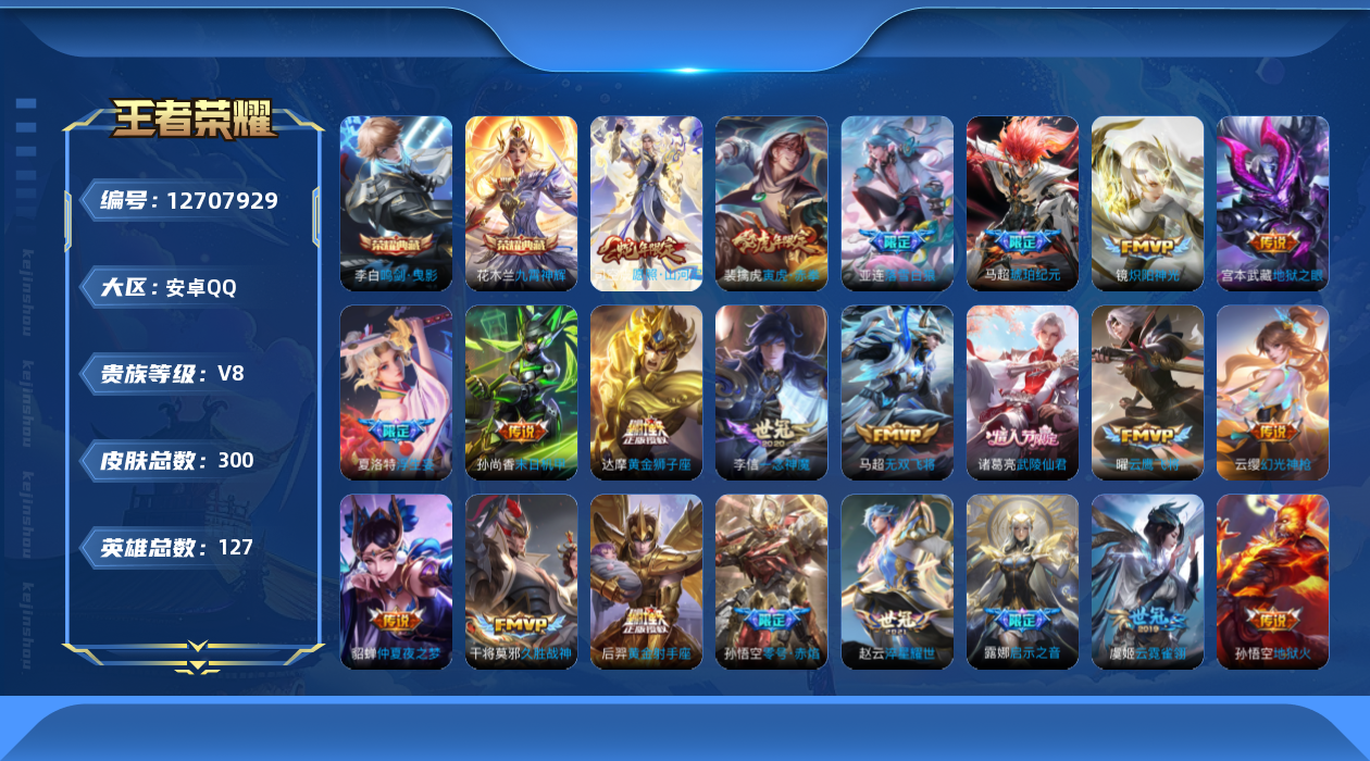 - [11473028]V8 20传说 111英雄 242皮肤 可修改实名 优质装备:云鹰飞将(小将军),炽阳神光,地狱之眼,时之恋人-刘备(电焊工),淬星耀世,超时空战士-狄仁杰,浮生妄,鹤羽星尊,澜逐花归海 传说皮:典韦战鼓燎原,云诺千山,祥瑞亨通,幻光神枪 珍宝阁皮:妄想食味 限定皮:愿照·九州拓(澜年限),愿照·岁时盈(虞姬年限),愿照·山河定(司空震年限),逐霄战戟,鸣野蒿,至尊宝,傲雪梅枪,白晶晶,神威(电光马子),飞衡(韩信年限),齐天大圣,怒海麟威,岱宗(典韦年限),李小龙,默契交锋-花木兰,百木心枪,山海·玄木吟(马可年限) 史诗皮:器灵·浮梦炉,绮世丹青,瑰影绮梦,化蝶舞,龙之律动,雪豹·霜爪,石田雨龙,茶境仙,破空之剑,琥珀纪元伽罗,蔬乡物语(鲁班七号),超元猎域,百相守梦-百里守约,星界特工,百相守梦-黄忠,织梦人,紫霞仙子,电玩小子(小书包),黄金分割率,特工魅影,千年之狐,永昼,江河有灵,匿光侦查者,魅语,百解令(蒙犽),高渐离燃音魔法,冰冠公主,偶像歌手,暗夜猫娘,猫狗日记-孙策,乱世虎臣,节奏热浪,修罗,女仆咖啡,摇滚巨星,水果甜心,绅士熊喵,星夜王子,德古拉伯爵,暗隐猎兽者,幽灵船长,鬼剑武藏,暗渊魔法,心灵战警,天秀·启明,地狱岩魂,纤云弄巧,逐浪之夏,月团寄思,水晶猎龙者,曙光守护者,金属风暴,圣诞狂欢,鹰眼统帅,魅力维加斯,赏金猎手,天秀·音浪,无心,未来纪元-赵云