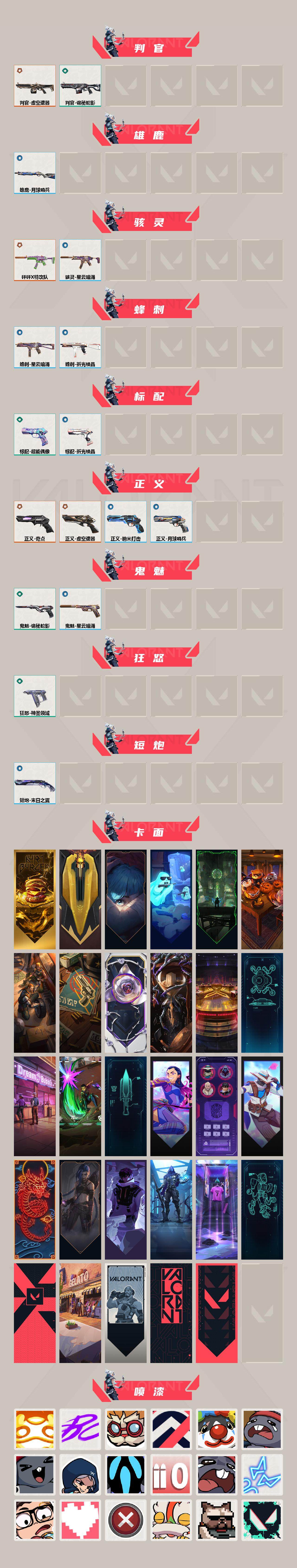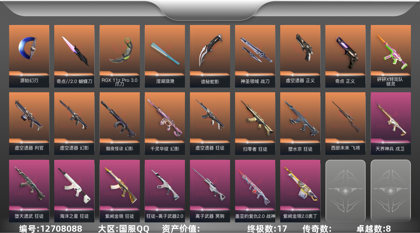 [12708088]【套装】:虚空遗器套装 【英雄】:幻棱,炼狱,维斯,暮蝶,钛狐,壹决,铁臂,捷风,雷兹,幽影,不死鸟,贤者,猎枭,蝰蛇,零,芮娜,奇乐,尚勃勒,霓虹,斯凯,夜露,星礈,K/O,海神,盖可,黑梦,钢锁 【近战 武器】:近战武器-奇点//2.0 蝴蝶刀,近战武器-RGX 11z Pro//3.0 爪刀,近战武器-澄湖潋滟,近战武器-源始幻刃,近战武器-诡秘蛇影 军刀,近战武器-神圣领域 战刀 【狂徒】:狂徒-归零者,狂徒-塑水宗,狂徒-虚空遗器,狂徒-堕天遗武,狂徒-海洋之星,狂徒-紫阙金琅,狂徒-离子武器//2.0,狂徒-诡秘蛇影 【幻影】:幻影-黯夜怪谈,幻影-千灵华绽,幻影-虚空遗器,幻影-神圣领域,幻影-末日之翼 【戍卫】:戍卫-天界神兵,戍卫-月球哨兵,戍卫-折光棱晶 【獠犬】:獠犬-神圣领域 【冥驹】:冥驹-离子武器,冥驹-星云暗涌 【飞将】:飞将-西部未来,飞将-末日之翼 【莽侠】:莽侠-诡秘蛇影,莽侠-月球哨兵 【战神】:战神-盖亚的复仇//2.0,战神-神圣领域 【奥丁】:奥丁-紫阙金琅//2.0,奥丁-末日之翼 【判官】:判官-虚空遗器,判官-诡秘蛇影 【雄鹿】:雄鹿-月球哨兵 【骇灵】:骇灵-砰砰X特攻队,骇灵-星云暗涌 【蜂刺】:蜂刺-星云暗涌,蜂刺-折光棱晶 【标配】:标配-超能偶像,标配-折光棱晶 【正义】:正义-奇点,正义-虚空遗器,正义-纳米打击,正义-月球哨兵 【鬼魅】:鬼魅-诡秘蛇影,鬼魅-星云暗涌 【狂怒】:狂怒-神圣领域 【短炮】:短炮-末日之翼 【卡面】:终章:激斗汉堡 卡面,进入射程 卡面,《双城之战》拥抱 卡面,精灵大战 卡面,欢迎来到底城 卡面,南瓜盛典 卡面,修车达人 卡面,正义的化身 卡面,铁之华 卡面,时间到 卡面,最高舞台 卡面,声感陷阱设计图 卡面,梦幻奶茶 卡面,源能反应 卡面,零点嗅探设计图 卡面,无畏契约GO!第一卷:芮娜 卡面,清除名单 卡面,无畏契约GO!第一卷:零 卡面,龍记 卡面,《双城之战》金克丝 卡面,逆向独行 卡面 ,暗枪 卡面,"Luie" 卡面,铁臂设计图 卡面,代号红色 卡面,冰淇淋店 卡面,新兵报到 卡面,V契约 卡面,无畏契约 卡面 【喷漆】:嗨宝南瓜灯 喷漆,嘭! 喷漆,都算到了 喷漆,控场勿近 喷漆,小丑猫 喷漆,熊抱 喷漆,超级粉丝 喷漆,捷风差距 喷漆,惊声尖叫 喷漆,拼一