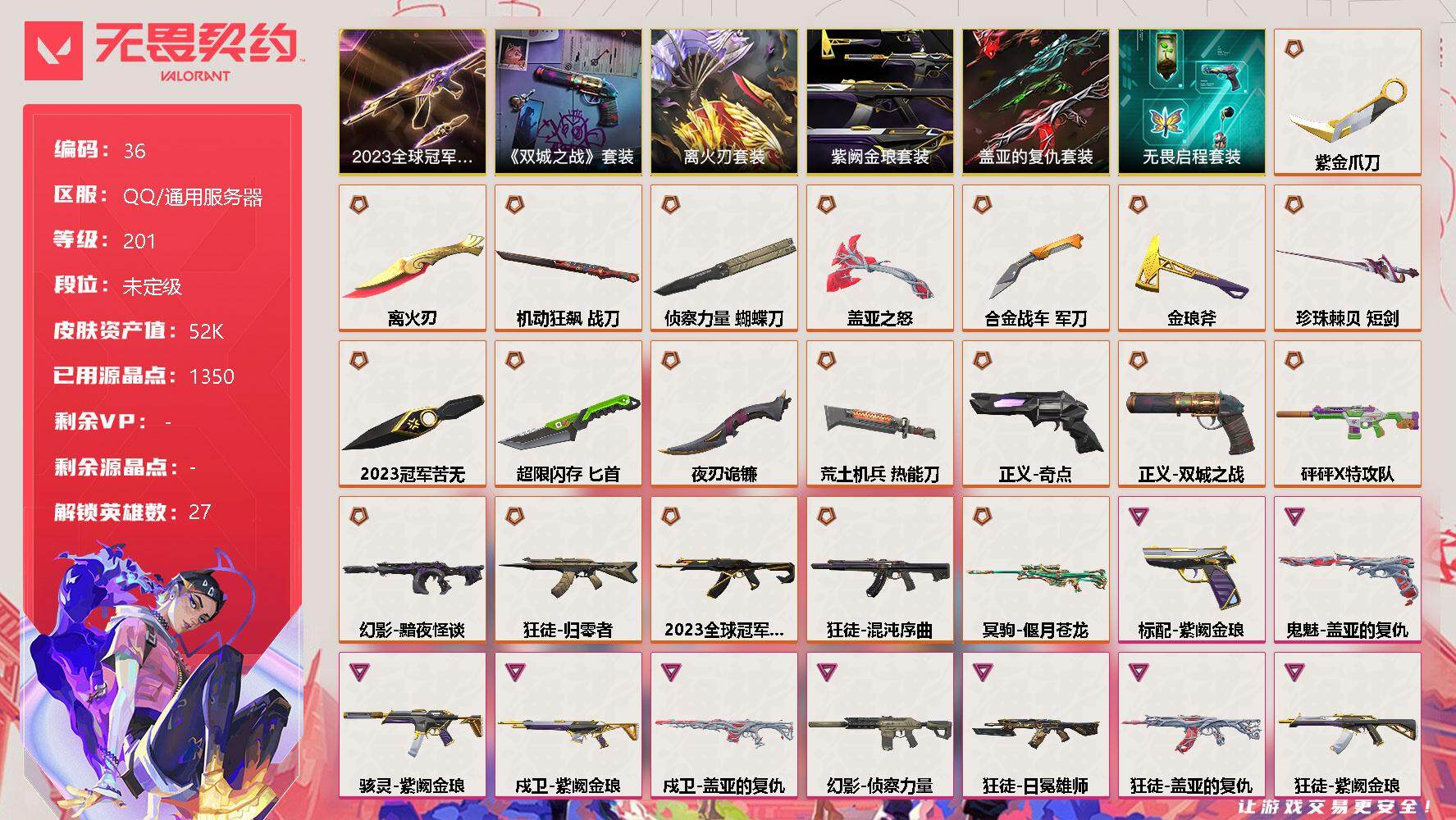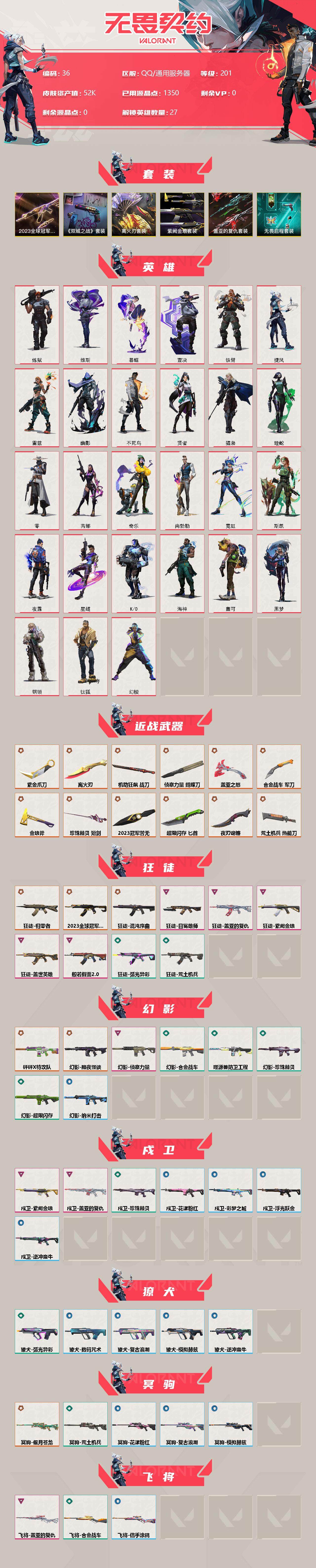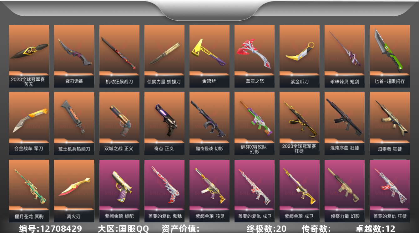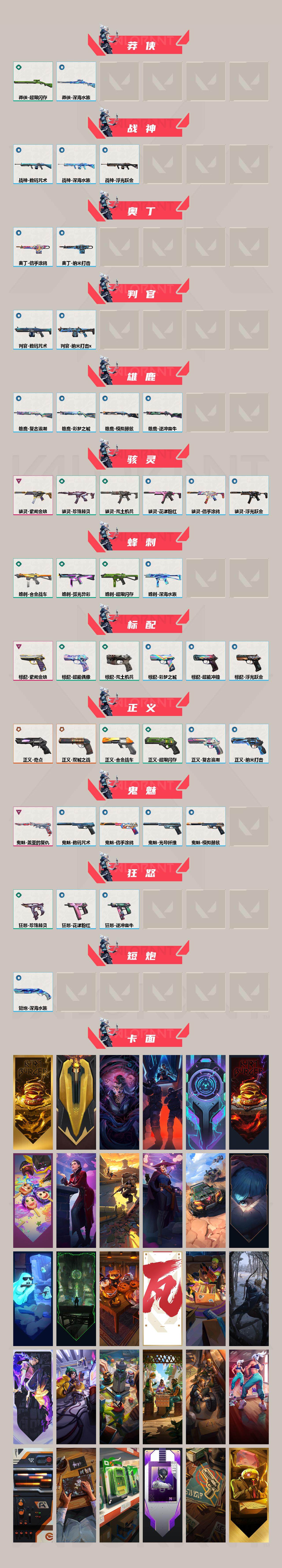 [12708429]【套装】:离火刃套装,2023全球冠军赛套装,离火刃套装,《英雄联盟:双城之战》套装,紫阙金琅套装,盖亚的复仇套装,无畏启程套装 【英雄】:幻棱,炼狱,维斯,暮蝶,钛狐,壹决,铁臂,捷风,雷兹,幽影,不死鸟,贤者,猎枭,蝰蛇,零,芮娜,奇乐,尚勃勒,霓虹,斯凯,夜露,星礈,K/O,海神,盖可,黑梦,钢锁 【近战 武器】:近战武器-2023全球冠军赛 苦无,近战武器-侦察力量 蝴蝶刀,近战武器-紫金爪刀,近战武器-离火刃,近战武器-珍珠棘贝 短剑,近战武器-超限闪存 匕首,近战武器-盖亚之怒,近战武器-合金战车 军刀,近战武器-荒土机兵 热能刀,近战武器-机动狂飙 战刀,近战武器-金琅斧,近战武器-夜刃诡镰 【狂徒】:狂徒-2023全球冠军赛,狂徒-归零者,狂徒-混沌序曲,狂徒-般若假面//2.0,狂徒-盖世英雄,狂徒-盖亚的复仇,狂徒-日冕雄师,狂徒-紫阙金琅,狂徒-弧光异彩,狂徒-荒土机兵 【幻影】:幻影-黯夜怪谈,幻影-砰砰X特攻队,幻影-侦察力量,幻影-超限闪存,幻影-合金战车,幻影-噬源兽防卫工程,幻影-珍珠棘贝,幻影-纳米打击 【戍卫】:戍卫-盖亚的复仇,戍卫-紫阙金琅,戍卫-珍珠棘贝,戍卫-彩梦之城,戍卫-浮光跃金,戍卫-花漾粉红,戍卫-逆冲蛮牛 【獠犬】:獠犬-弧光异彩,獠犬-复古浪潮,獠犬-模拟赫兹,獠犬-逆冲蛮牛,獠犬-数码咒术 【冥驹】:冥驹-偃月苍龙,冥驹-荒土机兵,冥驹-复古浪潮,冥驹-花漾粉红,冥驹-模拟赫兹 【飞将】:飞将-盖亚的复仇,飞将-合金战车,飞将-信手涂鸦 【莽侠】:莽侠-超限闪存,莽侠-深海水族 【战神】:战神-浮光跃金,战神-深海水族,战神-数码咒术 【奥丁】:奥丁-纳米打击,奥丁-信手涂鸦 【判官】:判官-纳米打击x,判官-数码咒术 【雄鹿】:雄鹿-彩梦之城,雄鹿-复古浪潮,雄鹿-模拟赫兹,雄鹿-逆冲蛮牛 【骇灵】:骇灵-紫阙金琅,骇灵-荒土机兵,骇灵-珍珠棘贝,骇灵-浮光跃金,骇灵-花漾粉红,骇灵-信手涂鸦 【蜂刺】:蜂刺-超限闪存,蜂刺-合金战车,蜂刺-弧光异彩,蜂刺-深海水族 【标配】:标配-紫阙金琅,标配-超能偶像,标配-荒土机兵,标配-彩梦之城,标配-超能冲撞,标配-浮光跃金 【正义】:正义-奇点,正义-双城之战,正义-超限闪存,正义-合金战车,正义-复古浪潮,正义-纳米打击 【鬼魅】:鬼魅-盖亚的复仇,鬼魅-