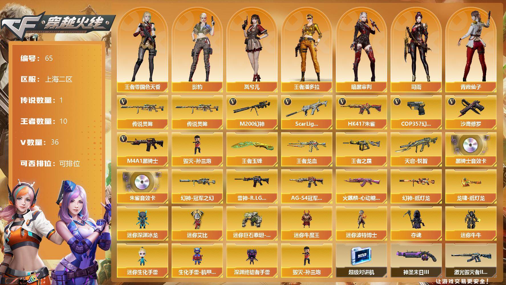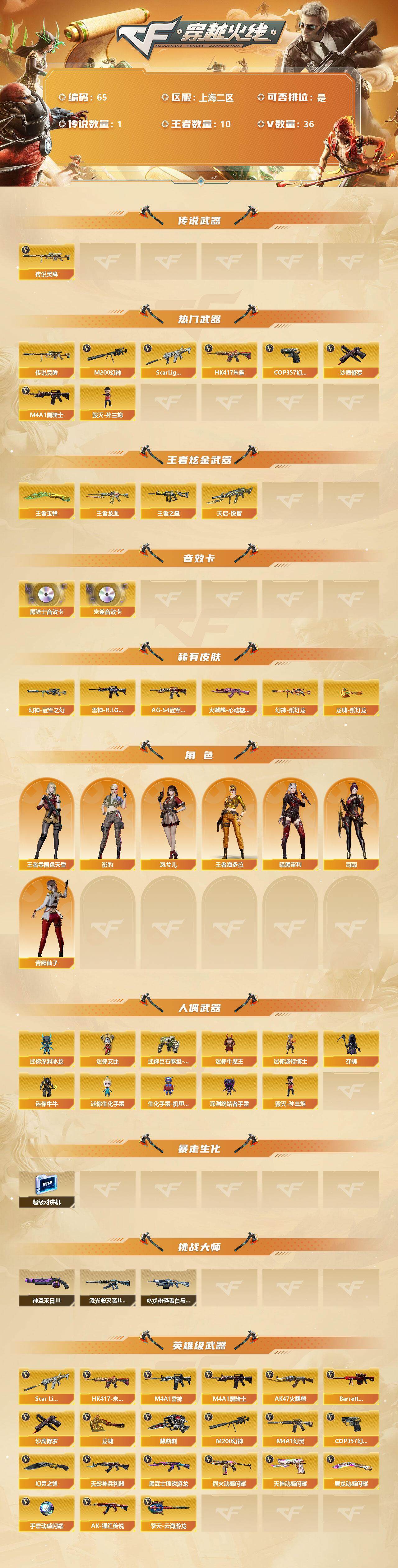 [12709439]上海二区-36V-10王者-0炫金 【传说武器】:传说灵眸 【热门武器】:传说灵眸,Scar Light-白虎,HK417-朱雀,M200-幻神,M4A1-黑骑士,毁灭-孙三炮,COP 357-幻灵,沙鹰-修罗 【王者炫金武器】:天启-悦智,王者之霆,王者龙血,王者玉锋 【音效卡】:M4A1-黑骑士音效卡,HK417-朱雀音效卡 【稀有皮肤】:幻神-冠军之幻,幻神-纸灯龙皮肤,雷神-R.LGD-CFPLS18冠军,火麒麟-心动糖果,黑骑士-AG-S4冠军典藏,龙啸-纸灯龙皮肤 【角色】:王者-零-国色天香,王者潘多拉,影豹,岚兮儿,司雨,暗黑审判,青霞仙子 【人偶武器】:毁灭-孙三炮,迷你深渊冰龙,迷你艾比,迷你巨石泰坦-魔花研究所,迷你牛魔王,迷你波特博士,夺魂,迷你牛牛,迷你生化手雷,生化手雷-机甲核心,深渊终结者手雷 【暴走生化】:超级对讲机 【挑战大师】:神圣爆裂者-末日III,激光毁灭者III-白马银枪,冰龙粉碎者-白马银枪 【英雄级武器】:M4A1-幻灵,COP 357-幻灵,幻灵之锋,烈火-动感闪耀,天神-动感闪耀,屠龙-动感闪耀,手雷-动感闪耀,Scar Light-白虎,HK417-朱雀,无影-神兵利器,M4A1-雷神,M4A1-黑骑士,AK47-火麒麟,Barrett-极光,M200-幻神,黑武士-锦绣游龙,AK-47-猩红传说,沙鹰-修罗,麒麟刺,龙啸*2,擎天-云海游龙 【特殊枪械】:1白虎,1黑骑士