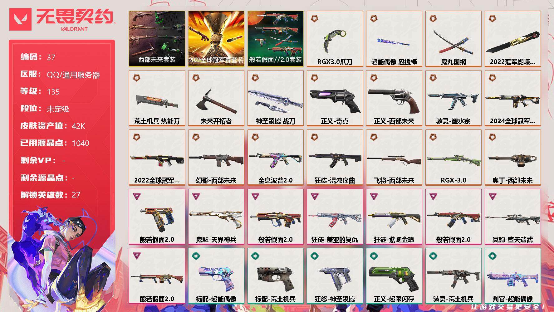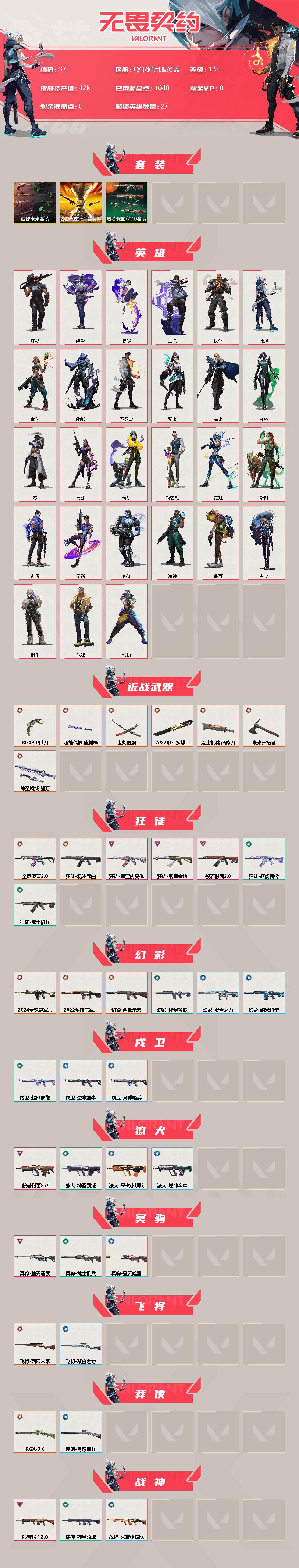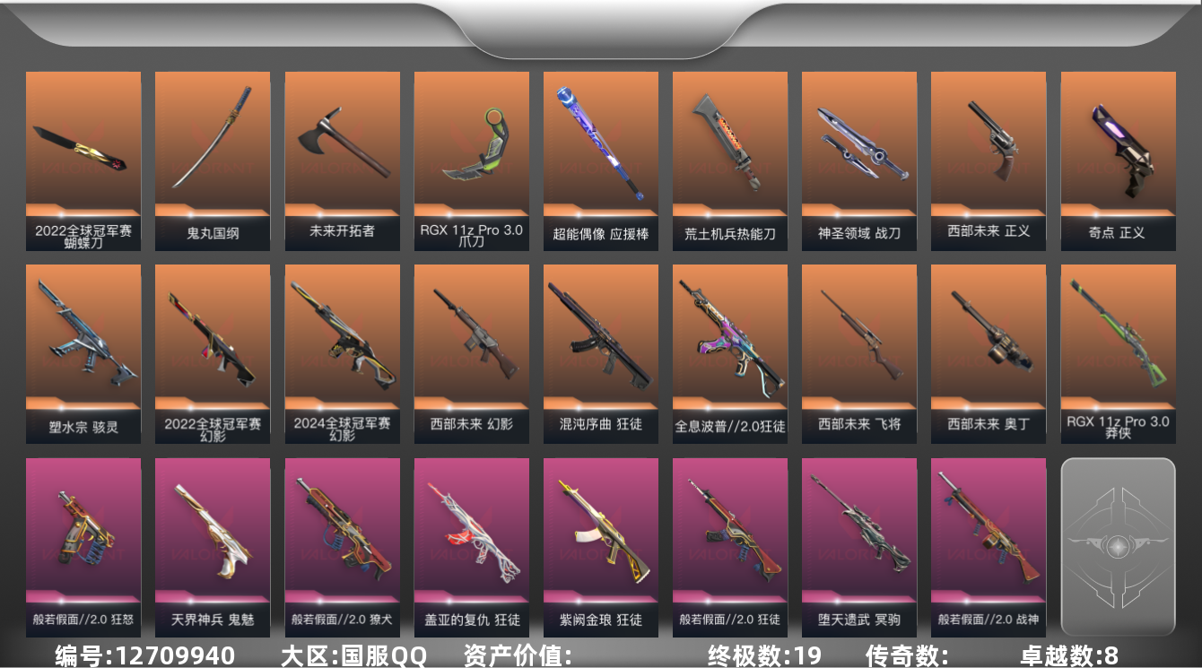 [12709940]【套装】:2022全球冠军赛套装,西部未来套装,般若假面//2.0套装 【英雄】:幻棱,炼狱,维斯,暮蝶,钛狐,壹决,铁臂,捷风,雷兹,幽影,不死鸟,贤者,猎枭,蝰蛇,零,芮娜,奇乐,尚勃勒,霓虹,斯凯,夜露,星礈,K/O,海神,盖可,黑梦,钢锁 【近战 武器】:近战武器-2022全球冠军赛 蝴蝶刀,近战武器-RGX 11z Pro//3.0 爪刀,近战武器-鬼丸国纲,近战武器-未来开拓者,近战武器-超能偶像 应援棒,近战武器-荒土机兵 热能刀,近战武器-神圣领域 战刀 【狂徒】:狂徒-混沌序曲,狂徒-全息波普//2.0,狂徒-般若假面//2.0,狂徒-盖亚的复仇,狂徒-紫阙金琅,狂徒-超能偶像,狂徒-荒土机兵 【幻影】:幻影-2022全球冠军赛,幻影-2024全球冠军赛,幻影-西部未来,幻影-神圣领域,幻影-聚合之力,幻影-纳米打击,幻影-西部未来 【戍卫】:戍卫-超能偶像,戍卫-逆冲蛮牛,戍卫-月球哨兵 【獠犬】:獠犬-般若假面//2.0,獠犬-神圣领域,獠犬-采蜜小蜂队,獠犬-逆冲蛮牛 【冥驹】:冥驹-堕天遗武,冥驹-荒土机兵,冥驹-星云暗涌 【飞将】:飞将-西部未来,飞将-聚合之力 【莽侠】:莽侠-RGX 11z Pro//3.0,莽侠-月球哨兵 【战神】:战神-般若假面//2.0,战神-神圣领域,战神-采蜜小蜂队 【奥丁】:奥丁-西部未来,奥丁-纳米打击 【判官】:判官-超能偶像,判官-采蜜小蜂队,判官-纳米打击x 【雄鹿】:雄鹿-逆冲蛮牛,雄鹿-月球哨兵 【骇灵】:骇灵-塑水宗,骇灵-荒土机兵,骇灵-星云暗涌 【蜂刺】:蜂刺-聚合之力,蜂刺-星云暗涌 【标配】:标配-超能偶像,标配-荒土机兵 【正义】:正义-奇点,正义-西部未来,正义-超限闪存,正义-纳米打击,正义-月球哨兵 【鬼魅】:鬼魅-天界神兵,鬼魅-采蜜小蜂队,鬼魅-星云暗涌 【狂怒】:狂怒-般若假面//2.0,狂怒-神圣领域,狂怒-聚合之力,狂怒-逆冲蛮牛 【卡面】:终章:激斗汉堡 卡面,进入射程 卡面,分崩离析 卡面,纳米打击 卡面,抑制技术 卡面,激斗汉堡 卡面,瓦娃脸雪糕 P2 卡面,从黄昏到黎明 卡面,荒土机兵 卡面,银弹猎手 卡面,逆冲蛮牛 卡面,《双城之战》拥抱 卡面,精灵大战 卡面,欢迎来到底城 卡面,南瓜盛典 卡面,修车达人 卡面,正义的化身 卡面,终章:生意人麦宝 卡面,铁