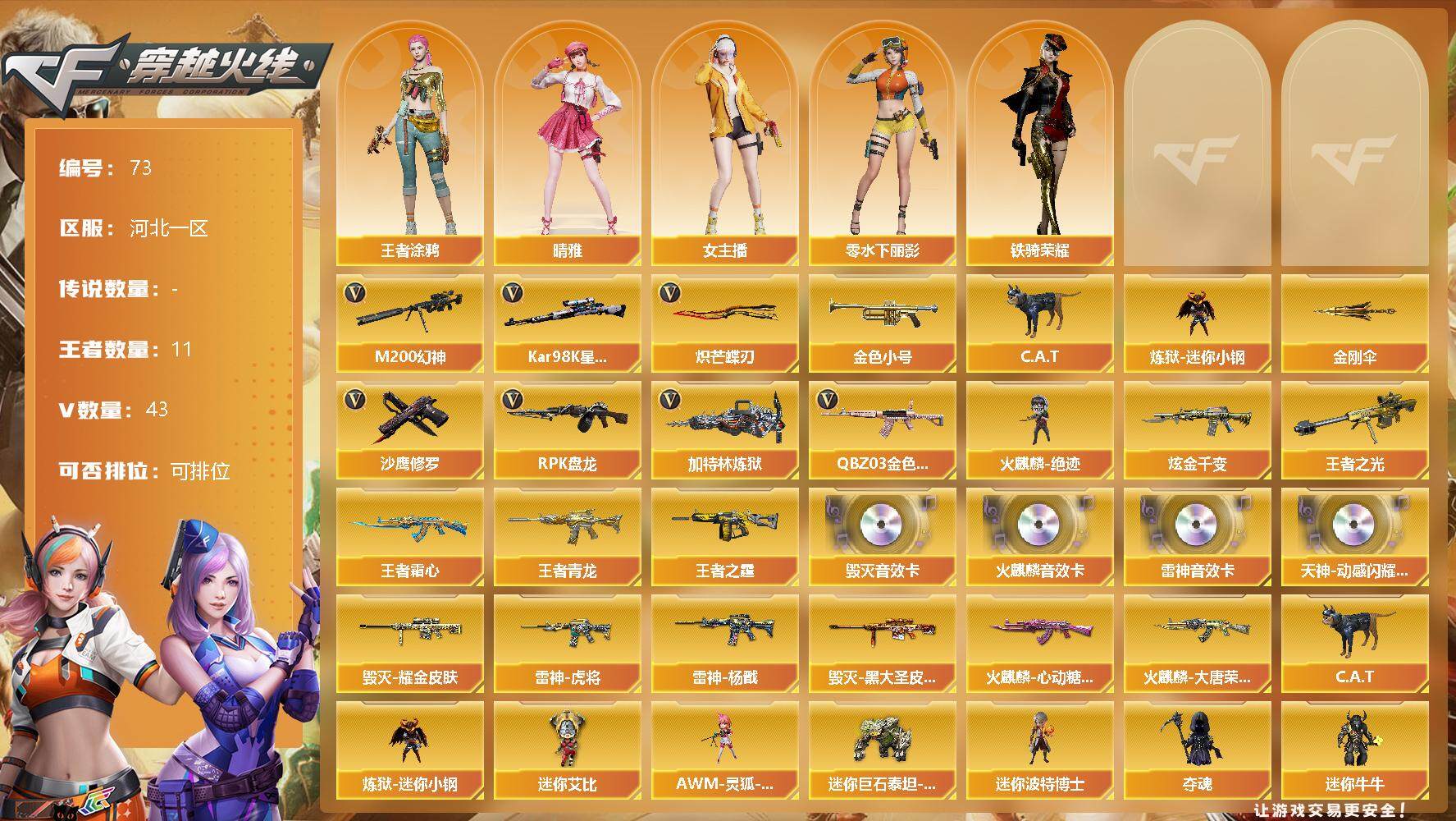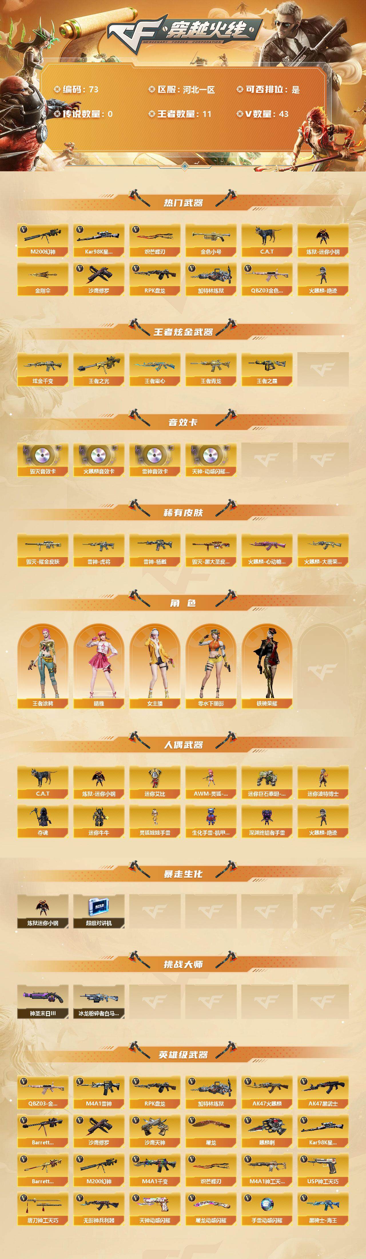 [12710127]河北一区-43V-11王者-1炫金 【热门武器】:QBZ03-金色蔷薇,M200-幻神,Kar98K-星神,金色小号,C.A.T,炼狱-迷你小钢,RPK-盘龙,加特林-炼狱,火麒麟-绝迹,沙鹰-修罗,炽芒蝶刃,金刚伞 【王者炫金武器】:炫金千变,王者之光,王者青龙,王者之霆,王者霜心 【音效卡】:天神-动感闪耀 音效卡,AK47-火麒麟音效卡,M4A1-雷神音效卡,Barrett-毁灭音效卡 【稀有皮肤】:雷神-虎将,雷神-杨戬,火麒麟-大唐荣光,火麒麟-心动糖果,毁灭耀金皮肤,毁灭-黑大圣皮肤 【角色】:王者涂鸦,零-水下丽影,晴雅,女主播,铁骑荣耀 【人偶武器】:火麒麟-绝迹,AWM-灵狐-15周年嘉年华,C.A.T,炼狱-迷你小钢,迷你艾比,迷你巨石泰坦-魔花研究所,迷你波特博士,夺魂,迷你牛牛*2,灵狐娃娃手雷,生化手雷-机甲核心,深渊终结者手雷 【暴走生化】:炼狱-迷你小钢,超级对讲机 【挑战大师】:神圣爆裂者-末日III,冰龙粉碎者-白马银枪 【英雄级武器】:M4A1-神工天巧,USP-神工天巧,唐刀-神工天巧*2,天神-动感闪耀,屠龙-动感闪耀,手雷-动感闪耀,QBZ03-金色蔷薇,无影-神兵利器,M4A1-雷神,RPK-盘龙,加特林-炼狱,AK47-火麒麟*2,AK47-黑武士,Barrett-毁灭*2,Kar98K-星神,Barrett-朱雀,M200-幻神,M4A1-千变,黑骑士-海王,沙鹰-天神,沙鹰-修罗,炽芒蝶刃,麒麟刺*2,屠龙*2 【特殊枪械】:1盘龙,1炼狱