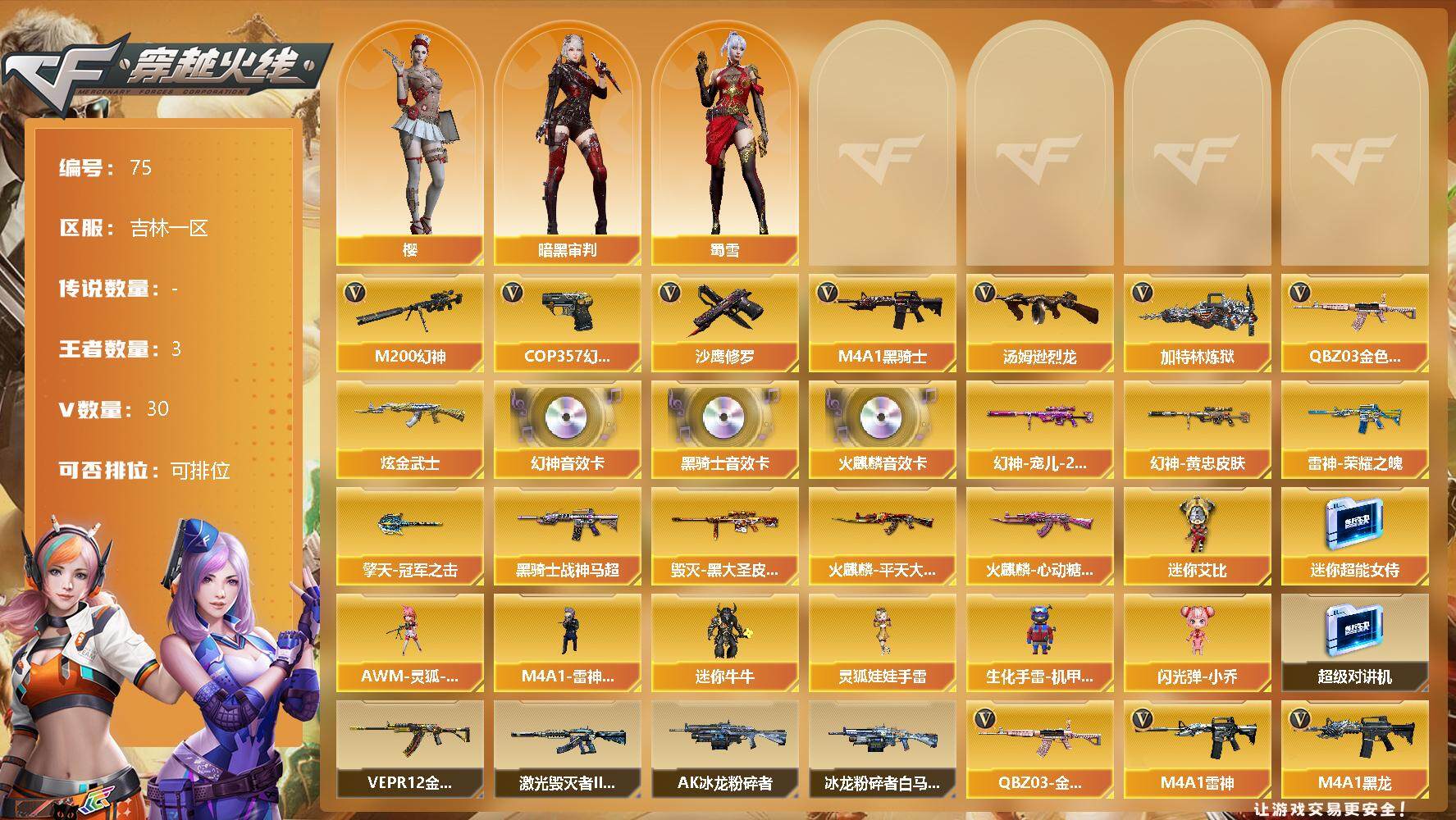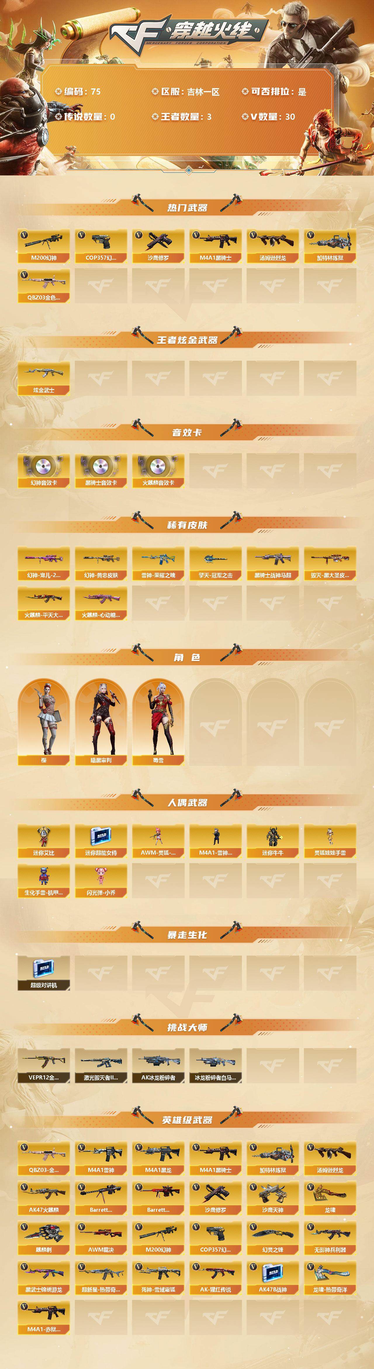 [12710271]吉林一区-30V-3王者-1炫金 【热门武器】:QBZ03-金色蔷薇,M200-幻神,M4A1-黑骑士,汤姆逊-烈龙*2,加特林-炼狱,COP 357-幻灵,沙鹰-修罗 【王者炫金武器】:炫金武士 【音效卡】:M200-幻神音效卡,AK47-火麒麟音效卡*2,M4A1-黑骑士音效卡 【稀有皮肤】:M200-幻神-黄忠皮肤,幻神-宠儿-2021MVP,雷神-荣耀之魄,火麒麟-平天大圣,火麒麟-心动糖果,黑骑士-战神马超,毁灭-黑大圣皮肤,擎天-冠军之击 【角色】:樱,蜀雪,暗黑审判 【人偶武器】:AWM-灵狐-15周年嘉年华*2,M4A1-雷神-精英刀锋,迷你艾比,迷你超能女侍,迷你牛牛,灵狐娃娃手雷,生化手雷-机甲核心,闪光弹-小乔 【暴走生化】:超级对讲机 【挑战大师】:VEPR-12-金魔,激光毁灭者III-白马银枪,AK47-冰龙粉碎者,冰龙粉碎者-白马银枪 【英雄级武器】:COP 357-幻灵,幻灵之锋,QBZ03-金色蔷薇,无影-神兵利器,M4A1-雷神,M4A1-黑龙,M4A1-黑骑士,加特林-炼狱,汤姆逊-烈龙*2,AK47-火麒麟,Barrett-毁灭,Barrett-极光,AWM-裁决,M200-幻神,黑武士-锦绣游龙,超新星-热带奇洋,死神-雪域霜狐,AK-47-猩红传说*5,AK47-B-战神,M4A1-赤狱骑士,沙鹰-天神,沙鹰-修罗,麒麟刺,龙啸,龙啸-热带奇洋 【特殊枪械】:1黑骑士,2烈龙,1炼狱
