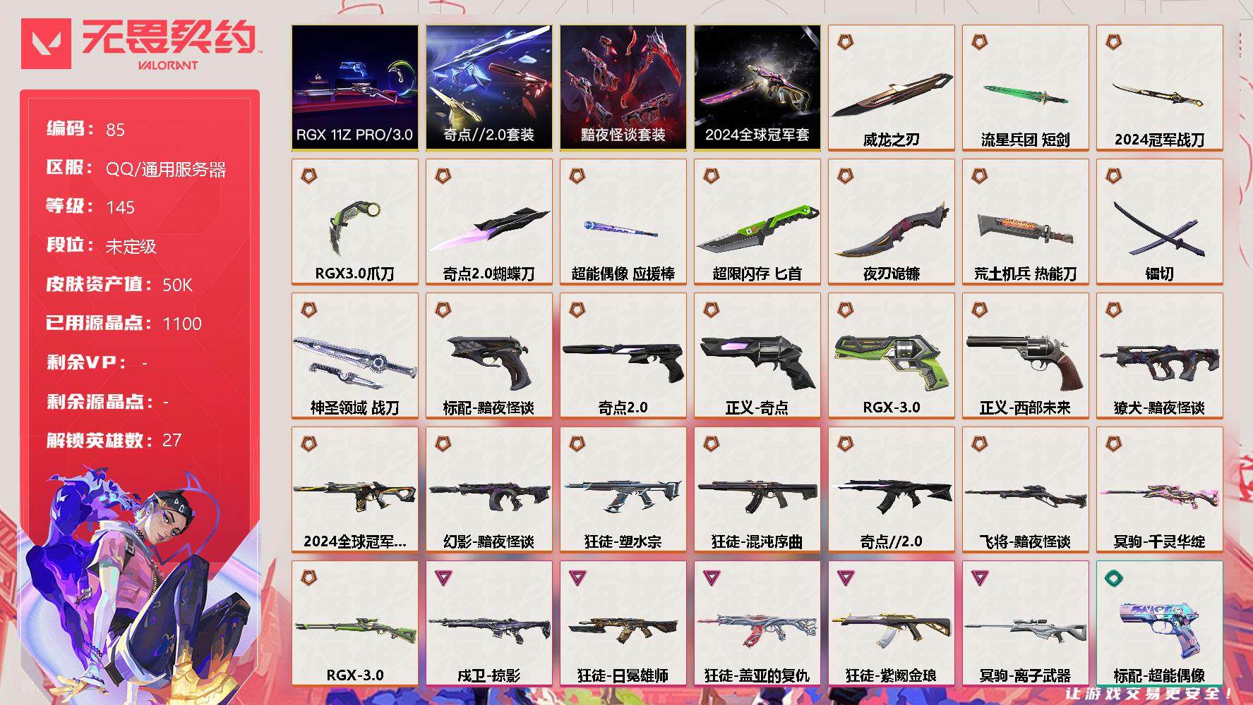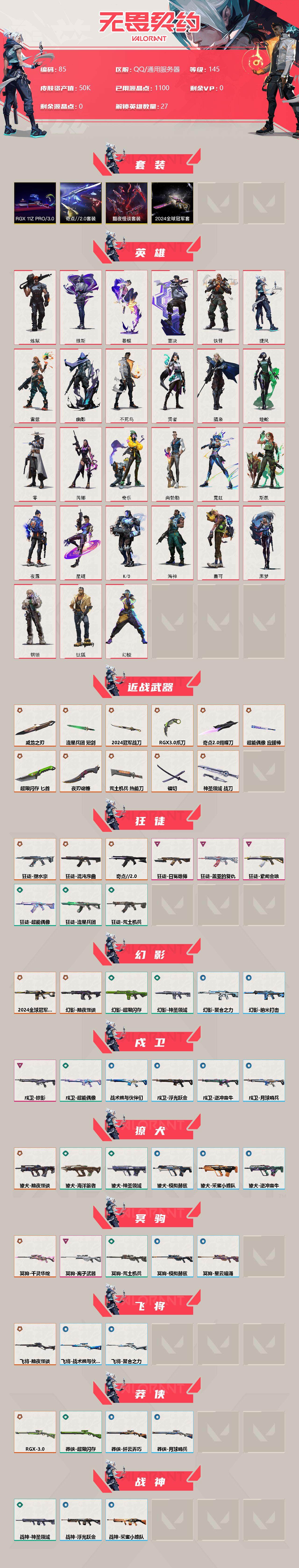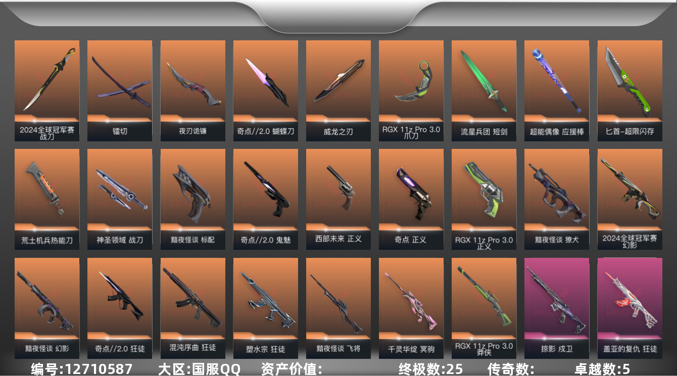 [12710587]【套装】:2024全球冠军赛套装,RGX 11z Pro//3.0套装,奇点//2.0套装,黯夜怪谈套装 【英雄】:幻棱,炼狱,维斯,暮蝶,钛狐,壹决,铁臂,捷风,雷兹,幽影,不死鸟,贤者,猎枭,蝰蛇,零,芮娜,奇乐,尚勃勒,霓虹,斯凯,夜露,星礈,K/O,海神,盖可,黑梦,钢锁 【近战 武器】:近战武器-2024全球冠军赛 战刀,近战武器-奇点//2.0 蝴蝶刀,近战武器-RGX 11z Pro//3.0 爪刀,近战武器-镭切,近战武器-威龙之刃,近战武器-流星兵团 短剑,近战武器-超能偶像 应援棒,近战武器-超限闪存 匕首,近战武器-荒土机兵 热能刀,近战武器-夜刃诡镰,近战武器-神圣领域 战刀 【狂徒】:狂徒-混沌序曲,狂徒-奇点//2.0,狂徒-塑水宗,狂徒-盖亚的复仇,狂徒-日冕雄师,狂徒-紫阙金琅,狂徒-超能偶像,狂徒-荒土机兵,狂徒-流星兵团 【幻影】:幻影-2024全球冠军赛,幻影-黯夜怪谈,幻影-超限闪存,幻影-神圣领域,幻影-聚合之力,幻影-纳米打击 【戍卫】:戍卫-掠影,戍卫-超能偶像,戍卫-浮光跃金,戍卫-逆冲蛮牛,戍卫-战术熊与伙伴们,戍卫-月球哨兵 【獠犬】:獠犬-黯夜怪谈,獠犬-海洋旅者,獠犬-神圣领域,獠犬-采蜜小蜂队,獠犬-模拟赫兹,獠犬-逆冲蛮牛 【冥驹】:冥驹-千灵华绽,冥驹-离子武器,冥驹-荒土机兵,冥驹-模拟赫兹,冥驹-星云暗涌 【飞将】:飞将-黯夜怪谈,飞将-聚合之力,飞将-战术熊与伙伴们 【莽侠】:莽侠-RGX 11z Pro//3.0,莽侠-超限闪存,莽侠-纤云弄巧,莽侠-月球哨兵 【战神】:战神-神圣领域,战神-采蜜小蜂队,战神-浮光跃金 【奥丁】:奥丁-流星兵团,奥丁-纳米打击 【判官】:判官-超能偶像,判官-采蜜小蜂队,判官-纳米打击x 【雄鹿】:雄鹿-模拟赫兹,雄鹿-逆冲蛮牛,雄鹿-月球哨兵 【骇灵】:骇灵-荒土机兵,骇灵-流星兵团,骇灵-浮光跃金,骇灵-星云暗涌 【蜂刺】:蜂刺-超限闪存,蜂刺-聚合之力,蜂刺-纤云弄巧,蜂刺-星云暗涌 【标配】:标配-黯夜怪谈,标配-超能偶像,标配-荒土机兵,标配-浮光跃金,标配-战术熊与伙伴们 【正义】:正义-RGX 11z Pro//3.0,正义-奇点,正义-西部未来,正义-超限闪存,正义-纳米打击,正义-纤云弄巧,正义-月球哨兵 【鬼魅】:鬼魅-奇点//2.0,鬼魅-