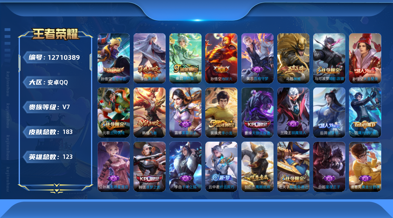 [12710389]安卓Q-V7-至尊星耀V段位-122英雄-181皮肤-1典藏-0珍品无双-0无双-0珍品传说-3传说-41史诗