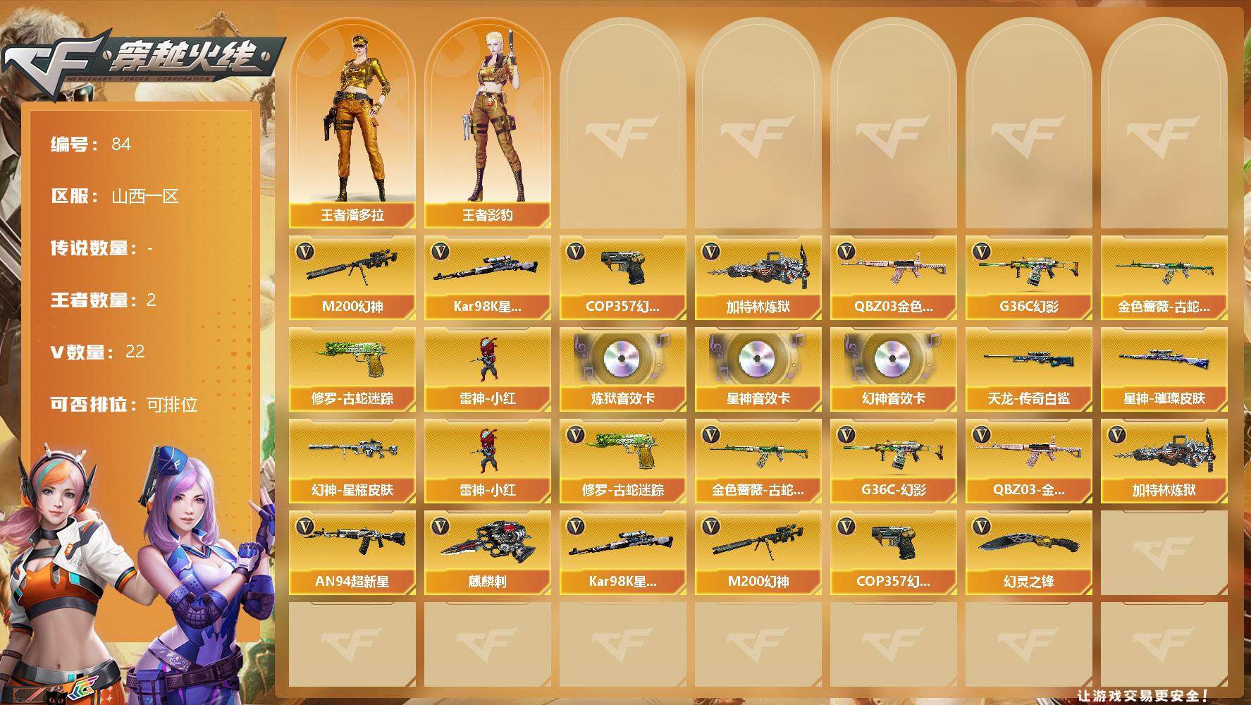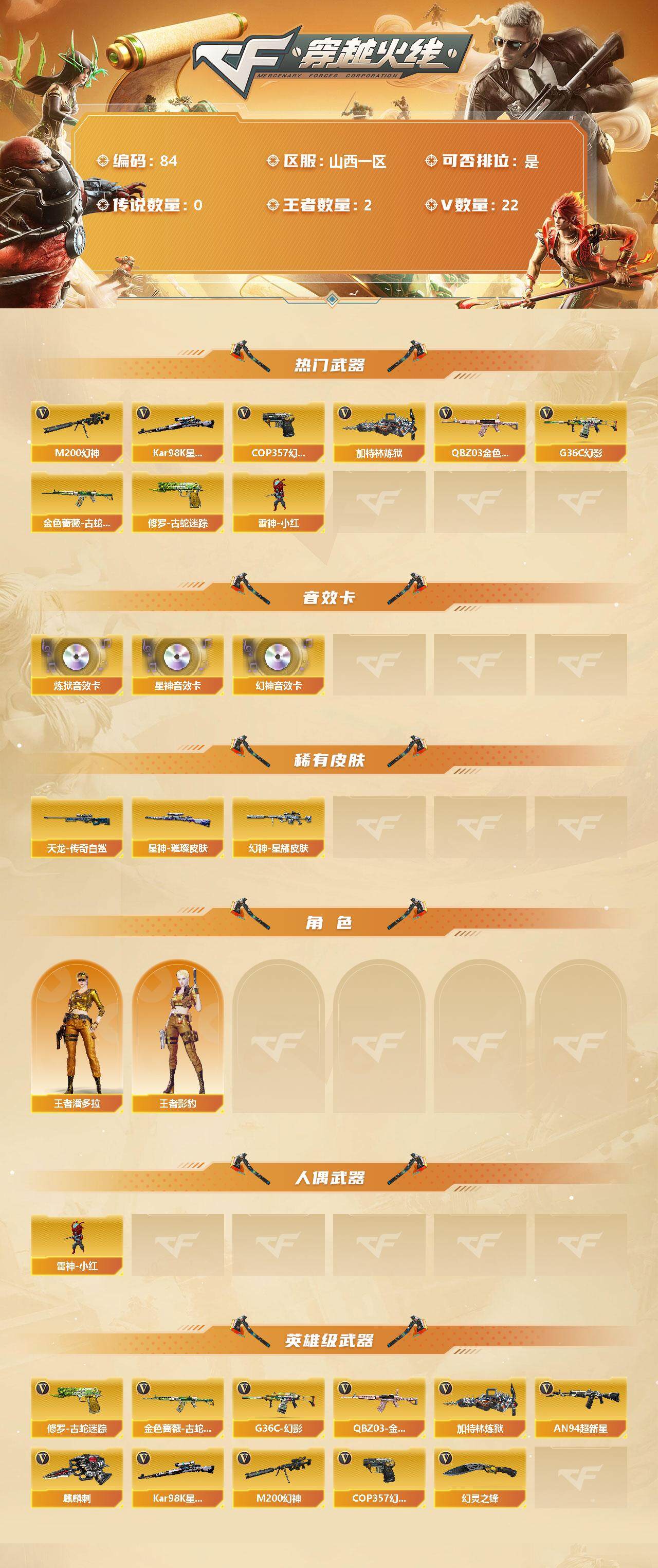 [12710743]山西一区-22V-2王者-0炫金 【热门武器】:G36C-幻影,QBZ03-金色蔷薇,M200-幻神,金色蔷薇-古蛇迷踪,修罗-古蛇迷踪,Kar98K-星神,加特林-炼狱*3,雷神-小红,COP 357-幻灵*2 【音效卡】:M200-幻神音效卡,Kar98K-星神音效卡,加特林-炼狱音效卡 【稀有皮肤】:幻神-星耀 皮肤,星神-璀璨皮肤,AWM-天龙-传奇白鲨 【角色】:王者影豹,王者潘多拉 【人偶武器】:雷神-小红 【英雄级武器】:COP 357-幻灵*2,幻灵之锋,G36C-幻影,QBZ03-金色蔷薇,金色蔷薇-古蛇迷踪,加特林-炼狱*3,AN94-超新星,Kar98K-星神,M200-幻神,修罗-古蛇迷踪,麒麟刺 【特殊枪械】:3炼狱