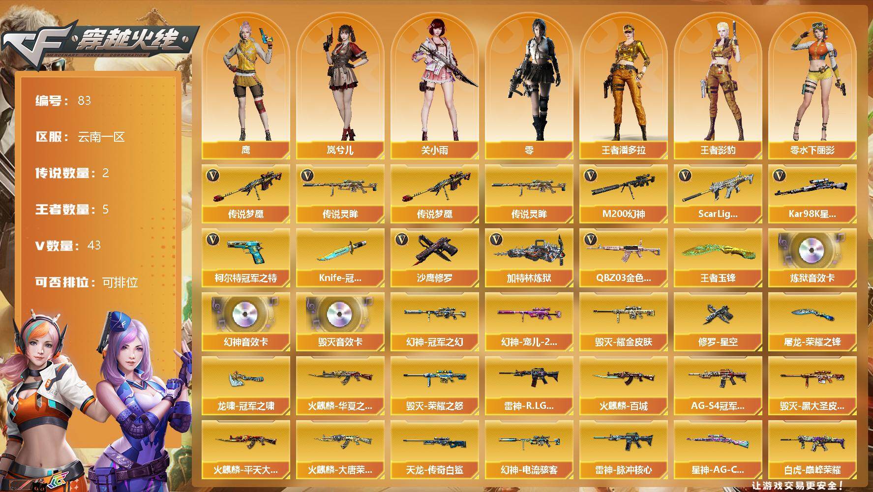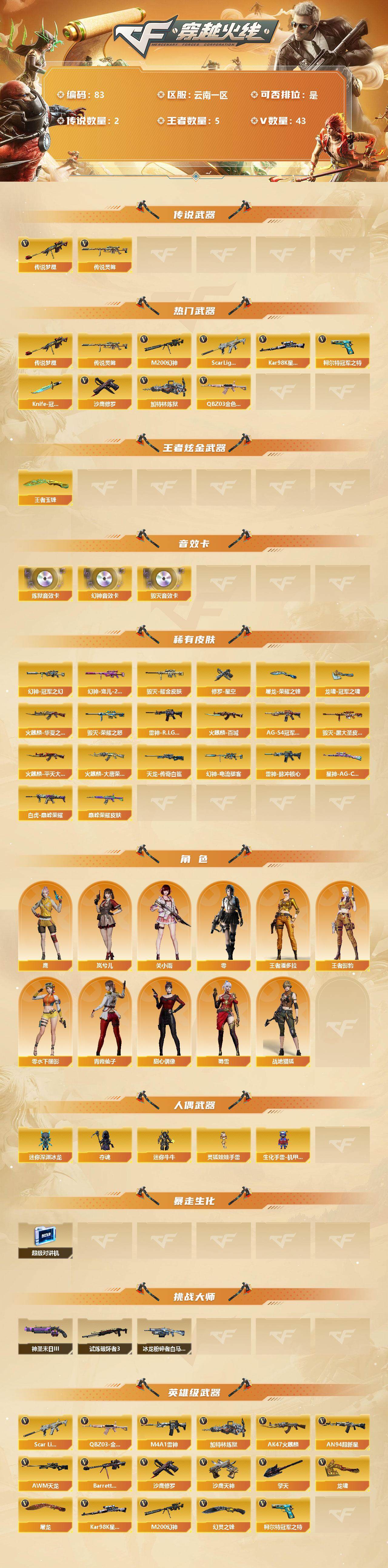 [12710716]云南一区-43V-5王者-0炫金 【传说武器】:传说梦魇,传说灵眸 【热门武器】:传说梦魇,传说灵眸,QBZ03-金色蔷薇,Scar Light-白虎,M200-幻神,柯尔特-冠军之特,Kar98K-星神,加特林-炼狱,沙鹰-修罗*2,Knife-冠军之刃*2 【王者炫金武器】:王者玉锋 【音效卡】:M200-幻神音效卡,Barrett-毁灭音效卡,加特林-炼狱音效卡 【稀有皮肤】:幻神-冠军之幻,幻神-宠儿-2021MVP,幻神-电流骇客 皮肤,Kar98K-星神-AG-CFPLS21冠军皮肤,白虎-巅峰荣耀 皮肤,QBZ03-巅峰荣耀皮肤,雷神-R.LGD-CFPLS18冠军,雷神-脉冲核心,火麒麟-华夏之心,火麒麟-平天大圣,火麒麟-百城,火麒麟-大唐荣光,黑骑士-AG-S4冠军典藏,毁灭-荣耀之怒,毁灭耀金皮肤,毁灭-黑大圣皮肤,AWM-天龙-传奇白鲨,修罗-星空,屠龙-荣耀之锋,龙啸-冠军之啸 【角色】:王者影豹,王者潘多拉,零-水下丽影,零,鹰,关小雨,岚兮儿,战地猎狐,蜀雪,青霞仙子,甜心偶像 【人偶武器】:迷你深渊冰龙,夺魂*2,迷你牛牛*2,灵狐娃娃手雷*2,生化手雷-机甲核心 【暴走生化】:超级对讲机 【挑战大师】:神圣爆裂者-末日III,试炼破坏者III,冰龙粉碎者-白马银枪 【英雄级武器】:幻灵之锋,QBZ03-金色蔷薇,Scar Light-白虎,M4A1-雷神*2,加特林-炼狱,AK47-火麒麟,AN94-超新星*2,AWM-天龙,Barrett-毁灭,Kar98K-星神,M200-幻神,柯尔特-冠军之特,沙鹰-天神,沙鹰-修罗*2,擎天,龙啸,屠龙*2 【特殊枪械】:1白虎,1炼狱