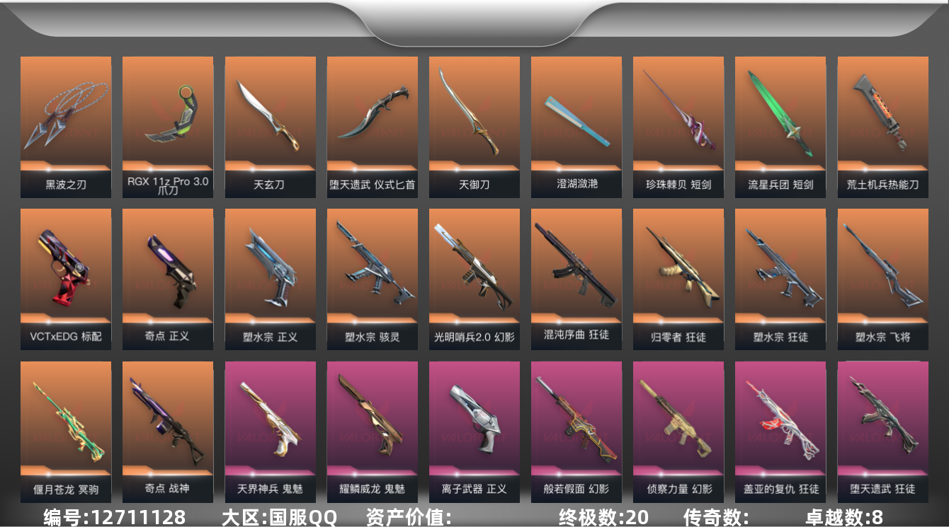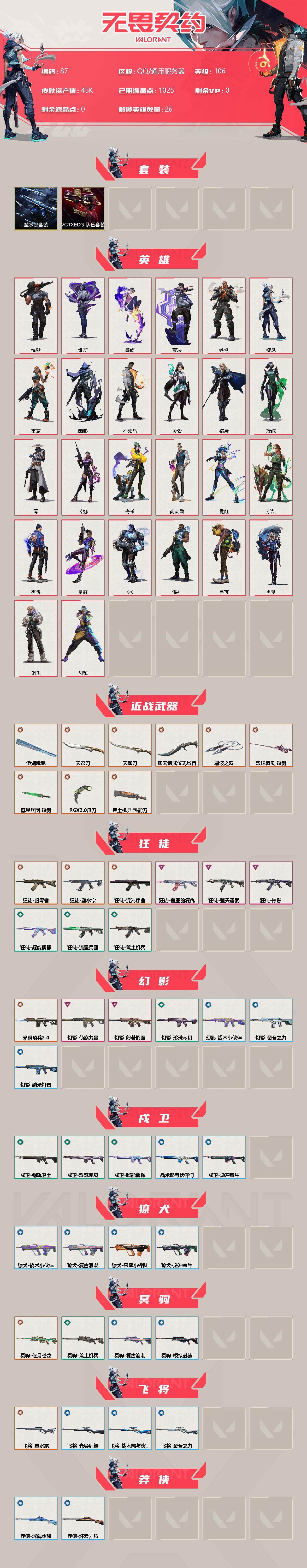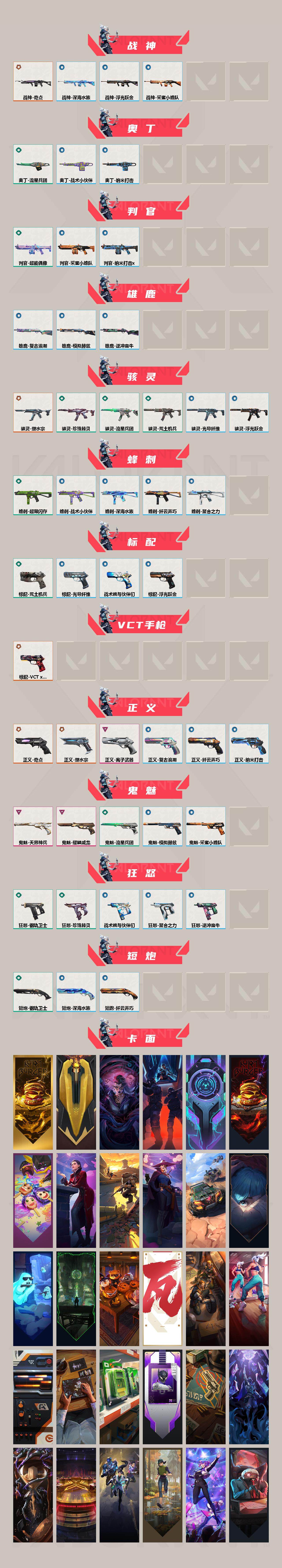 [12711128]【套装】:塑水宗套装,VCTxEDG 队伍套装 【英雄】:幻棱,炼狱,维斯,暮蝶,壹决,铁臂,捷风,雷兹,幽影,不死鸟,贤者,猎枭,蝰蛇,零,芮娜,奇乐,尚勃勒,霓虹,斯凯,夜露,星礈,K/O,海神,盖可,黑梦,钢锁 【近战 武器】:近战武器-RGX 11z Pro//3.0 爪刀,近战武器-黑波之刃,近战武器-澄湖潋滟,近战武器-珍珠棘贝 短剑,近战武器-流星兵团 短剑,近战武器-堕天遗武 仪式匕首,近战武器-荒土机兵 热能刀,近战武器-天玄刀,近战武器-天御刀 【狂徒】:狂徒-归零者,狂徒-混沌序曲,狂徒-塑水宗,狂徒-堕天遗武,狂徒-掠影,狂徒-盖亚的复仇,狂徒-超能偶像,狂徒-荒土机兵,狂徒-流星兵团 【幻影】:幻影-光明哨兵//2.0,幻影-般若假面,幻影-侦察力量,幻影-珍珠棘贝,幻影-聚合之力,幻影-纳米打击,幻影-战术小伙伴 【戍卫】:戍卫-超能偶像,戍卫-钢轨卫士,戍卫-珍珠棘贝,戍卫-逆冲蛮牛,戍卫-战术熊与伙伴们 【獠犬】:獠犬-采蜜小蜂队,獠犬-复古浪潮,獠犬-逆冲蛮牛,獠犬-战术小伙伴 【冥驹】:冥驹-偃月苍龙,冥驹-荒土机兵,冥驹-复古浪潮,冥驹-模拟赫兹 【飞将】:飞将-塑水宗,飞将-聚合之力,飞将-光导纤维,飞将-战术熊与伙伴们 【莽侠】:莽侠-深海水族,莽侠-纤云弄巧 【战神】:战神-奇点,战神-采蜜小蜂队,战神-浮光跃金,战神-深海水族 【奥丁】:奥丁-流星兵团,奥丁-纳米打击,奥丁-战术小伙伴 【判官】:判官-超能偶像,判官-采蜜小蜂队,判官-纳米打击x 【雄鹿】:雄鹿-复古浪潮,雄鹿-模拟赫兹,雄鹿-逆冲蛮牛 【骇灵】:骇灵-塑水宗,骇灵-荒土机兵,骇灵-流星兵团,骇灵-珍珠棘贝,骇灵-浮光跃金,骇灵-光导纤维 【蜂刺】:蜂刺-超限闪存,蜂刺-聚合之力,蜂刺-深海水族,蜂刺-纤云弄巧,蜂刺-战术小伙伴 【标配】:标配-荒土机兵,标配-浮光跃金,标配-光导纤维,标配-战术熊与伙伴们 【VCT手枪】:标配-VCT x EDG 【正义】:正义-奇点,正义-塑水宗,正义-离子武器,正义-复古浪潮,正义-纳米打击,正义-纤云弄巧 【鬼魅】:鬼魅-天界神兵,鬼魅-耀鳞威龙,鬼魅-流星兵团,鬼魅-采蜜小蜂队,鬼魅-模拟赫兹 【狂怒】:狂怒-钢轨卫士,狂怒-珍珠棘贝,狂怒-聚合之力,狂怒-逆冲蛮牛,狂怒-战术熊与伙伴们 【短炮】:短炮-钢轨