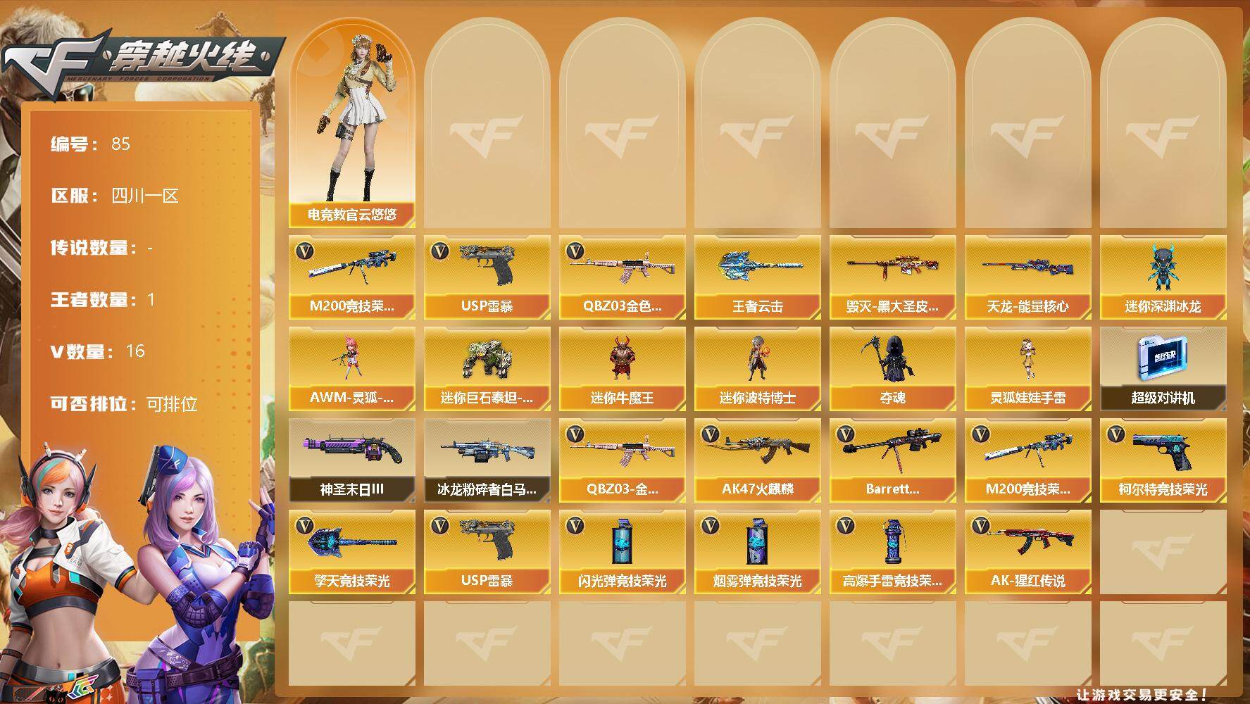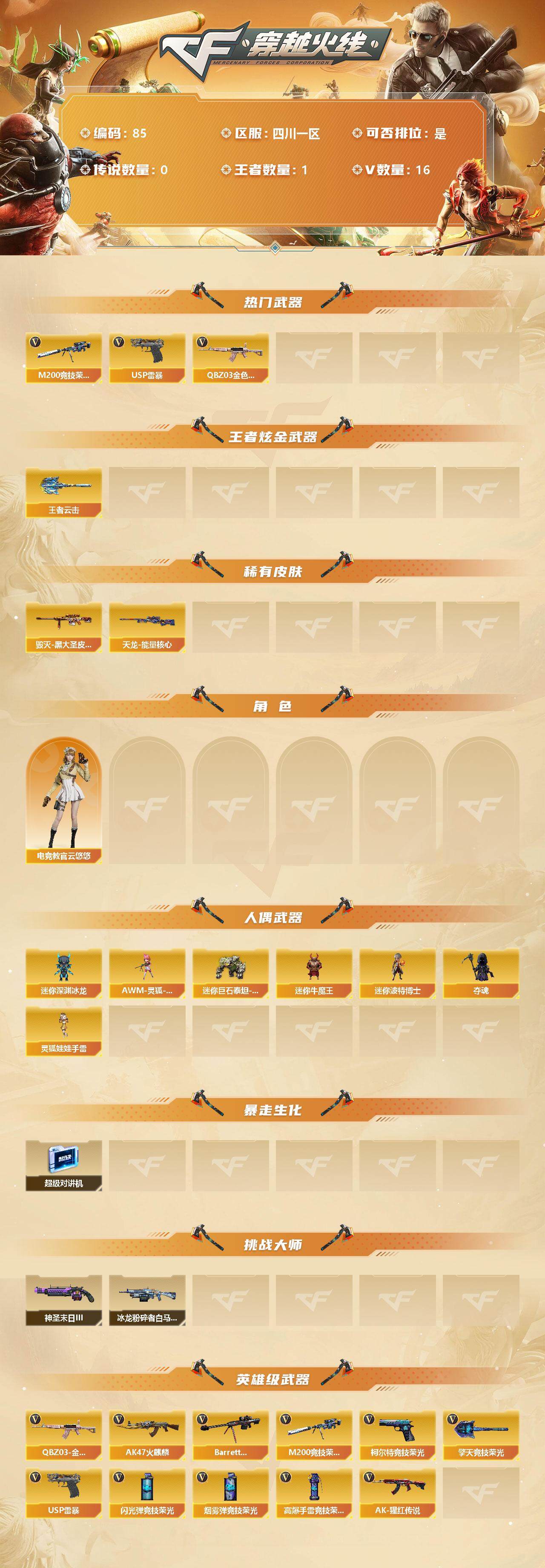 [12711556]四川一区-16V-1王者-0炫金 【热门武器】:QBZ03-金色蔷薇,M200-竞技荣光,USP-雷暴 【王者炫金武器】:王者云击 【稀有皮肤】:毁灭-黑大圣皮肤,天龙-能量核心 【角色】:电竞教官-云悠悠 【人偶武器】:AWM-灵狐-15周年嘉年华,迷你深渊冰龙,迷你巨石泰坦-魔花研究所,迷你牛魔王,迷你波特博士,夺魂,灵狐娃娃手雷 【暴走生化】:超级对讲机 【挑战大师】:神圣爆裂者-末日III,冰龙粉碎者-白马银枪*2 【英雄级武器】:M200-竞技荣光,柯尔特-竞技荣光,擎天-竞技荣光,高爆手雷-竞技荣光*2,烟雾弹-竞技荣光*4,闪光弹-竞技荣光,USP-雷暴,QBZ03-金色蔷薇,AK47-火麒麟,Barrett-毁灭,AK-47-猩红传说 【特殊枪械】: