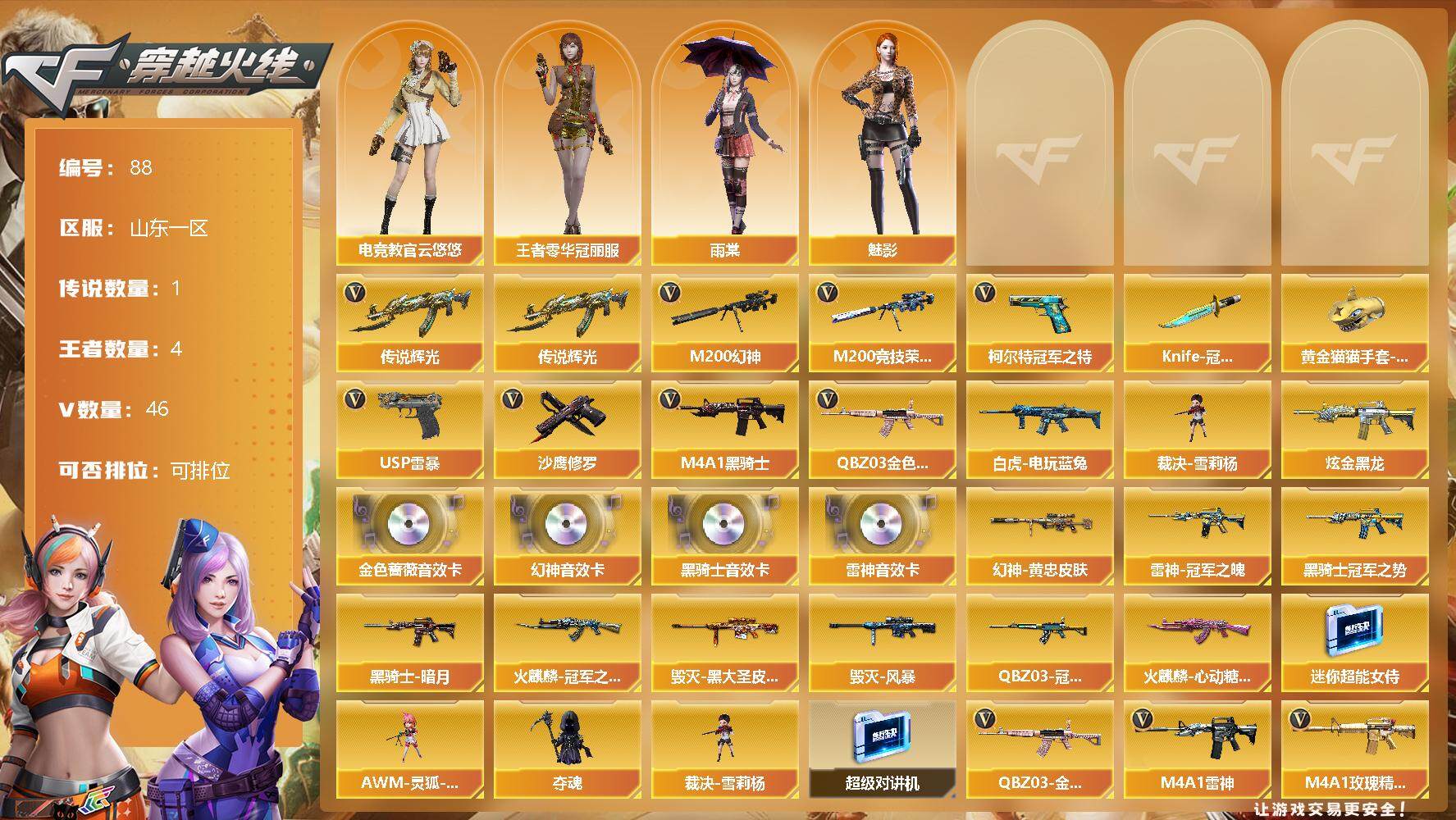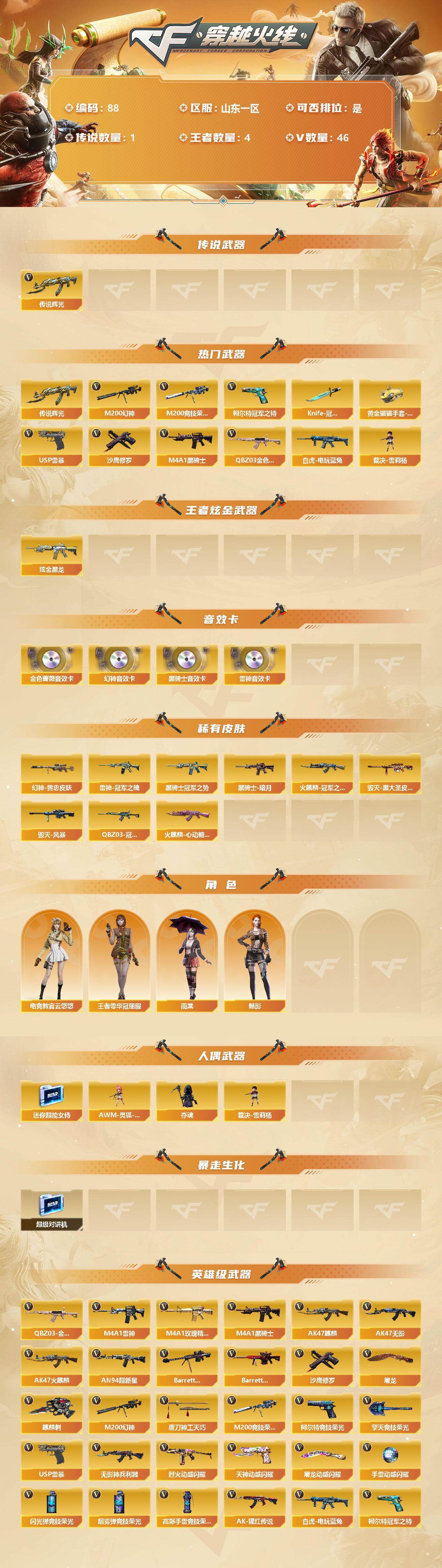 [12711720]山东一区-46V-4王者-1炫金 【传说武器】:传说辉光 【热门武器】:传说辉光,QBZ03-金色蔷薇,M200-幻神,M200-竞技荣光,白虎-电玩蓝兔,柯尔特-冠军之特,M4A1-黑骑士,裁决-雪莉杨,USP-雷暴,沙鹰-修罗,Knife-冠军之刃,黄金猫猫手套-白鲨 【王者炫金武器】:炫金黑龙 【音效卡】:M200-幻神音效卡,M4A1-雷神音效卡,M4A1-黑骑士音效卡,QBZ03-金色蔷薇音效卡 【稀有皮肤】:M200-幻神-黄忠皮肤,QBZ03-冠军之薇,雷神-冠军之魄,火麒麟-冠军之心,火麒麟-心动糖果,黑骑士-暗月,黑骑士-冠军之势,毁灭-黑大圣皮肤,毁灭-风暴 【角色】:王者零-华冠丽服,魅影,雨棠,电竞教官-云悠悠 【人偶武器】:裁决-雪莉杨,AWM-灵狐-15周年嘉年华,迷你超能女侍,夺魂 【暴走生化】:超级对讲机 【英雄级武器】:唐刀-神工天巧,M200-竞技荣光,柯尔特-竞技荣光*2,擎天-竞技荣光,高爆手雷-竞技荣光,烟雾弹-竞技荣光,闪光弹-竞技荣光,USP-雷暴,烈火-动感闪耀,天神-动感闪耀,屠龙-动感闪耀,手雷-动感闪耀,QBZ03-金色蔷薇,白虎-电玩蓝兔,无影-神兵利器,M4A1-雷神,M4A1-玫瑰精灵,M4A1-黑骑士,AK47-麒麟,AK47-无影,AK47-火麒麟,AN94-超新星,Barrett-毁灭,Barrett-极光,M200-幻神,AK-47-猩红传说*2,柯尔特-冠军之特,沙鹰-修罗,麒麟刺,屠龙 【特殊枪械】:1黑骑士