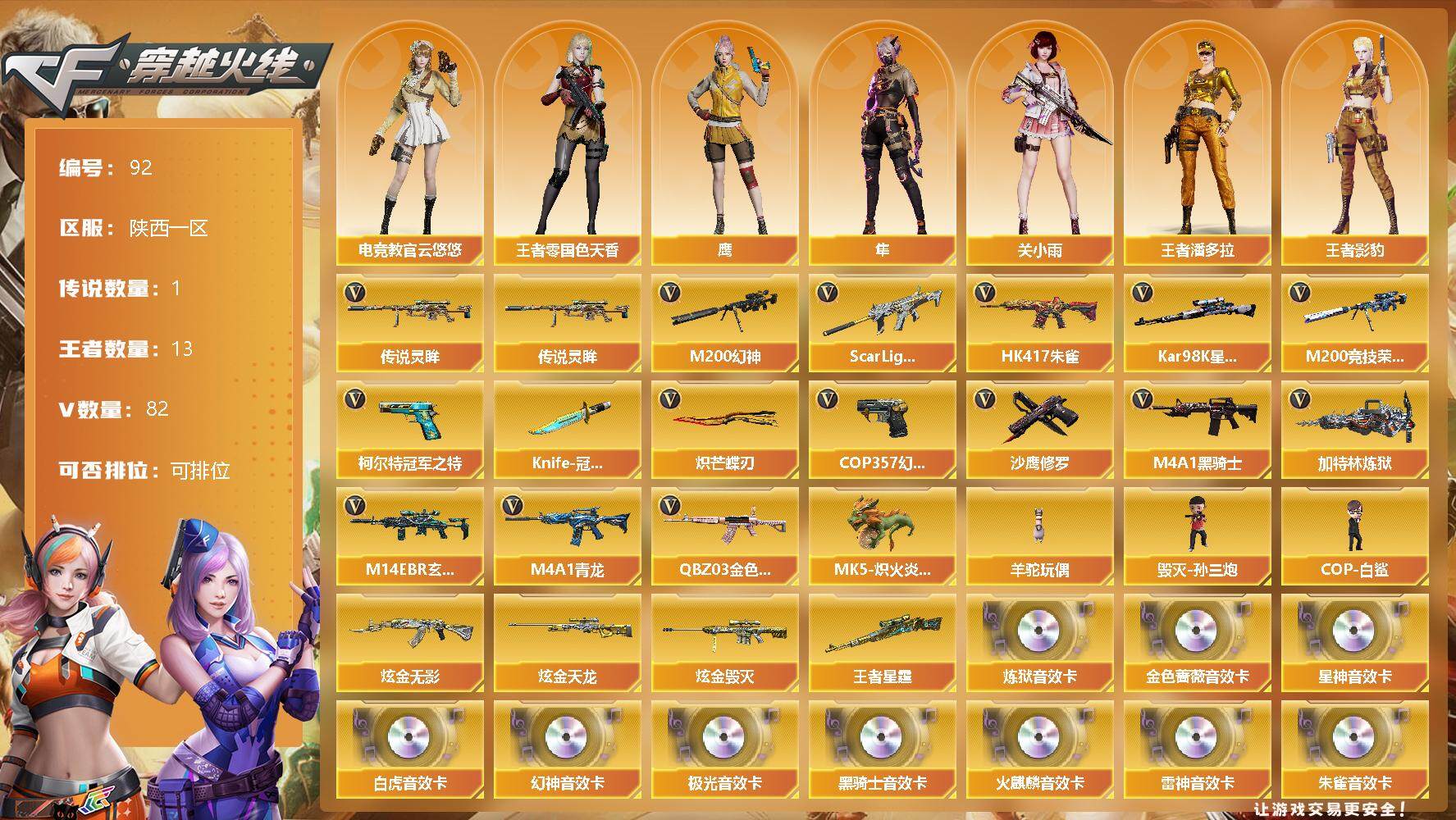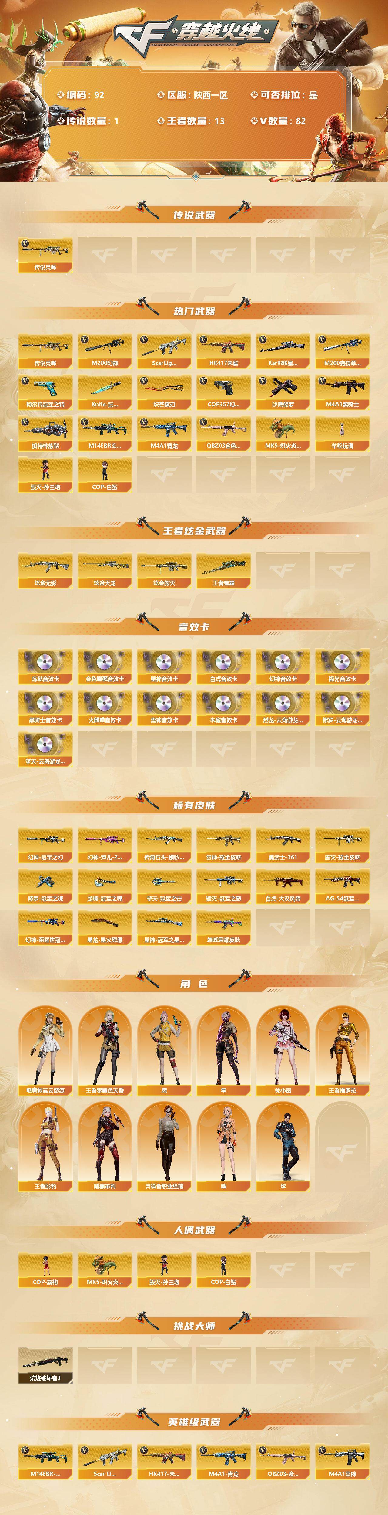 [12711844]陕西一区-82V-13王者-3炫金 【传说武器】:传说灵眸 【热门武器】:传说灵眸,QBZ03-金色蔷薇,M14EBR-玄武,Scar Light-白虎,HK417-朱雀*2,M4A1-青龙,M200-幻神,M200-竞技荣光,柯尔特-冠军之特,Kar98K-星神,M4A1-黑骑士,加特林-炼狱*2,MK5-炽火炎龙,羊驼玩偶,毁灭-孙三炮,COP-白鲨,COP 357-幻灵,沙鹰-修罗*3,Knife-冠军之刃,炽芒蝶刃*2 【王者炫金武器】:炫金无影,炫金天龙,炫金毁灭,王者星霆 【音效卡】:烈龙-云海游龙音效卡,修罗-云海游龙音效卡,擎天-云海游龙音效卡,M200-幻神音效卡,AK47-火麒麟音效卡,M4A1-雷神音效卡,M4A1-黑骑士音效卡,Barrett-极光音效卡,QBZ03-金色蔷薇音效卡,HK417-朱雀音效卡,Scar Light-白虎音效卡,Kar98K-星神音效卡,加特林-炼狱音效卡 【稀有皮肤】:幻神-冠军之幻,幻神-宠儿-2021MVP,M200-幻神-荣耀世冠白鲨,Kar98K-星神-冠军之星皮肤,白虎-大汉风骨,QBZ03-巅峰荣耀皮肤,雷神-耀金皮肤,传奇石头-横秒之巅,黑骑士-AG-S4冠军典藏,毁灭耀金皮肤,毁灭-冠军之怒,AK47-黑武士-361,修罗-冠军之魂*2,屠龙-星火燎原,擎天-冠军之击,龙啸-冠军之啸*2 【角色】:王者-零-国色天香,王者影豹,王者潘多拉,灵狐者-职业经理,幽,电竞教官-云悠悠,鹰,关小雨,隼,华,暗黑审判 【人偶武器】:MK5-炽火炎龙,COP-白鲨,毁灭-孙三炮,COP-旗袍 【挑战大师】:试炼破坏者III 【英雄级武器】:COP 357-云龙,M200-竞技荣光,柯尔特-竞技荣光*2,擎天-竞技荣光*2,高爆手雷-竞技荣光,烟雾弹-竞技荣光,闪光弹-竞技荣光,COP 357-幻灵,幻灵之锋*2,QBZ03-金色蔷薇,M14EBR-玄武,Scar Light-白虎,HK417-朱雀*2,M4A1-青龙,M4A1-雷神,M4A1-黑龙,M4A1-黑骑士,M4A1-死神,加特林-炼狱*2,AK47-火麒麟,AK47-黑武士,AN94-超新星,Barrett-毁灭,Barrett-极光,AA-12-雷霆,Kar98K-星神,M200-幻神,AK47-黑鲨*2,M4A1-猎神,超新星-热带奇洋,柯尔