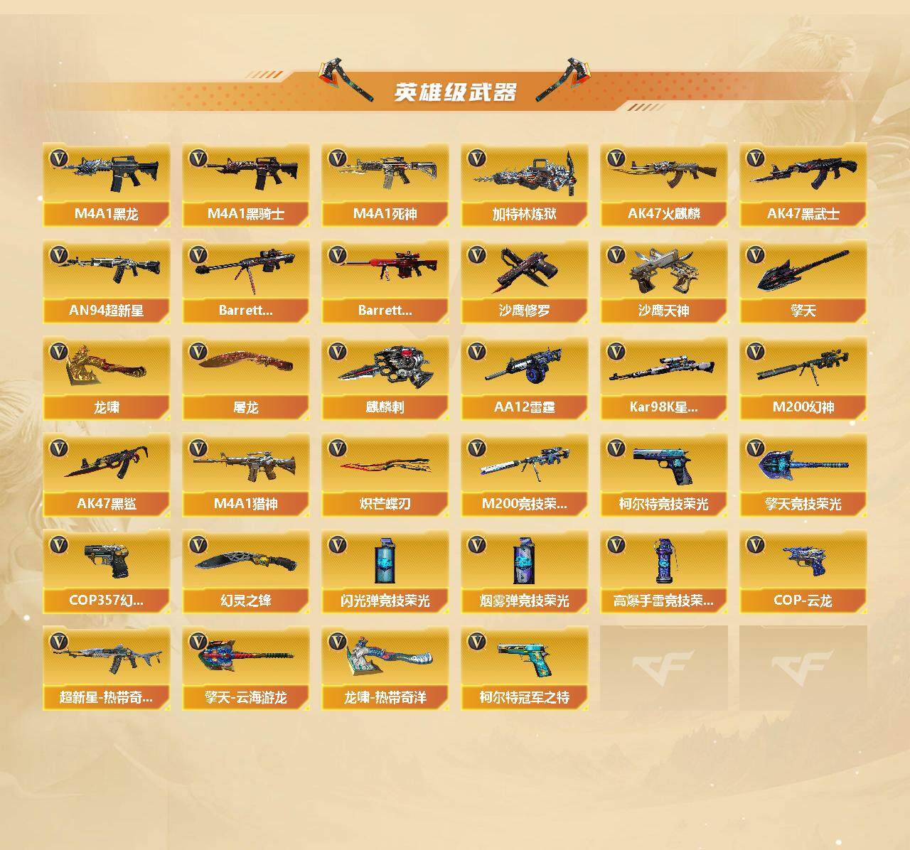 【英雄级武器】:COP 357-云龙,M200-竞技荣光,柯尔特-竞技荣光*2,擎天-竞技荣光*2,高爆手雷-竞技荣光,烟雾弹-竞技荣光,闪光弹-竞技荣光,COP 357-幻灵,幻灵之锋*2,QBZ03-金色蔷薇,M14EBR-玄武,Scar Light-白虎,HK417-朱雀*2,M4A1-青龙,M4A1-雷神,M4A1-黑龙,M4A1-黑骑士,M4A1-死神,加特林-炼狱*2,AK47-火麒麟,AK47-黑武士,AN94-超新星,Barrett-毁灭,Barrett-极光,AA-12-雷霆,Kar98K-星神,M200-幻神,AK47-黑鲨*2,M4A1-猎神,超新星-热带奇洋,柯尔