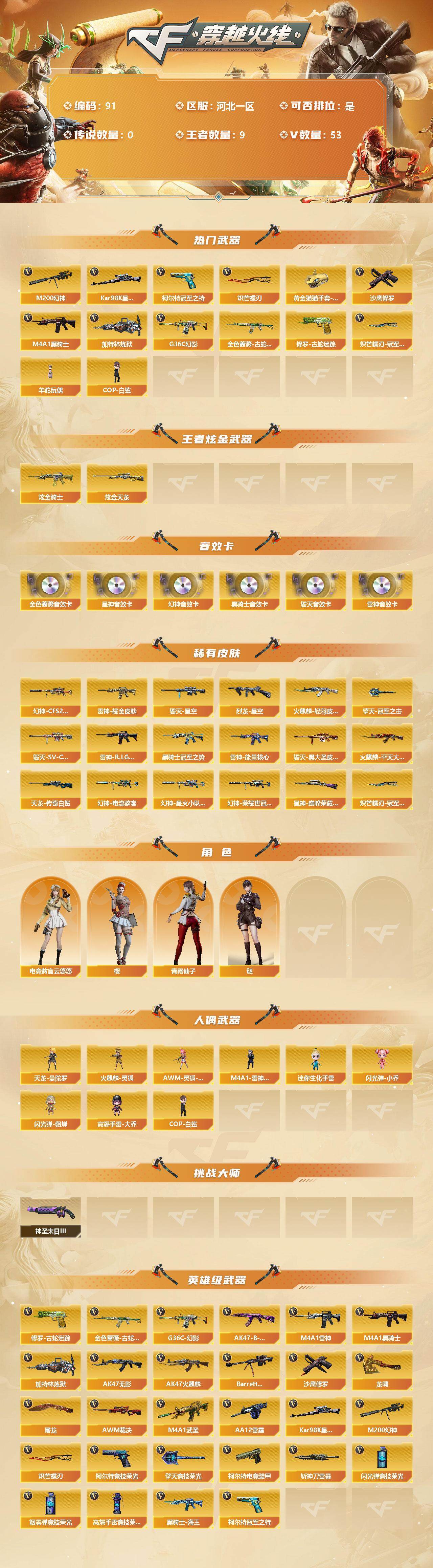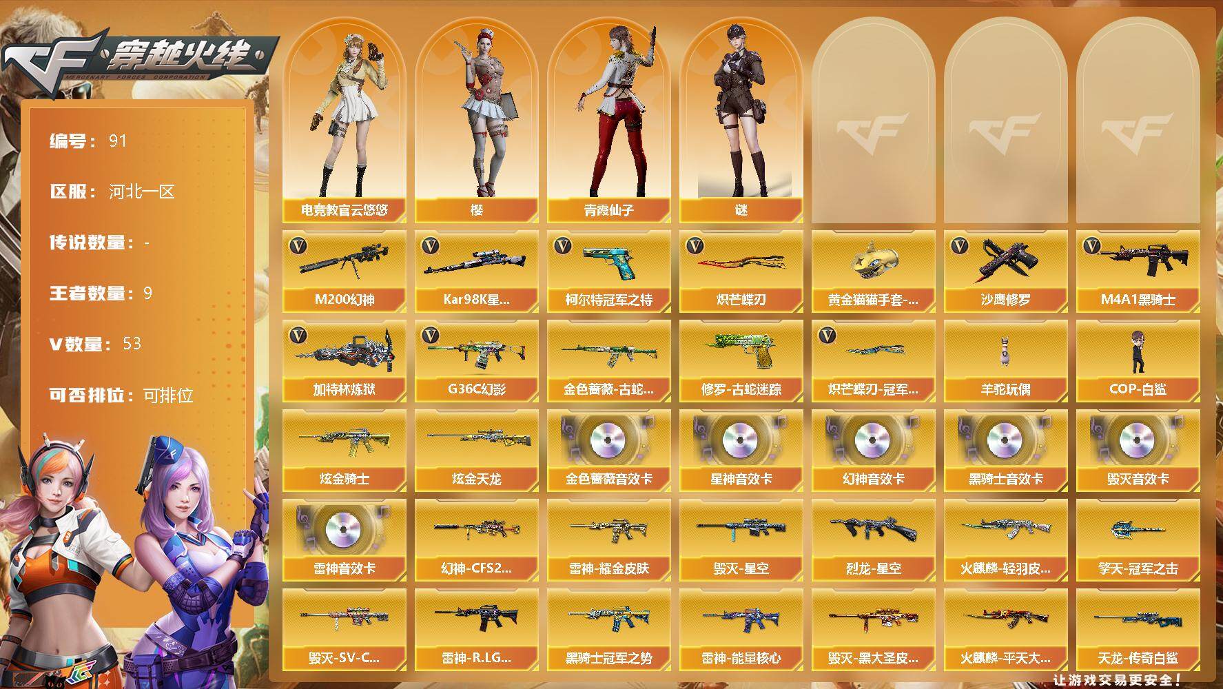[12711812]河北一区-53V-9王者-2炫金 【热门武器】:G36C-幻影,M200-幻神,金色蔷薇-古蛇迷踪,修罗-古蛇迷踪,柯尔特-冠军之特,Kar98K-星神,M4A1-黑骑士,加特林-炼狱,羊驼玩偶,COP-白鲨,沙鹰-修罗,炽芒蝶刃,炽芒蝶刃-冠军炽芒皮肤,黄金猫猫手套-白鲨 【王者炫金武器】:炫金骑士,炫金天龙 【音效卡】:M200-幻神音效卡,M4A1-雷神音效卡,M4A1-黑骑士音效卡,Barrett-毁灭音效卡,QBZ03-金色蔷薇音效卡,Kar98K-星神音效卡 【稀有皮肤】:幻神-CFS2022,幻神-电流骇客 皮肤,幻神-星火小队签名臻藏版 皮肤,幻神-荣耀世冠白鲨2023 皮肤,星神-巅峰荣耀 皮肤,雷神-能量核心,雷神-耀金皮肤,雷神-R.LGD-CFPLS18冠军,火麒麟-轻羽皮肤,火麒麟-平天大圣,黑骑士-冠军之势,毁灭-星空,毁灭-SV-CFPLS16冠军,毁灭-黑大圣皮肤,AWM-天龙-传奇白鲨,烈龙-星空,炽芒蝶刃-冠军炽芒皮肤,擎天-冠军之击 【角色】:樱,电竞教官-云悠悠,谜,青霞仙子 【人偶武器】:COP-白鲨,天龙-曼陀罗,火麒麟-灵狐,AWM-灵狐-15周年嘉年华,M4A1-雷神-精英刀锋,迷你生化手雷,闪光弹-小乔,闪光弹-貂蝉,高爆手雷-大乔 【挑战大师】:神圣爆裂者-末日III 【英雄级武器】:柯尔特-竞技荣光,擎天-竞技荣光,高爆手雷-竞技荣光*3,烟雾弹-竞技荣光*4,闪光弹-竞技荣光*4,柯尔特-电竞装甲,斩神刀-雷暴,M4A1-武圣,G36C-幻影,金色蔷薇-古蛇迷踪,M4A1-雷神,M4A1-黑骑士,加特林-炼狱,AK47-无影,AK47-火麒麟,Barrett-毁灭,AWM-裁决,AA-12-雷霆*2,Kar98K-星神,M200-幻神,黑骑士-海王,AK47-B-常胜将军,柯尔特-冠军之特,修罗-古蛇迷踪,沙鹰-修罗,炽芒蝶刃,龙啸,屠龙*2 【特殊枪械】:1黑骑士,1炼狱
