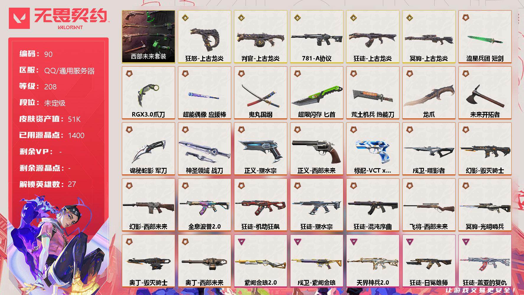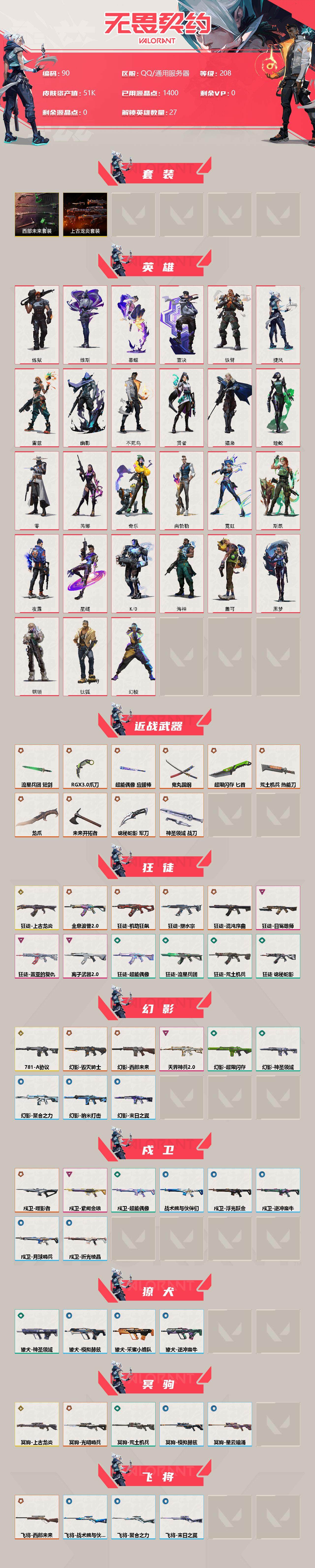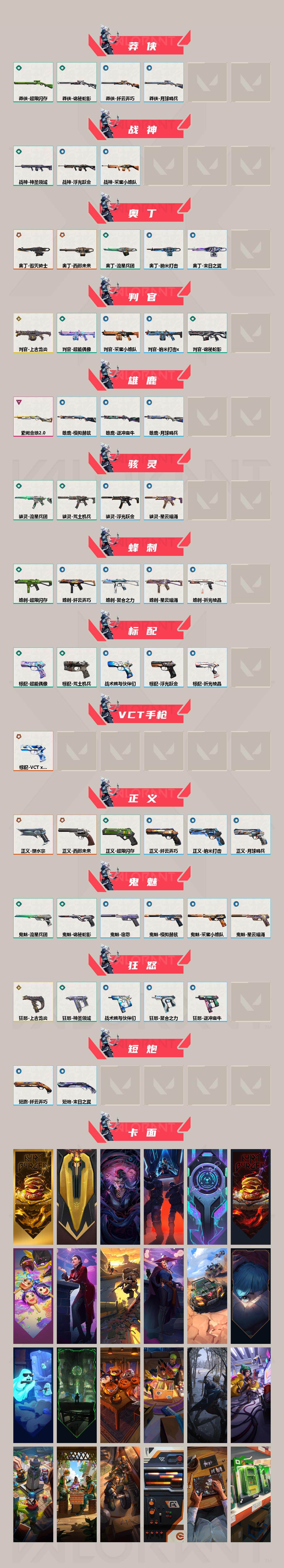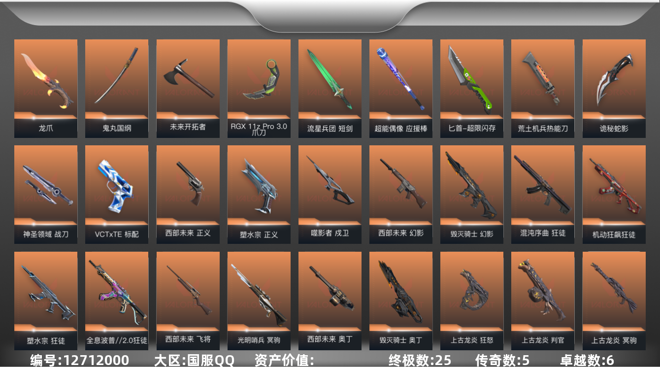 [12712000]【套装】:上古龙炎套装,西部未来套装 【英雄】:幻棱,炼狱,维斯,暮蝶,钛狐,壹决,铁臂,捷风,雷兹,幽影,不死鸟,贤者,猎枭,蝰蛇,零,芮娜,奇乐,尚勃勒,霓虹,斯凯,夜露,星礈,K/O,海神,盖可,黑梦,钢锁 【近战 武器】:近战武器-RGX 11z Pro//3.0 爪刀,近战武器-鬼丸国纲,近战武器-未来开拓者,近战武器-龙爪,近战武器-流星兵团 短剑,近战武器-超能偶像 应援棒,近战武器-超限闪存 匕首,近战武器-荒土机兵 热能刀,近战武器-诡秘蛇影 军刀,近战武器-神圣领域 战刀 【狂徒】:狂徒-上古龙炎,狂徒-混沌序曲,狂徒-机动狂飙,狂徒-全息波普//2.0,狂徒-塑水宗,狂徒-盖亚的复仇,狂徒-日冕雄师,狂徒-离子武器//2.0,狂徒-超能偶像,狂徒-荒土机兵,狂徒-流星兵团,狂徒-诡秘蛇影 【幻影】:幻影-781-A协议,幻影-毁灭骑士,幻影-西部未来,幻影-天界神兵//2.0,幻影-超限闪存,幻影-神圣领域,幻影-聚合之力,幻影-纳米打击,幻影-末日之翼,幻影-西部未来 【戍卫】:戍卫-噬影者,戍卫-紫阙金琅,戍卫-超能偶像,戍卫-浮光跃金,戍卫-逆冲蛮牛,戍卫-战术熊与伙伴们,戍卫-月球哨兵,戍卫-折光棱晶 【獠犬】:獠犬-神圣领域,獠犬-采蜜小蜂队,獠犬-模拟赫兹,獠犬-逆冲蛮牛 【冥驹】:冥驹-上古龙炎,冥驹-光明哨兵,冥驹-荒土机兵,冥驹-模拟赫兹,冥驹-星云暗涌 【飞将】:飞将-西部未来,飞将-聚合之力,飞将-战术熊与伙伴们,飞将-末日之翼 【莽侠】:莽侠-超限闪存,莽侠-诡秘蛇影,莽侠-纤云弄巧,莽侠-月球哨兵 【战神】:战神-神圣领域,战神-采蜜小蜂队,战神-浮光跃金 【奥丁】:奥丁-毁灭骑士,奥丁-西部未来,奥丁-流星兵团,奥丁-纳米打击,奥丁-末日之翼 【判官】:判官-上古龙炎,判官-超能偶像,判官-诡秘蛇影,判官-采蜜小蜂队,判官-纳米打击x 【雄鹿】:雄鹿-紫阙金琅//2.0,雄鹿-模拟赫兹,雄鹿-逆冲蛮牛,雄鹿-月球哨兵 【骇灵】:骇灵-荒土机兵,骇灵-流星兵团,骇灵-浮光跃金,骇灵-星云暗涌 【蜂刺】:蜂刺-超限闪存,蜂刺-聚合之力,蜂刺-纤云弄巧,蜂刺-星云暗涌,蜂刺-折光棱晶 【标配】:标配-超能偶像,标配-荒土机兵,标配-浮光跃金,标配-战术熊与伙伴们,标配-折光棱晶 【VCT手枪】:标配-VCT x TE 【