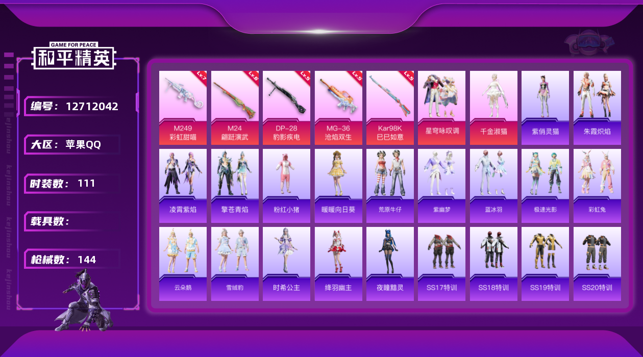 [12712042]苹果 手Q-2粉装-5特效枪-2粉色飞行器-4.5w热力值-10王牌印记-111套装-144枪皮【热门品类】:套装-粉红小猪【粉色套装】:角色-千金淑猫,粉装-星穹咏叹调【粉色枪皮等级】:Kar98K-巳巳如意(五级),M24-翩跹演武(六级),M249-彩虹甜喵(七级),DP-28-豹影疾电(五级),MG-36-沧焰双生(五级)【粉色飞行器】:绯果甜心飞行器,时光之吻飞行器
