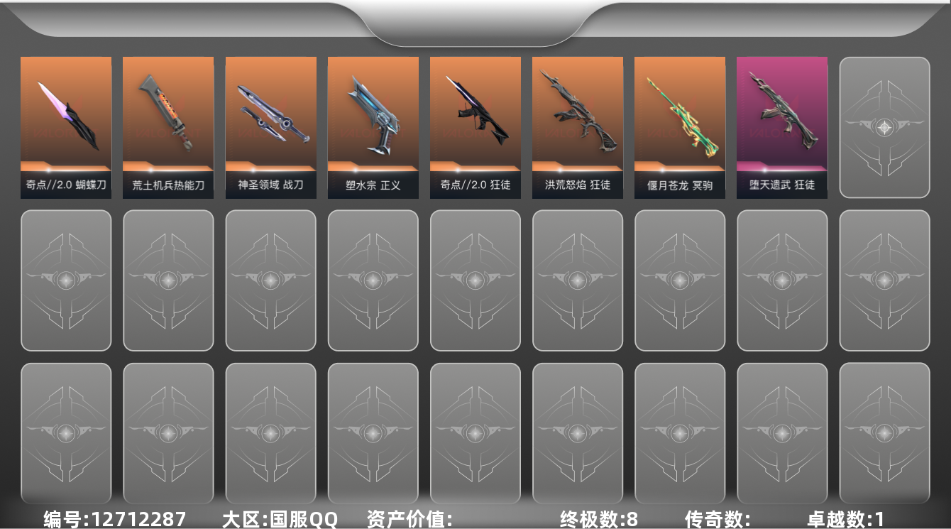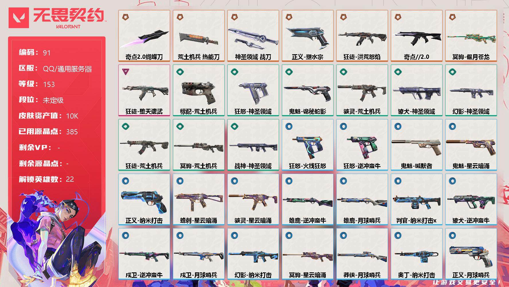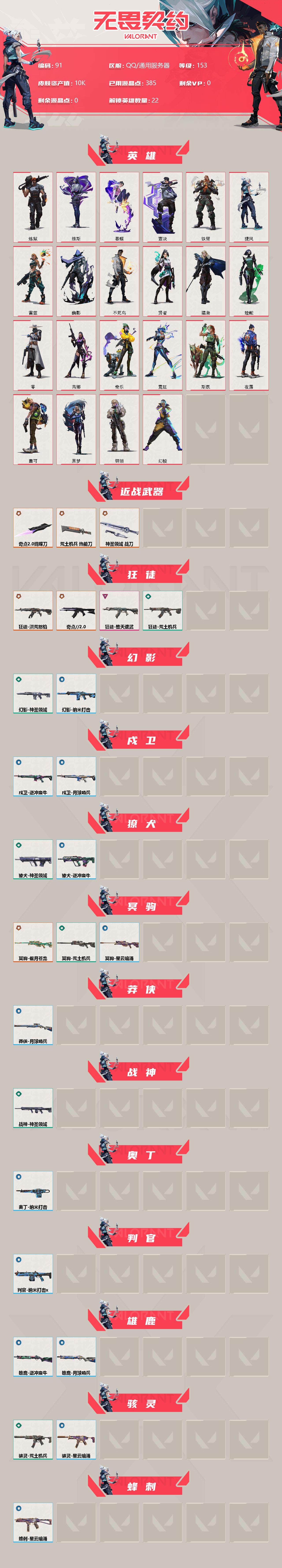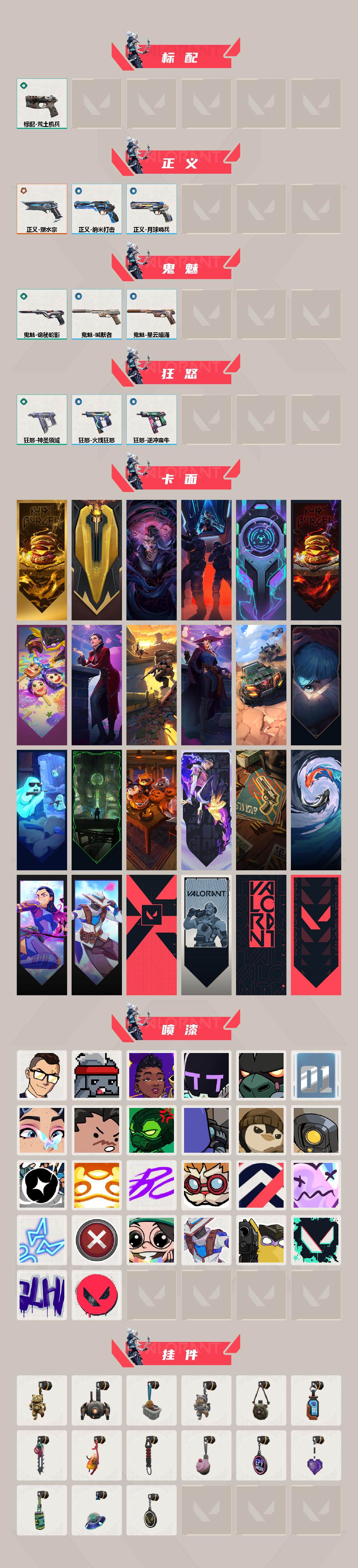 [12712287]【英雄】:幻棱,炼狱,维斯,暮蝶,壹决,铁臂,捷风,雷兹,幽影,不死鸟,贤者,猎枭,蝰蛇,零,芮娜,奇乐,霓虹,斯凯,夜露,盖可,黑梦,钢锁 【近战 武器】:近战武器-奇点//2.0 蝴蝶刀,近战武器-荒土机兵 热能刀,近战武器-神圣领域 战刀 【狂徒】:狂徒-洪荒怒焰,狂徒-奇点//2.0,狂徒-堕天遗武,狂徒-荒土机兵 【幻影】:幻影-神圣领域,幻影-纳米打击 【戍卫】:戍卫-逆冲蛮牛,戍卫-月球哨兵 【獠犬】:獠犬-神圣领域,獠犬-逆冲蛮牛 【冥驹】:冥驹-偃月苍龙,冥驹-荒土机兵,冥驹-星云暗涌 【莽侠】:莽侠-月球哨兵 【战神】:战神-神圣领域 【奥丁】:奥丁-纳米打击 【判官】:判官-纳米打击x 【雄鹿】:雄鹿-逆冲蛮牛,雄鹿-月球哨兵 【骇灵】:骇灵-荒土机兵,骇灵-星云暗涌 【蜂刺】:蜂刺-星云暗涌 【标配】:标配-荒土机兵 【正义】:正义-塑水宗,正义-纳米打击,正义-月球哨兵 【鬼魅】:鬼魅-诡秘蛇影,鬼魅-缄默者,鬼魅-星云暗涌 【狂怒】:狂怒-神圣领域,狂怒-火线狂怒,狂怒-逆冲蛮牛 【卡面】:终章:激斗汉堡 卡面,进入射程 卡面,分崩离析 卡面,纳米打击 卡面,抑制技术 卡面,激斗汉堡 卡面,瓦娃脸雪糕 P2 卡面,从黄昏到黎明 卡面,荒土机兵 卡面,银弹猎手 卡面,逆冲蛮牛 卡面,《双城之战》拥抱 卡面,精灵大战 卡面,欢迎来到底城 卡面,南瓜盛典 卡面,无畏契约:暮蝶 卡面,正义的化身 卡面,红鳞松叶 卡面,无畏契约GO!第一卷:芮娜 卡面,无畏契约GO!第一卷:零 卡面,代号红色 卡面,新兵报到 卡面,V契约 卡面,无畏契约 卡面 【喷漆】:小小心意 喷漆,战“素”兔 喷漆,宇宙的指引 喷漆,请求重启 喷漆,逆冲蛮牛 喷漆,纳米打击 喷漆,鼻尖上的蝴蝶 喷漆,简笔画黯兽 喷漆,独守蝰腹 喷漆,他们将落荒而逃 喷漆,通缉:战术企鹅 喷漆,荒土机兵 喷漆,别挡我吃球! 喷漆,嗨宝南瓜灯 喷漆,嘭! 喷漆,都算到了 喷漆,控场勿近 喷漆,伤心心 喷漆,霓光四射 喷漆,买装还是存钱 喷漆,萌化了 喷漆,无畏契约GO!第一卷:零 喷漆,放下武器 喷漆,胜利属于无畏契约 喷漆,GLHF 喷漆,无畏契约 喷漆 【挂饰】:终章:猫猫木乃伊 挂饰,荒土机兵 挂饰,悠闲鸡块 挂饰,猫猫木乃伊 挂饰,水壶 挂饰,纳米打击 挂饰,逆冲蛮牛 挂饰,可爱糖糖