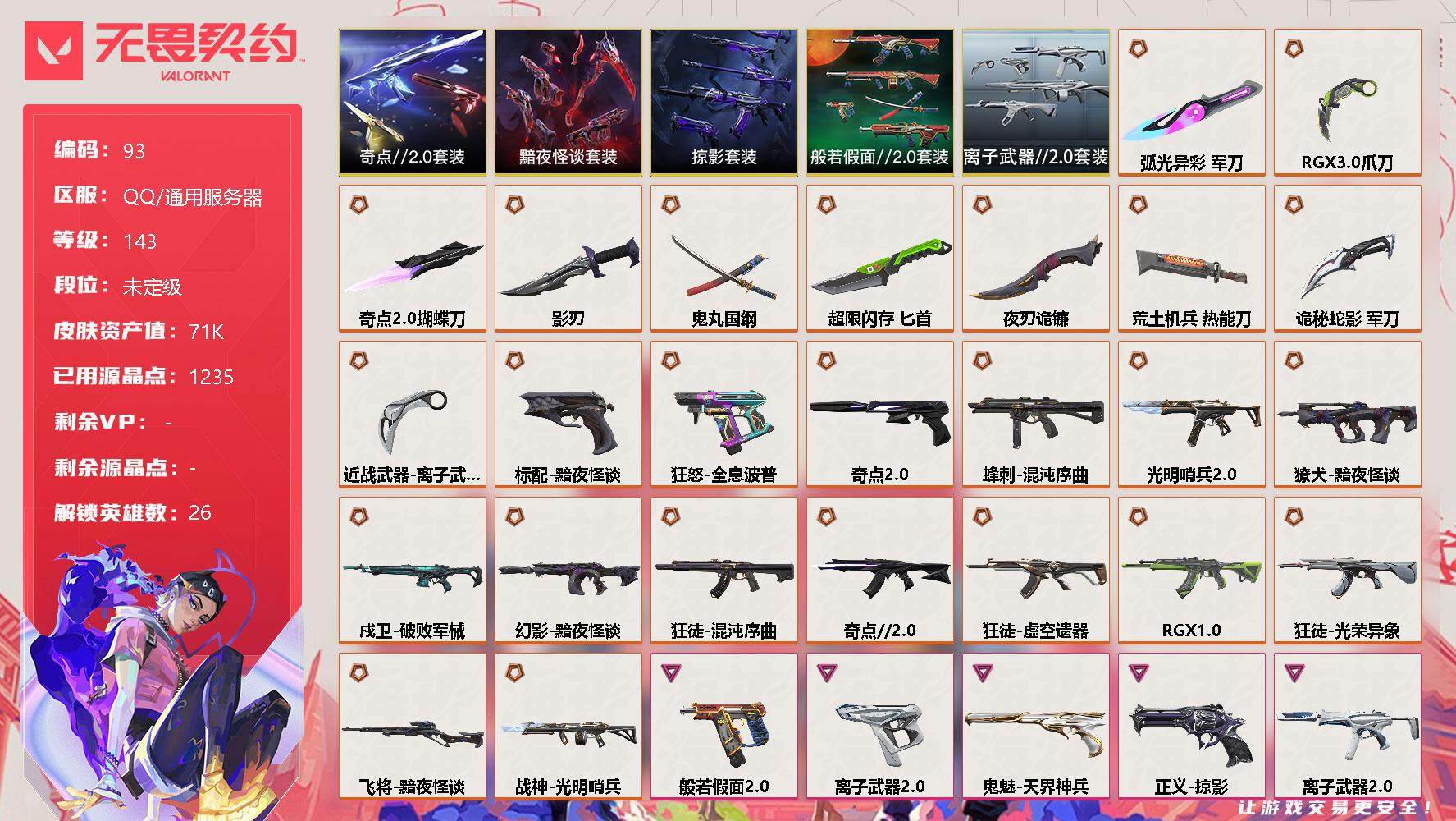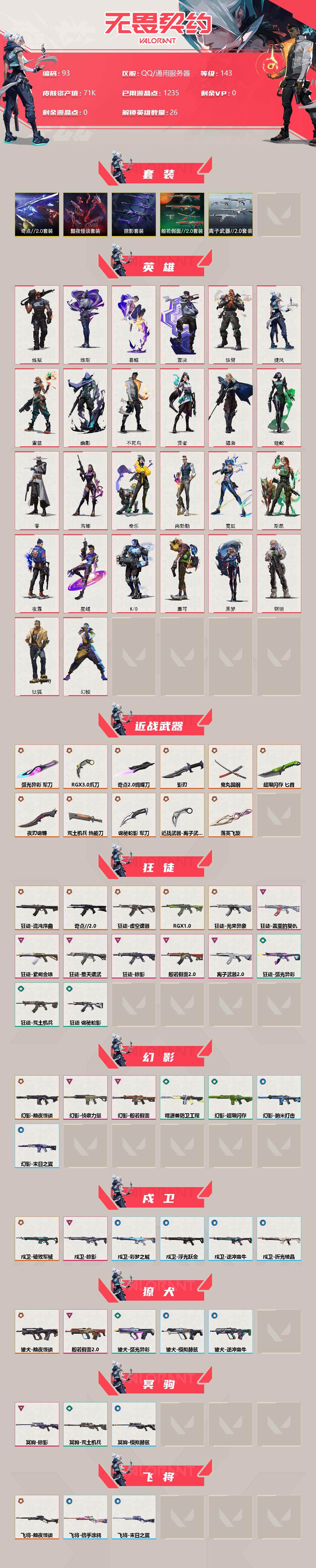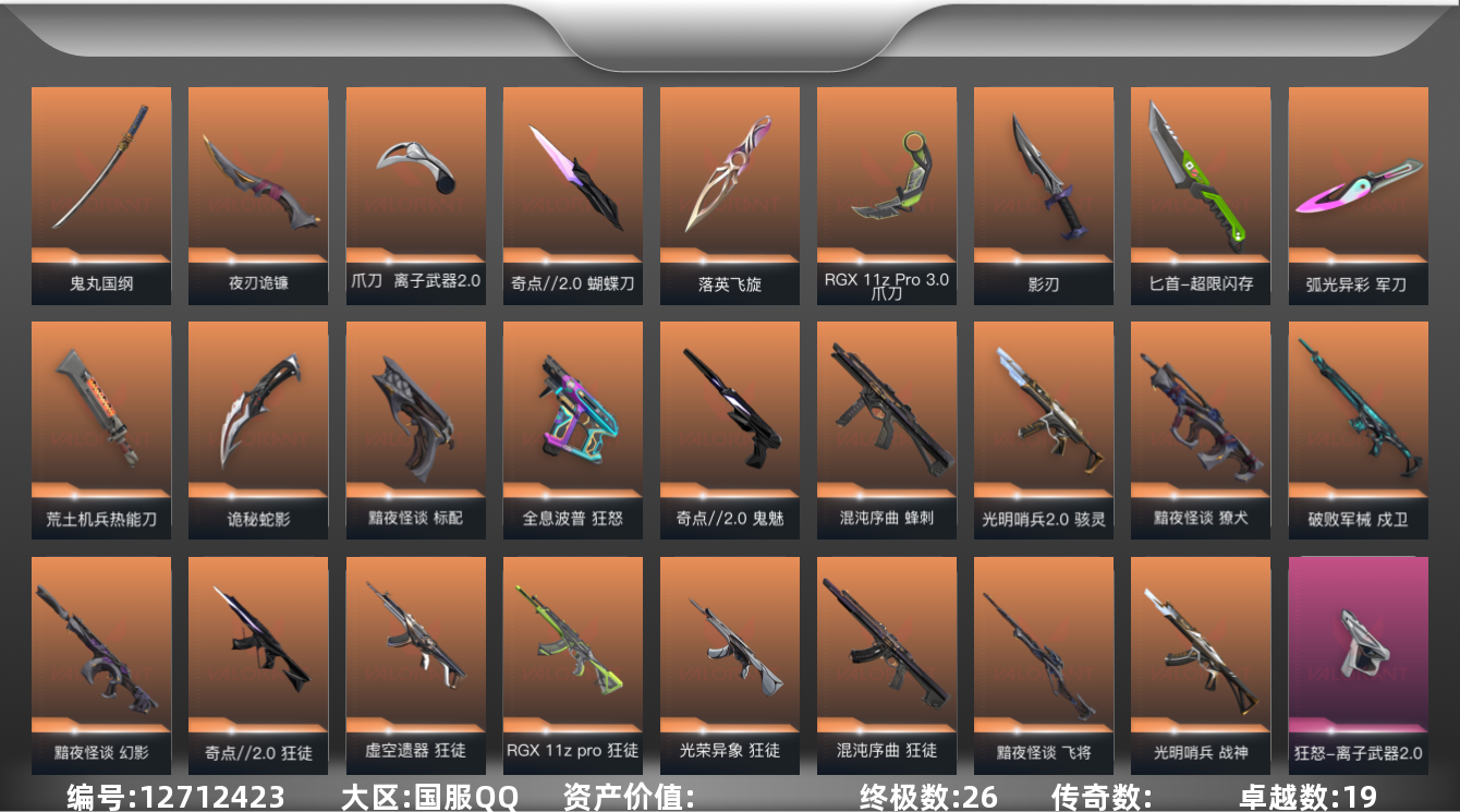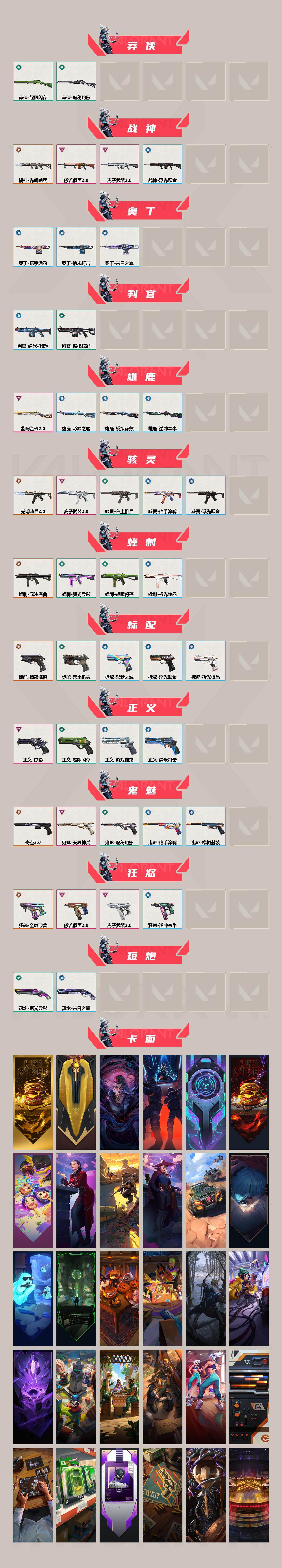 [12712423]【套装】:奇点//2.0套装,黯夜怪谈套装,般若假面//2.0套装,掠影套装,离子武器//2.0套装 【英雄】:幻棱,炼狱,维斯,暮蝶,钛狐,壹决,铁臂,捷风,雷兹,幽影,不死鸟,贤者,猎枭,蝰蛇,零,芮娜,奇乐,尚勃勒,霓虹,斯凯,夜露,星礈,K/O,盖可,黑梦,钢锁 【近战 武器】:近战武器-奇点//2.0 蝴蝶刀,近战武器-RGX 11z Pro//3.0 爪刀,近战武器-落英飞旋,近战武器-鬼丸国纲,近战武器-离子武器//2.0 爪刀,近战武器-超限闪存 匕首,近战武器-弧光异彩 军刀,近战武器-荒土机兵 热能刀,近战武器-夜刃诡镰,近战武器-影刃,近战武器-诡秘蛇影 军刀 【狂徒】:狂徒-混沌序曲,狂徒-奇点//2.0,狂徒-虚空遗器,狂徒-RGX 11z Pro,狂徒-光荣异象,狂徒-般若假面//2.0,狂徒-堕天遗武,狂徒-掠影,狂徒-盖亚的复仇,狂徒-紫阙金琅,狂徒-离子武器//2.0,狂徒-弧光异彩,狂徒-荒土机兵,狂徒-诡秘蛇影 【幻影】:幻影-黯夜怪谈,幻影-般若假面,幻影-侦察力量,幻影-超限闪存,幻影-噬源兽防卫工程,幻影-纳米打击,幻影-末日之翼 【戍卫】:戍卫-破败军械,戍卫-掠影,戍卫-彩梦之城,戍卫-浮光跃金,戍卫-逆冲蛮牛,戍卫-折光棱晶 【獠犬】:獠犬-黯夜怪谈,獠犬-般若假面//2.0,獠犬-弧光异彩,獠犬-模拟赫兹,獠犬-逆冲蛮牛 【冥驹】:冥驹-掠影,冥驹-荒土机兵,冥驹-模拟赫兹 【飞将】:飞将-黯夜怪谈,飞将-信手涂鸦,飞将-末日之翼 【莽侠】:莽侠-超限闪存,莽侠-诡秘蛇影 【战神】:战神-光明哨兵,战神-般若假面//2.0,战神-离子武器//2.0,战神-浮光跃金 【奥丁】:奥丁-纳米打击,奥丁-信手涂鸦,奥丁-末日之翼 【判官】:判官-诡秘蛇影,判官-纳米打击x 【雄鹿】:雄鹿-紫阙金琅//2.0,雄鹿-彩梦之城,雄鹿-模拟赫兹,雄鹿-逆冲蛮牛 【骇灵】:骇灵-光明哨兵//2.0,骇灵-离子武器//2.0,骇灵-荒土机兵,骇灵-浮光跃金,骇灵-信手涂鸦 【蜂刺】:蜂刺-混沌序曲,蜂刺-超限闪存,蜂刺-弧光异彩,蜂刺-折光棱晶 【标配】:标配-黯夜怪谈,标配-荒土机兵,标配-彩梦之城,标配-浮光跃金,标配-折光棱晶 【正义】:正义-掠影,正义-超限闪存,正义-纳米打击,正义-游戏结束 【鬼魅】:鬼魅-奇点//2.
