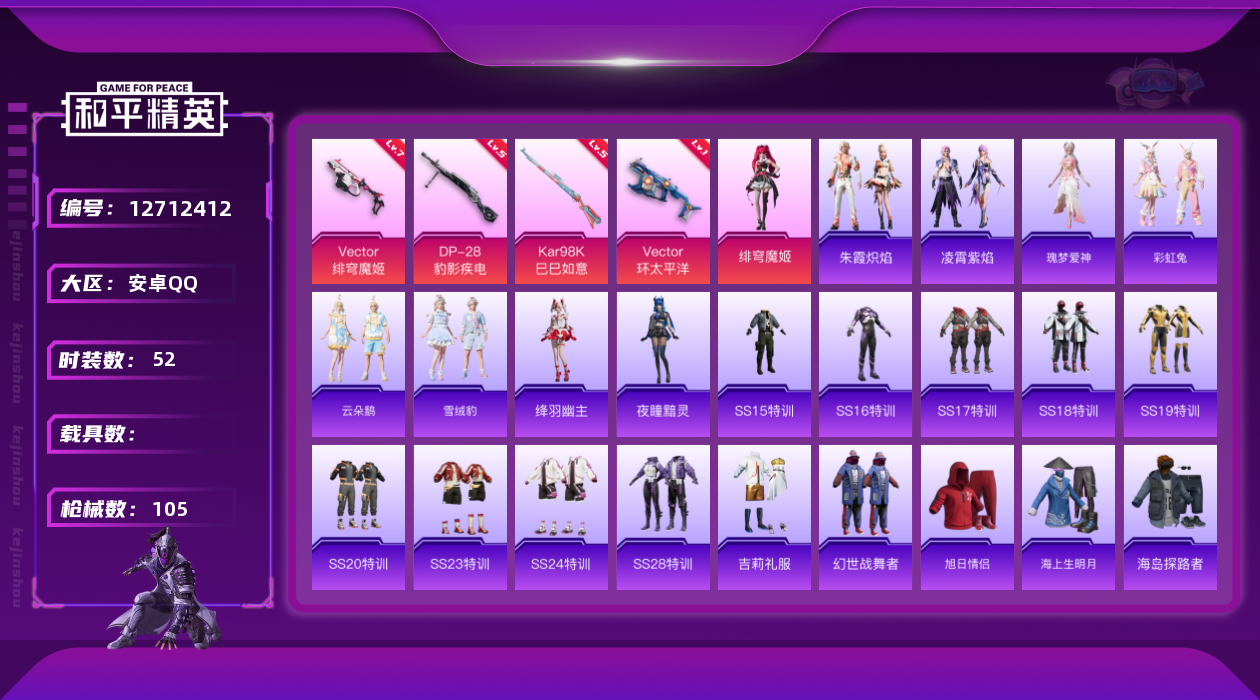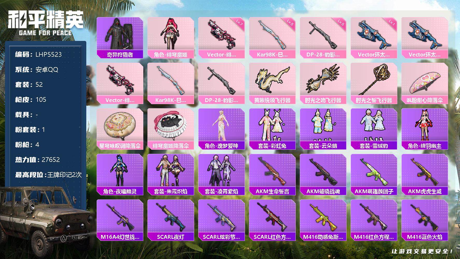 [12712412]安卓 手Q-1粉装-4特效枪-3粉色飞行器-2.7w热力值-2王牌印记-52套装-105枪皮【热门品类】:套装-奇异狩猎者【粉色套装】:角色-绯穹魔姬【粉色枪皮等级】:Vector-环太平洋(一级),Vector-绯穹魔姬(七级),Kar98K-巳巳如意(五级),DP-28-豹影疾电(五级)【粉色飞行器】:黄族统领飞行器,时光之吻飞行器,时光之誓飞行器