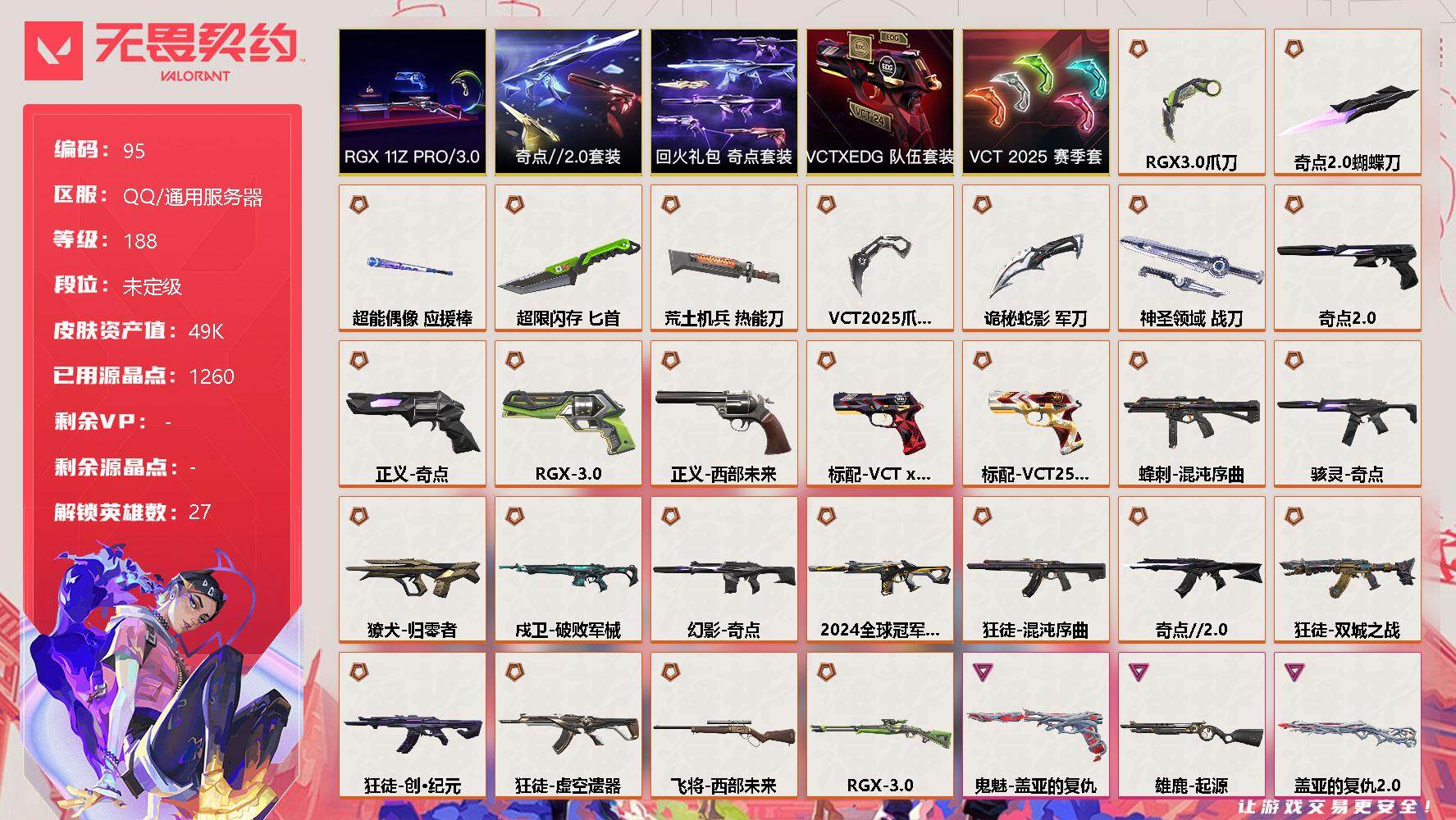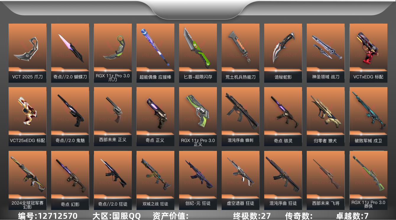 [12712570]【套装】:VCT 2025 赛季套装,RGX 11z Pro//3.0套装,奇点//2.0套装,VCTxEDG 队伍套装,回火礼包:奇点套装 【英雄】:幻棱,炼狱,维斯,暮蝶,钛狐,壹决,铁臂,捷风,雷兹,幽影,不死鸟,贤者,猎枭,蝰蛇,零,芮娜,奇乐,尚勃勒,霓虹,斯凯,夜露,星礈,K/O,海神,盖可,黑梦,钢锁 【近战 武器】:近战武器-奇点//2.0 蝴蝶刀,近战武器-VCT 2025 爪刀,近战武器-RGX 11z Pro//3.0 爪刀,近战武器-超能偶像 应援棒,近战武器-超限闪存 匕首,近战武器-荒土机兵 热能刀,近战武器-诡秘蛇影 军刀,近战武器-神圣领域 战刀 【狂徒】:狂徒-混沌序曲,狂徒-奇点//2.0,狂徒-双城之战,狂徒-创·纪元,狂徒-虚空遗器,狂徒-盖亚的复仇,狂徒-离子武器//2.0,狂徒-超能偶像,狂徒-荒土机兵,狂徒-诡秘蛇影 【幻影】:幻影-2024全球冠军赛,幻影-奇点,幻影-超限闪存,幻影-神圣领域,幻影-聚合之力,幻影-纳米打击,幻影-末日之翼 【戍卫】:戍卫-破败军械,戍卫-超能偶像,戍卫-浮光跃金,戍卫-逆冲蛮牛,戍卫-月球哨兵,戍卫-折光棱晶 【獠犬】:獠犬-归零者,獠犬-神圣领域,獠犬-采蜜小蜂队,獠犬-模拟赫兹,獠犬-逆冲蛮牛 【冥驹】:冥驹-盖世英雄,冥驹-荒土机兵,冥驹-模拟赫兹,冥驹-星云暗涌 【飞将】:飞将-西部未来,飞将-聚合之力,飞将-末日之翼 【莽侠】:莽侠-RGX 11z Pro//3.0,莽侠-超限闪存,莽侠-诡秘蛇影,莽侠-月球哨兵 【战神】:战神-神圣领域,战神-采蜜小蜂队,战神-浮光跃金 【奥丁】:奥丁-纳米打击,奥丁-末日之翼 【判官】:判官-天界神兵//2.0,判官-超能偶像,判官-诡秘蛇影,判官-采蜜小蜂队,判官-纳米打击x 【雄鹿】:雄鹿-盖亚的复仇//2.0,雄鹿-起源,雄鹿-模拟赫兹,雄鹿-逆冲蛮牛,雄鹿-月球哨兵 【骇灵】:骇灵-奇点,骇灵-荒土机兵,骇灵-浮光跃金,骇灵-星云暗涌 【蜂刺】:蜂刺-混沌序曲,蜂刺-超限闪存,蜂刺-聚合之力,蜂刺-星云暗涌,蜂刺-折光棱晶 【标配】:标配-超能偶像,标配-荒土机兵,标配-浮光跃金,标配-折光棱晶 【VCT手枪】:标配-VCT x EDG,标配-VCT25 x EDG 【正义】:正义-RGX 11z Pro//3.0,正义-奇点