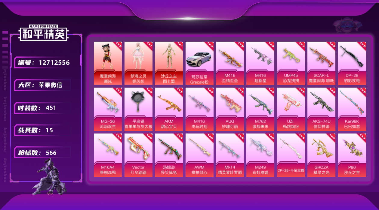 - PX_2103284- 安卓手Q-9王牌印记-12粉装-9特效枪-1载具-热力值-342套装-377枪皮-1卓越印记-0传奇印记 【12粉装】,梦幻火箭,2号机款机体服,洛天依,诡面斩,圣堂之誓,金域紫灵,天启纪元,樱桃泡泡,暗夜鎏金,纯珍童话,创世·救赎,未来战士 【9特效枪】AKM-梦之光华-7级 AKM-星际浪客-1级 SCAR-L-梦幻火箭-6级 SCAR-L-锦绣绵绵-5级 M416-五