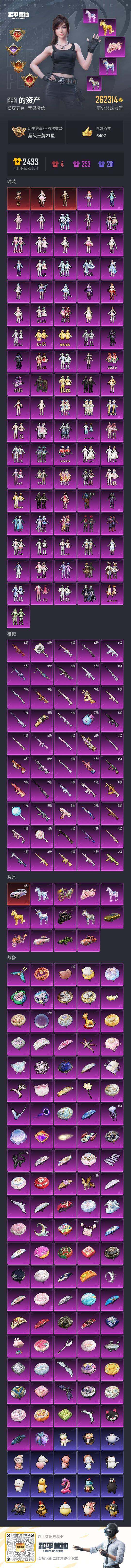 - PX_2096207- 苹果手Q-25王牌印记-6粉装-5特效枪-1载具-78221热力值-192套装-255枪皮-0卓越印记-0传奇印记 【6粉装】,梦幻火箭,初号机 觉醒Ver.,灵感创作师,怪诞乔克,创世·救赎,数码大师 【5特效枪】AKM-绿萝繁花-5级 SCAR-L-锦绣绵绵-5级 SCAR-L-梦幻火箭-7级 M416-电玩时刻-5级 M416-心之恋语-7级 【11稀有紫装】,都市