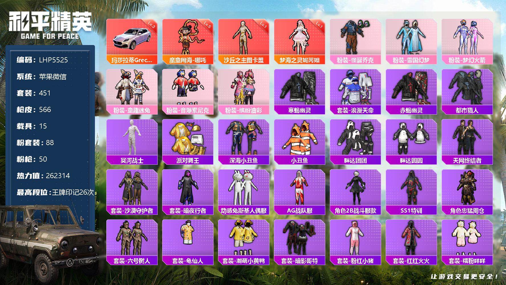 - [12218358]素材身法号【特价急出/详情看图】:苹果 手Q-5粉装-4特效枪-3载具-1粉色飞行器-8.8w热力值-13王牌印记-211套装-267枪皮【热门品类】:套装-浪漫天命,套装-都市猎人,套装-小丑鱼,套装-奇异狩猎者,套装-浪客战士,旭日初心兜帽大衣,套装-龟仙人,套装-暗影哥特,套装-粉红小猪,角色-8号机,角色-Mark.06,小恶魔头饰【粉色载具】:阿斯顿马丁DBS(绿),玛莎拉蒂Ghibli(蓝),合金龙骨(蓝)【粉色套装】:粉装-深海曼妙,粉装-潮汐统领,粉装-银刃赛罗,粉装-筑梦精灵,角色-初号机 觉醒Ver.【粉色枪皮等级】:M416-心之恋语(七级),UZI-筑梦精灵(五级),Kar98K-巳巳如意(三级),DP-28-豹影疾电(五级)【粉色飞行器】:星之彼岸飞行器