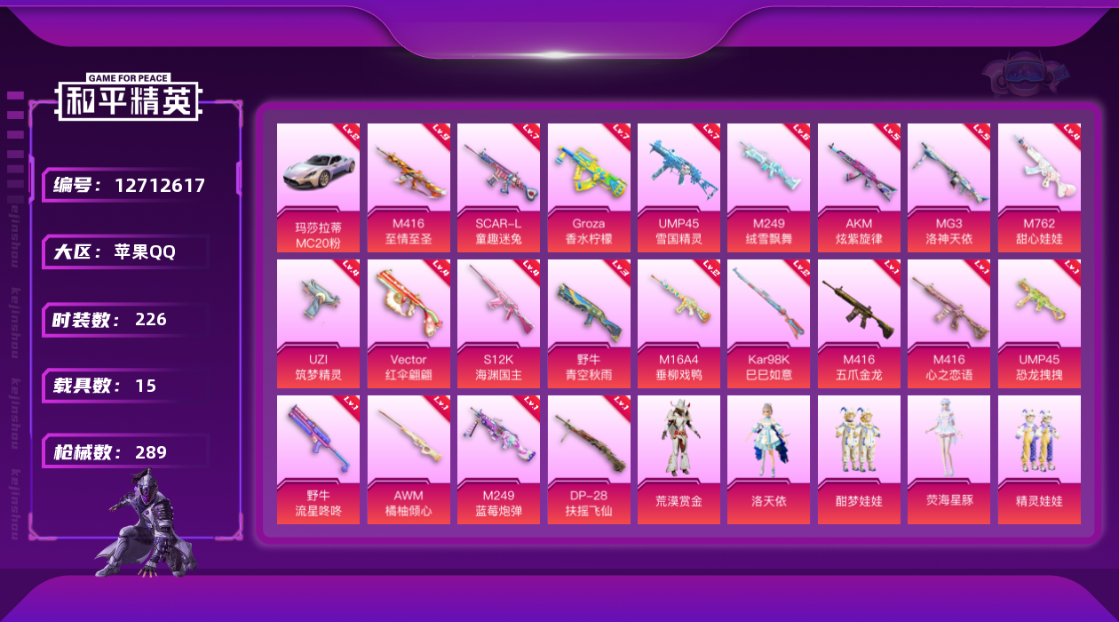 [12712617]素材身法号/M416-至情至圣(九级) 苹果 手Q-38粉装-21特效枪-15载具-6粉色飞行器-14.3w热力值-16王牌印记-226套装-289枪皮【红色载具】:玛莎拉蒂MC20(幻星粉)(二级)【热门品类】:粉装-雪国幻梦,粉装-梦幻火箭,粉装-童趣迷兔,粉装-缤纷油彩,套装-浪漫天命,套装-深海小丑鱼,套装-小丑鱼,套装-奇异狩猎者,套装-胖达圆圆,套装-龟仙人,套装-暗影哥特【粉色载具】:特斯拉Roadster(沁心粉),兰博基尼Aventador SVJ(翡翠绿),兰博基尼Estoque(炫光金),路特斯ELETRE(冰川蓝),玛莎拉蒂MC20(幻星粉),玛莎拉蒂MC20(星石白),玛莎拉蒂Ghibli(蓝),合金龙骨(蓝),灵鼠银迹,海龙奔腾,萌喵橘座,双人摩托-梦幻火箭,极速兔兔车,鬼马风驰,空客H135-蔚蓝之翼【粉色套装】:粉装-独舞天鹅,粉装-数码大师,粉装-甜心巧克力,粉装-宝贝奶油派,粉装-天使彩虹糖,粉装-雪国幻梦,粉装-梦幻火箭,粉装-缤纷油彩,粉装-天禅智恒,粉装-新星烈龙,粉装-极致幻想,粉装-草莓生巧,粉装-冰霜白皇,粉装-童趣迷兔,粉装-炙焰红王,粉装-香水柠檬,粉装-甜梦冰蝶,粉装-馨动时刻,角色-洛天依,粉装-海渊国主,粉装-蓝莓炮弹,粉装-流星咚咚,粉装-精灵娃娃,粉装-酣梦娃娃,粉装-恐龙拽拽,粉装-橘柚倾心,粉装-筑梦精灵,粉装-荒漠赏金,粉装-绒雪飘舞,粉装-傲雪凌霜,粉装-霁雪冰心,粉装-垂柳戏鸭,粉装-霓裳武神,粉装-太空嘟嘟,粉装-冰川幽秘,粉装-闲梦青缨,角色-荧海星豚【粉色枪皮等级】:AKM-炫紫旋律(五级),M16A4-垂柳戏鸭(二级),SCAR-L-童趣迷兔(七级),M416-五爪金龙(一级),M416-心之恋语(一级),M416-至情至圣(九级),GROZA-香水柠檬(七级),M762-甜心娃娃(四级),UZI-筑梦精灵(四级),UMP45-雪国精灵(七级),UMP45-恐龙拽拽(一级),Vector-红伞翩翩(四级),野牛-流星咚咚(一级),野牛-青空秋雨(三级),Kar98K-巳巳如意(二级),AWM-橘柚倾心(一级),S12K-海渊国主(四级),M249-蓝莓炮弹(一级),M249-绒雪飘舞(六级),DP-28-扶摇飞仙(一级),MG3-洛神天依(五级)【粉色飞行器】:精灵迷巫飞行器,潮汐统领