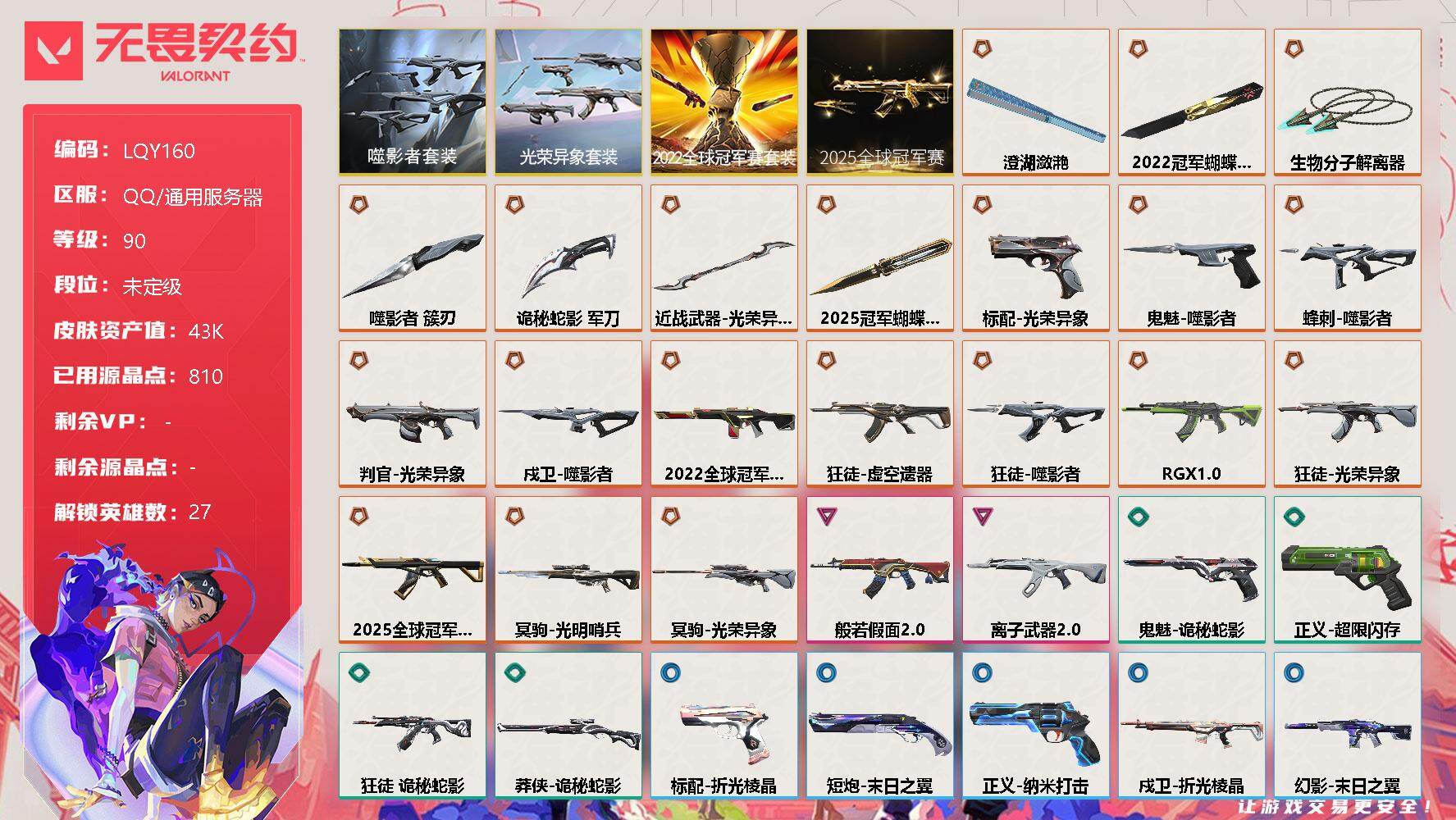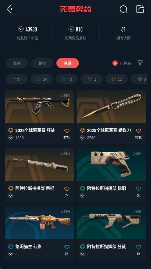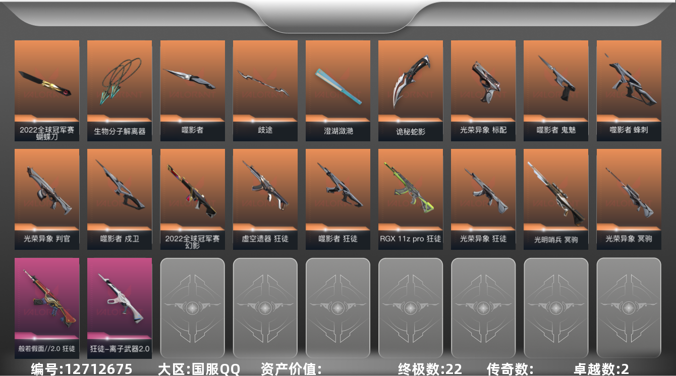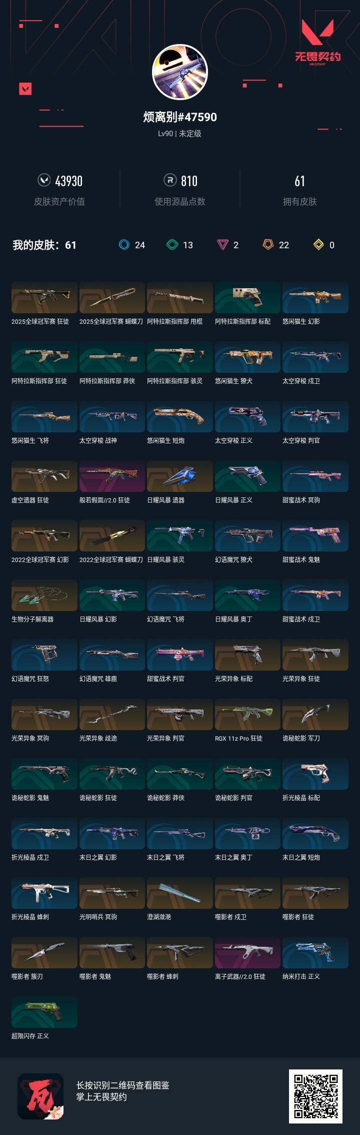 [12712675]皮肤资产价值43930 【套装】:2025全球冠军赛套装,2022全球冠军赛套装,光荣异象套装,噬影者套装 【英雄】:幻棱,炼狱,维斯,暮蝶,钛狐,壹决,铁臂,捷风,雷兹,幽影,不死鸟,贤者,猎枭,蝰蛇,零,芮娜,奇乐,尚勃勒,霓虹,斯凯,夜露,星礈,K/O,海神,盖可,黑梦,钢锁 【近战 武器】:近战武器-2025全球冠军赛 蝴蝶刀,近战武器-2022全球冠军赛 蝴蝶刀,近战武器-光荣异象 歧途,近战武器-噬影者 簇刃,近战武器-澄湖潋滟,近战武器-生物分子解离器,近战武器-诡秘蛇影 军刀 【狂徒】:狂徒-2025全球冠军赛,狂徒-虚空遗器,狂徒-噬影者,狂徒-RGX 11z Pro,狂徒-光荣异象,狂徒-般若假面//2.0,狂徒-离子武器//2.0,狂徒-诡秘蛇影 【幻影】:幻影-2022全球冠军赛,幻影-末日之翼 【戍卫】:戍卫-噬影者,戍卫-折光棱晶 【冥驹】:冥驹-光明哨兵,冥驹-光荣异象 【飞将】:飞将-末日之翼 【莽侠】:莽侠-诡秘蛇影 【奥丁】:奥丁-末日之翼 【判官】:判官-光荣异象,判官-诡秘蛇影 【蜂刺】:蜂刺-噬影者,蜂刺-折光棱晶 【标配】:标配-光荣异象,标配-折光棱晶 【正义】:正义-超限闪存,正义-纳米打击 【鬼魅】:鬼魅-噬影者,鬼魅-诡秘蛇影 【短炮】:短炮-末日之翼 【卡面】:终章:激斗汉堡 卡面,进入射程 卡面,《双城之战》拥抱 卡面,精灵大战 卡面,欢迎来到底城 卡面,南瓜盛典 卡面,修车达人 卡面,正义的化身 卡面,时间到 卡面,最高舞台 卡面,声感陷阱设计图 卡面,梦幻奶茶 卡面,无畏契约GO!第一卷:芮娜 卡面,清除名单 卡面,无畏契约GO!第一卷:零 卡面,铁臂设计图 卡面,代号红色 卡面,新兵报到 卡面,V契约 卡面,无畏契约 卡面 【喷漆】:嗨宝南瓜灯 喷漆,嘭! 喷漆,都算到了 喷漆,控场勿近 喷漆,小丑猫 喷漆,熊抱 喷漆,超级粉丝 喷漆,捷风差距 喷漆,拼一枪 喷漆,买装还是存钱 喷漆,胜利属于无畏契约 喷漆,GLHF 喷漆,无畏契约 喷漆 【挂饰】:终章:猫猫木乃伊 挂饰,悠闲鸡块 挂饰,伞绳 挂饰,《双城之战》小蛋糕 挂饰,第九季//第三幕 纪念币 挂饰,工具腰带 挂饰,熔岩灯 挂饰,第九季//第二幕 纪念币 挂饰,袖珍捷风 挂饰,第九季//第一幕 纪念币 挂饰,天外飞客 挂饰,好运福爪 挂饰,无畏契