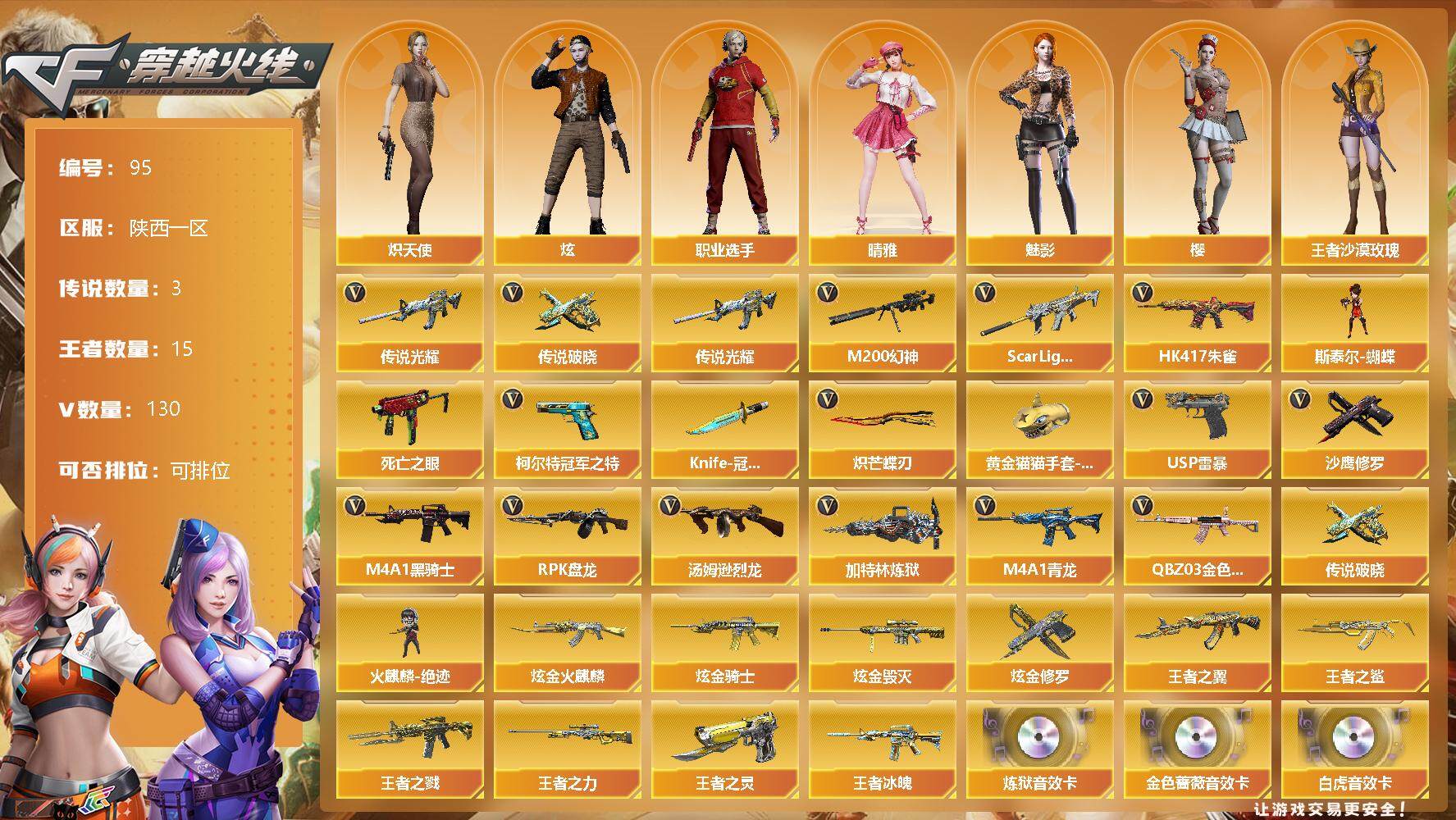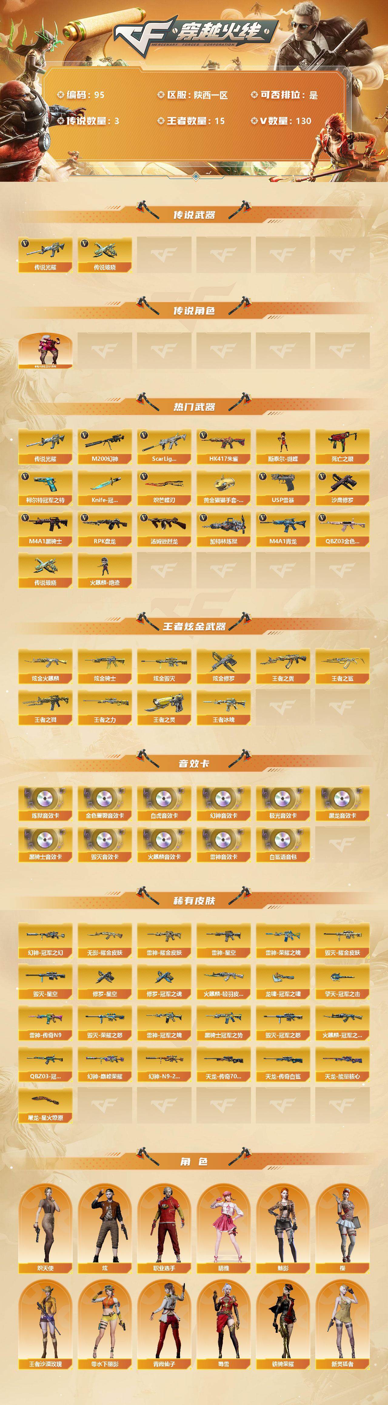 [12712718]陕西一区-130V-15王者-5炫金 【传说武器】:传说光耀,传说破晓 【传说角色】:传说影煞 【热门武器】:传说光耀,传说破晓,QBZ03-金色蔷薇,Scar Light-白虎,HK417-朱雀,M4A1-青龙,M200-幻神,死亡之眼,柯尔特-冠军之特*4,M4A1-黑骑士*3,汤姆逊-烈龙*5,RPK-盘龙,加特林-炼狱,斯泰尔-蝴蝶,火麒麟-绝迹,USP-雷暴,沙鹰-修罗*4,Knife-冠军之刃*2,炽芒蝶刃*3,黄金猫猫手套-白鲨 【王者炫金武器】:炫金火麒麟,炫金骑士,炫金毁灭,炫金修罗*2,王者冰魄,王者之鲨,王者之戮,王者之翼,王者之力,王者凰鸣-觉醒版,王者之灵 【音效卡】:M200-幻神音效卡,AK47-火麒麟音效卡,M4A1-雷神音效卡,M4A1-黑龙音效卡,M4A1-黑骑士音效卡,Barrett-毁灭音效卡,Barrett-极光音效卡,QBZ03-金色蔷薇音效卡,Scar Light-白虎音效卡,加特林-炼狱音效卡,白鲨语音包 【稀有皮肤】:幻神-冠军之幻,幻神-巅峰荣耀,M200-幻神-N9-2022MVP,QBZ03-冠军之薇,雷神-荣耀之魄,雷神-星空,雷神-耀金皮肤,雷神-冠军之魄,雷神-传奇N9,火麒麟-冠军之心*2,火麒麟-轻羽皮肤*2,黑骑士-冠军之势,毁灭-荣耀之怒,毁灭耀金皮肤,毁灭-星空,毁灭-冠军之怒*3,天龙-能量核心,AWM-天龙-传奇70KG,AWM-天龙-传奇白鲨,无影耀金皮肤,修罗-星空,修罗-冠军之魂*4,屠龙-星火燎原,擎天-冠军之击,龙啸-冠军之啸 【角色】:传说影煞,王者沙漠玫瑰,零-水下丽影,樱,魅影,炫,晴雅,战地猎狐,蜀雪,炽天使,新灵狐者,铁骑荣耀,职业选手,青霞仙子 【人偶武器】:火麒麟-绝迹,斯泰尔-蝴蝶,AWM-灵狐-15周年嘉年华,M37-葵,迷你深渊冰龙,迷你超能女侍,深渊终结者手雷 【暴走生化】:斯泰尔-蝴蝶,死亡之眼,超级对讲机 【英雄级武器】:M4A1-夜魔,破空枪刃-夜魔,马来剑-夜魔,AK47-雷暴,USP-雷暴,斩神刀-雷暴,黑武士-CF网剧冠军,天神-CF网剧冠军,擎天-CF网剧冠军,QBZ03-金色蔷薇,Scar Light-白虎,HK417-朱雀,M4A1-青龙,M4A1-雷神*3,M4A1-黑龙,M4A1-黑骑士*3,RPK-盘龙,加特林-炼狱,汤姆逊-烈龙*5