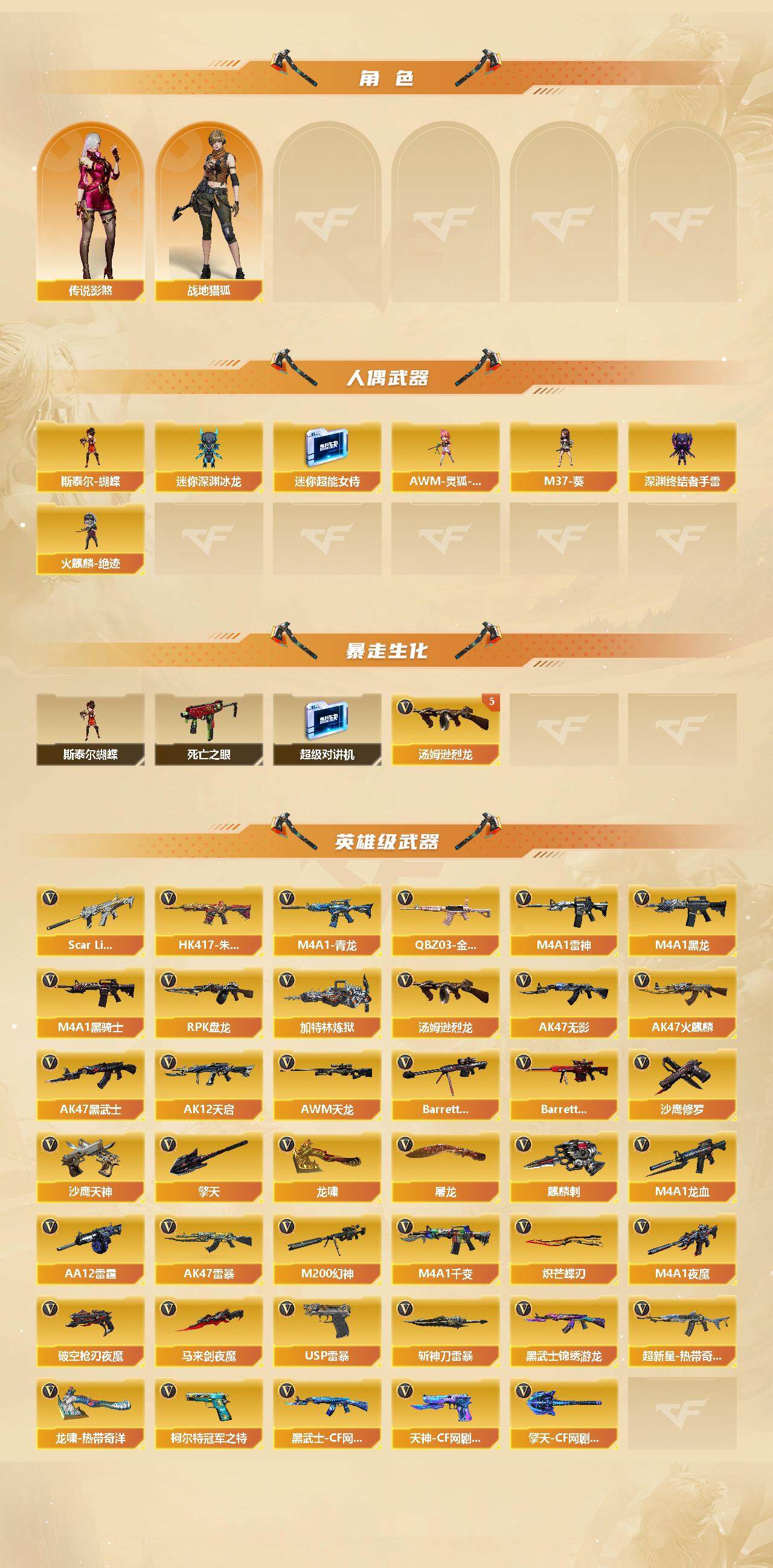 【英雄级武器】:M4A1-夜魔,破空枪刃-夜魔,马来剑-夜魔,AK47-雷暴,USP-雷暴,斩神刀-雷暴,黑武士-CF网剧冠军,天神-CF网剧冠军,擎天-CF网剧冠军,QBZ03-金色蔷薇,Scar Light-白虎,HK417-朱雀,M4A1-青龙,M4A1-雷神*3,M4A1-黑龙,M4A1-黑骑士*3,RPK-盘龙,加特林-炼狱,汤姆逊-烈龙*5