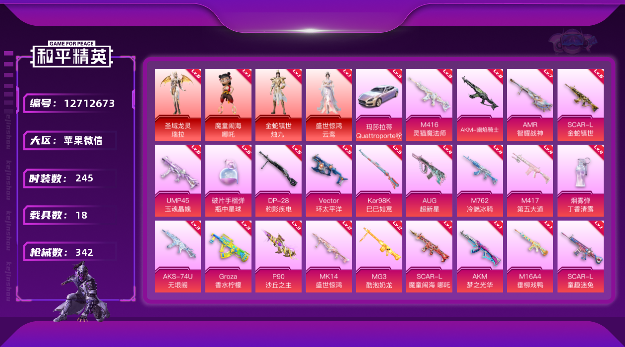 - [13869357]苹果 手Q-6粉装-6特效枪-1载具-1粉色飞行器-26491热力值-1王牌印记-49套装-76枪皮 【热门品类】:角色-2P战斗服款,套装-龟仙人 【粉色载具】:擎天重拳 【粉色套装】:粉装-银河战甲,角色-猩猩队长,角色-蔷薇星,粉装-射星猎手,角色-星云暗核,粉装-星穹咏叹调 【粉色枪皮等级】:SCAR-L-锦绣绵绵(五级),M416-超新星(三级),Kar98K-未来歌姬(四级),Kar98K-巳巳如意(一级),Mk14-甜梦熊击(五级),MG-36-幻彩电音(五级) 【粉色枪皮】:SCAR-L-锦绣绵绵,M416-超新星,Kar98K-未来歌姬,Kar98K-巳巳如意,Mk14-甜梦熊击,MG-36-幻彩电音 【粉色飞行器】:萌物绒绒飞行器 【粉色降落伞】:星之彼岸降落伞,未来歌姬降落伞,闲梦青缨降落伞,萌物绒绒降落伞,万古烈焰降落伞,夜幕颂歌降落伞,幻彩电音降落伞,冷漠罗丽降落伞 【稀有套装】:套装-龟仙人,套装-巳巳如意,套装-粉恋花,套装-紫幽梦,套装-蓝冰羽,套装-极速光影,套装-云朵鹅,套装-雪绒豹 【稀有枪皮】:AKM-星之彼岸,AKM-龙的传人,M16A4-幻世战舞者,M16A4-蓝色火焰,SCAR-L-甜蜜旋律,M416-蓝色火焰,GROZA-银河战甲,AUG-2P战斗服款,QBZ-未来歌姬,QBZ-银河战甲,M762-能量风暴,M762-云朵鹅,Mk47-炫光之旅,AC-VAL-快闪甜心,AC-VAL-闲梦青缨,UZI-啾咪啾咪,UZI-天降萌叽,Vector-生命誓言,汤姆逊-天降萌叽,野牛-天星战神,P90-快闪甜心,P90-甜蜜旋律,Kar98K-梦幻火箭,M24-幻彩电音,SKS-未来歌姬,SKS-迅猛狂鲨,VSS-星之彼岸,M417-惊鸿侠骨,MK20-H-快闪甜心,M200-惊鸿侠骨,SVD-云朵鹅,S12K-玩趣呆呆,DBS-圣堂之誓,DBS-幻彩电音,AA12-G-萌物绒绒,SPAS-12-云朵鹅,M249-彩虹符号,M249-星之彼岸,M249-莲影清波,DP-28-甜蜜旋律,MG3-幻世战舞者,MG3-惊鸿侠骨,R45-幻彩电音,沙漠之鹰-快闪甜心,沙漠之鹰-云朵鹅,TMP-9-未来歌姬,爆炸猎弓-惊鸿侠骨,大砍刀-2P战斗服款,大砍刀-云朵鹅 【其他套装】:套装-SS25特训,套装-SS26特训,套装-SS27特训