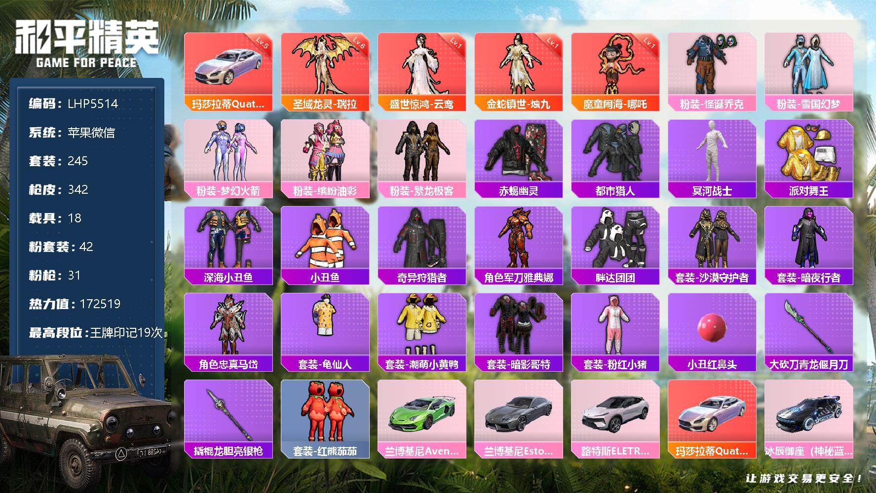 [12712673]素材身法号/5套6级红装可随意切换/玛莎拉蒂(五级)/老木乃伊/M416-灵猫魔法师(九级)/绝世印记9/璀璨碎片1363 苹果 微信-4神装-42粉装-31特效枪-18载具-21粉色飞行器-17.2w热力值-19王牌印记-245套装-342枪皮【红色载具】:玛莎拉蒂Quattroporte(幻星粉)(五级)【红色神装等级】:魔童闹海-哪吒(一级),圣域龙灵-瑞拉(六级),金蛇镇世-烛九(一级),盛世惊鸿-云鸾(一级)【热门品类】:粉装-怪诞乔克,粉装-雪国幻梦,粉装-梦幻火箭,粉装-缤纷油彩,粉装-繁龙极客,套装-赤蝎幽灵,套装-都市猎人,套装-冥河战士,套装-派对舞王,套装-深海小丑鱼,套装-小丑鱼,套装-奇异狩猎者,角色-军刀雅典娜,套装-胖达团团,套装-沙漠守护者,套装-暗夜行者,角色-忠真马岱,套装-龟仙人,套装-潮萌小黄鸭,套装-暗影哥特,套装-粉红小猪,小丑红鼻头,大砍刀-青龙偃月刀,撬棍-龙胆亮银枪,套装-红熊茄茄【粉色载具】:兰博基尼Aventador SVJ(翡翠绿),兰博基尼Estoque(银翼灰),路特斯ELETRE(花绽灰),玛莎拉蒂Quattroporte(幻星粉),冰辰御座(神秘蓝),保时捷911 敞篷版(极速黄),虚妄之影(炫耀紫),合金龙骨(蓝),盛世惊鸿摩托车,踏焰逐风摩托车,僚机-圣域龙宝,快艇-自由的鲸,护世瑞兽,晶梦灵驹,黑曜夜骑,冰绡玉鳞,辉羽雀灵自行车【粉色套装】:粉装-幻影战神,粉装-怪诞乔克,粉装-雪国幻梦,粉装-梦幻火箭,粉装-缤纷油彩,粉装-放客神游,粉装-天禅智恒,粉装-新星烈龙,粉装-迷蝶贵族,粉装-绚金战神,粉装-冰霜白皇,粉装-炙焰红王,粉装-星之彼岸,粉装-彩虹鹿灵,角色-洛天依,粉装-吟月归客,角色-2号机款机体服,粉装-天之羽翼,粉装-恐龙拽拽,粉装-绚丽摇曳,粉装-冷魅冰骑,粉装-赤焰黑爵,粉装-紫电风暴,粉装-圣光天使,角色-复仇流浪者,粉装-冰川红玫,粉装-盖世英雄,粉装-寒光使者,粉装-飒粉甜心,粉装-黄族统领,粉装-闲梦青缨,角色-水仙星,角色-星云暗核,粉装-憨憨奶龙,粉装-繁龙极客,角色-千金淑猫,角色-女娲灵识,角色-幻海仙踪,粉装-御兔特攻,粉装-幻彩电音,角色-狂魇小丑,角色-罗征【粉色枪皮等级】:AKM-梦之光华(一级),AKM-幽焰骑士(八级),M16A4-垂柳戏鸭(一级)