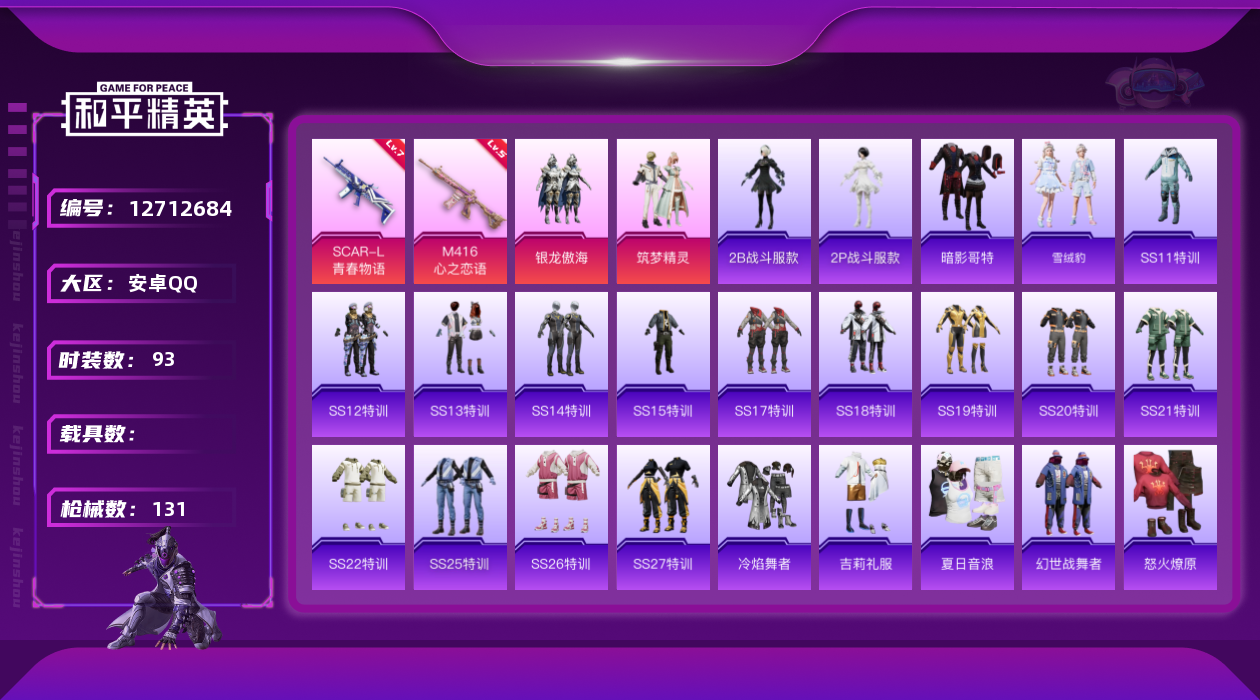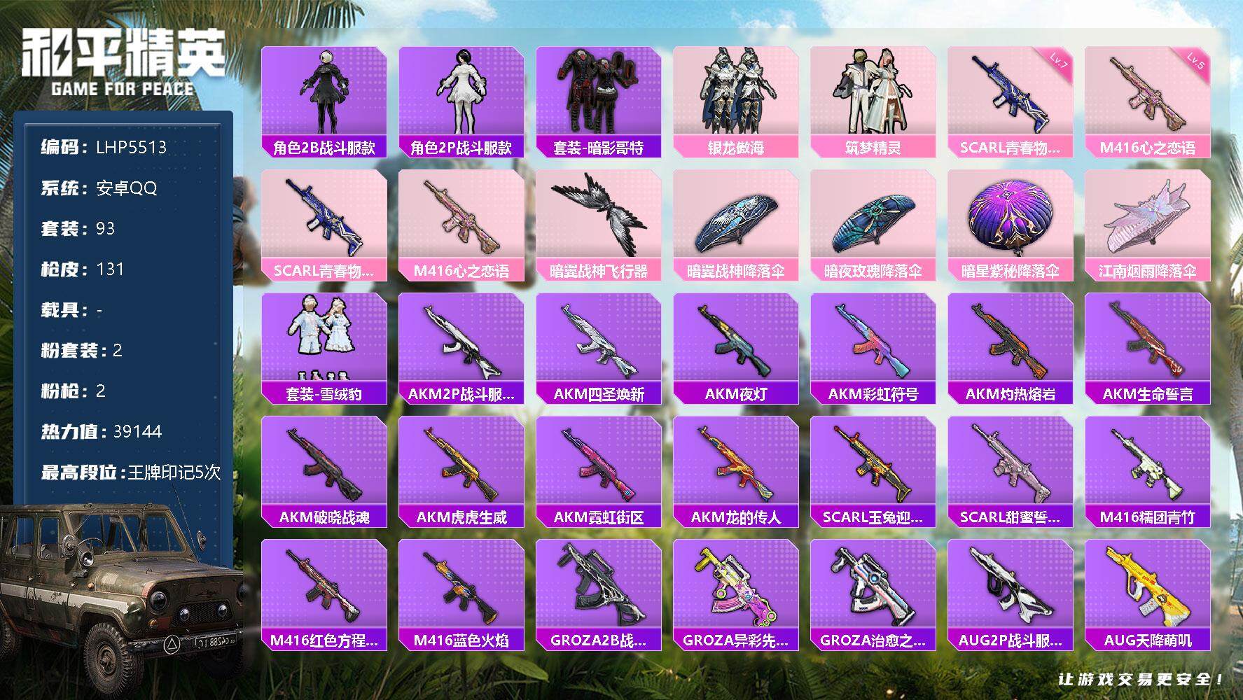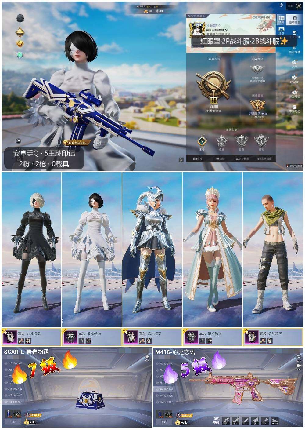 [12712684]安卓 手Q-2粉装-2特效枪-1粉色飞行器-3.9w热力值-5王牌印记-93套装-131枪皮【热门品类】:角色-2B战斗服款,角色-2P战斗服款,套装-暗影哥特【粉色套装】:粉装-银龙傲海,粉装-筑梦精灵【粉色枪皮等级】:SCAR-L-青春物语(七级),M416-心之恋语(五级)【粉色飞行器】:暗翼战神飞行器