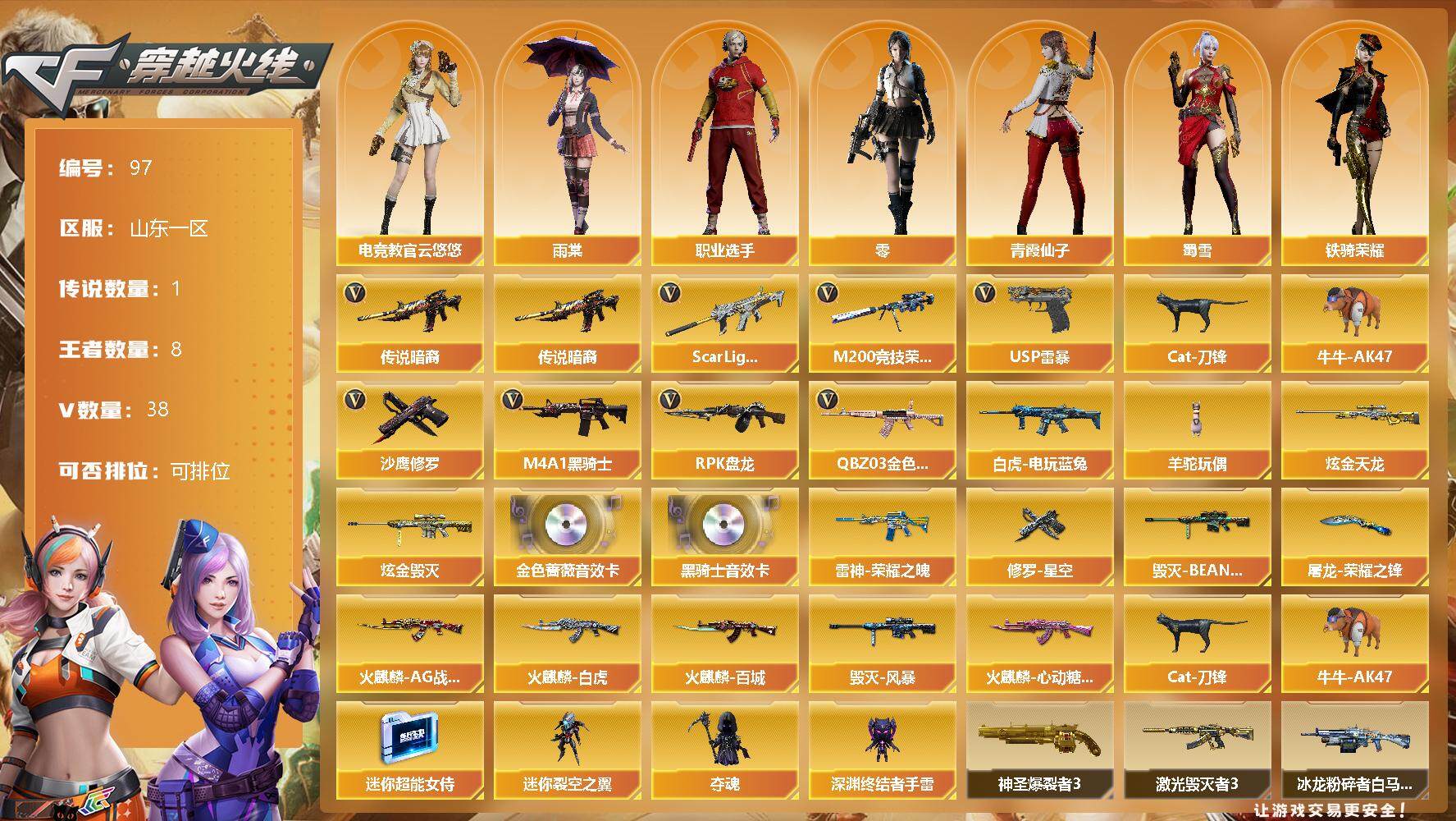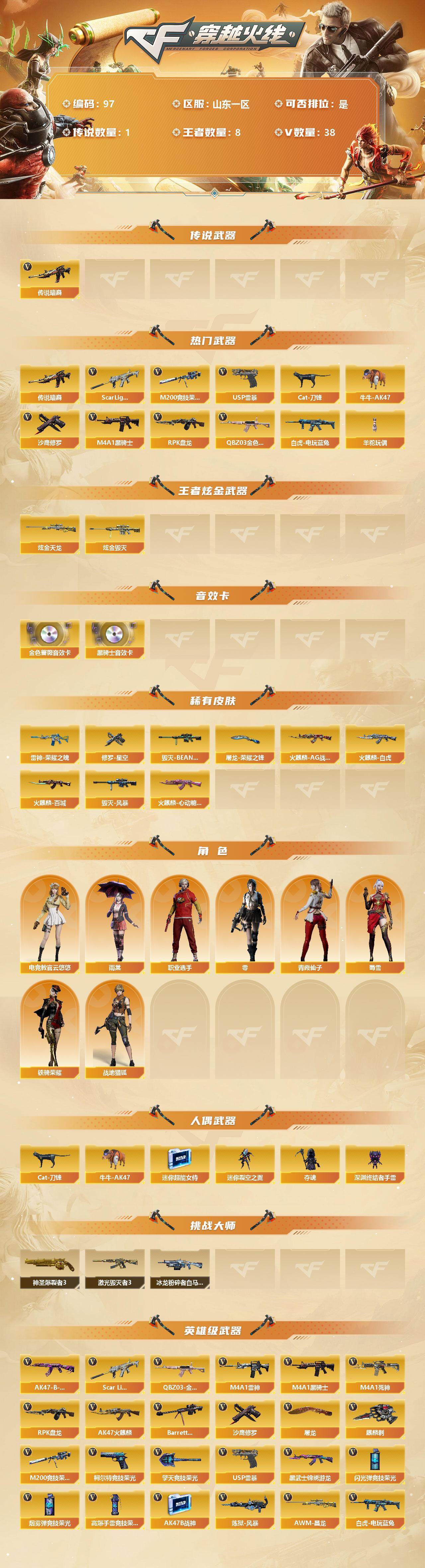 [12712786]山东一区-38V-8王者-2炫金 【传说武器】:传说暗裔 【热门武器】:传说暗裔,QBZ03-金色蔷薇,Scar Light-白虎,M200-竞技荣光,白虎-电玩蓝兔,Cat-刀锋,牛牛-AK47,M4A1-黑骑士,RPK-盘龙,羊驼玩偶,USP-雷暴,沙鹰-修罗*2 【王者炫金武器】:炫金天龙,炫金毁灭 【音效卡】:M4A1-黑骑士音效卡,QBZ03-金色蔷薇音效卡 【稀有皮肤】:雷神-荣耀之魄,火麒麟-AG战队皮肤,火麒麟-白虎,火麒麟-百城,火麒麟-心动糖果,毁灭-BEAN-2020MVP,毁灭-风暴,修罗-星空,屠龙-荣耀之锋 【角色】:零,雨棠,电竞教官-云悠悠,战地猎狐,蜀雪,铁骑荣耀,职业选手,青霞仙子 【人偶武器】:Cat-刀锋,牛牛-AK47,迷你超能女侍,迷你裂空之翼*4,夺魂*2,深渊终结者手雷 【挑战大师】:神圣爆裂者III,激光毁灭者III,冰龙粉碎者-白马银枪 【英雄级武器】:M200-竞技荣光,柯尔特-竞技荣光*2,擎天-竞技荣光,高爆手雷-竞技荣光*2,烟雾弹-竞技荣光*2,闪光弹-竞技荣光*2,USP-雷暴,QBZ03-金色蔷薇,Scar Light-白虎,白虎-电玩蓝兔,M4A1-雷神,M4A1-黑骑士,M4A1-死神,RPK-盘龙,AK47-火麒麟,Barrett-毁灭,黑武士-锦绣游龙,AK47-B-战神,AK47-B-常胜将军,炼狱-风暴,AWM-昌龙*2,沙鹰-修罗*2,麒麟刺*2,屠龙*3 【特殊枪械】:1白虎,1黑骑士,1盘龙