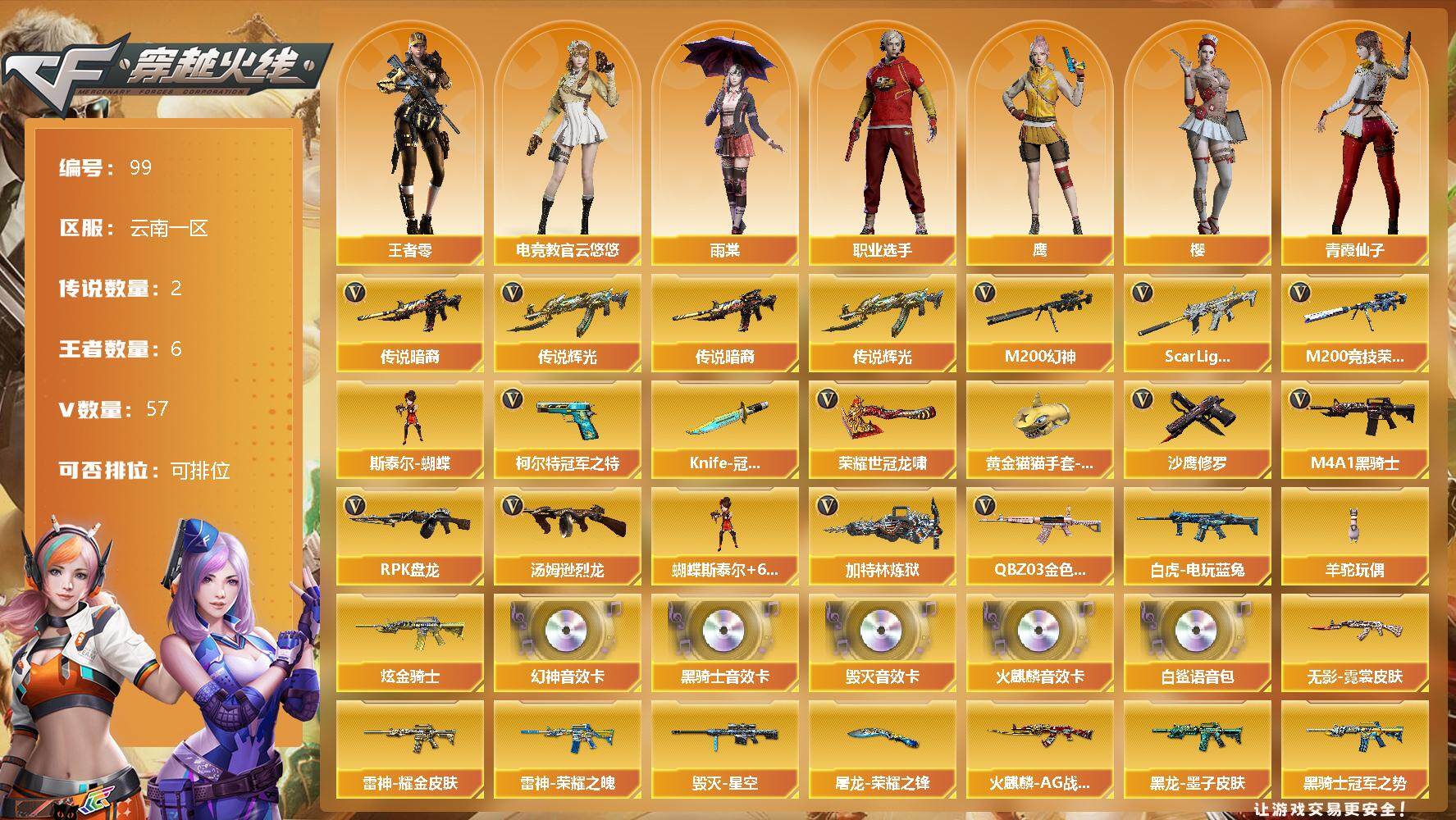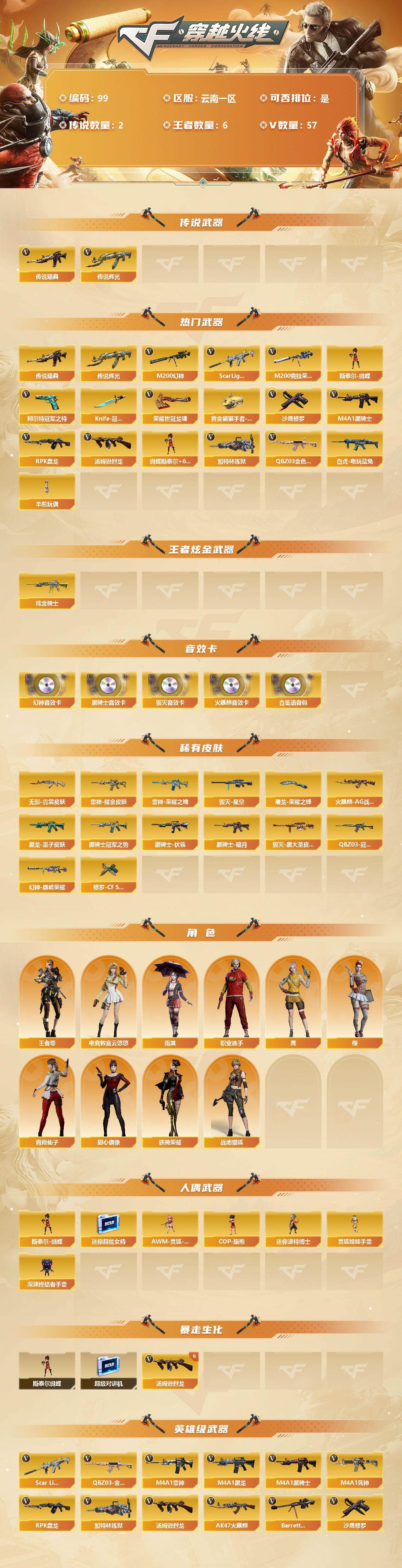 [12712853]云南一区-57V-6王者-1炫金 【传说武器】:传说暗裔,传说辉光 【热门武器】:传说暗裔,传说辉光,QBZ03-金色蔷薇,Scar Light-白虎,M200-幻神,M200-竞技荣光,白虎-电玩蓝兔,柯尔特-冠军之特*2,M4A1-黑骑士*2,汤姆逊-烈龙*6,RPK-盘龙,加特林-炼狱,斯泰尔-蝴蝶,羊驼玩偶,沙鹰-修罗*2,Knife-冠军之刃,荣耀世冠-龙啸,黄金猫猫手套-白鲨 【王者炫金武器】:炫金骑士 【音效卡】:M200-幻神音效卡,AK47-火麒麟音效卡,M4A1-黑骑士音效卡,Barrett-毁灭音效卡,白鲨语音包 【稀有皮肤】:幻神-巅峰荣耀,QBZ03-冠军之薇,雷神-荣耀之魄,雷神-耀金皮肤,火麒麟-AG战队皮肤,黑骑士-暗月,黑骑士-冠军之势,黑骑士-伏羲,黑龙-墨子皮肤,毁灭-星空,毁灭-黑大圣皮肤,无影-霓裳皮肤,修罗-CF STAR,屠龙-荣耀之锋*2 【角色】:王者-零,樱,雨棠,电竞教官-云悠悠,鹰,战地猎狐,铁骑荣耀,职业选手,青霞仙子,甜心偶像 【人偶武器】:斯泰尔-蝴蝶,AWM-灵狐-15周年嘉年华,COP-旗袍,迷你超能女侍,迷你波特博士,灵狐娃娃手雷,深渊终结者手雷 【暴走生化】:斯泰尔-蝴蝶,超级对讲机 【英雄级武器】:M200-竞技荣光,柯尔特-竞技荣光,擎天-竞技荣光,高爆手雷-竞技荣光*3,烟雾弹-竞技荣光*3,闪光弹-竞技荣光*3,荣耀世冠-龙啸,QBZ03-金色蔷薇,Scar Light-白虎,白虎-电玩蓝兔,M4A1-雷神,M4A1-黑龙,M4A1-黑骑士*2,M4A1-死神,RPK-盘龙,加特林-炼狱,汤姆逊-烈龙*6,AK47-火麒麟*2,Barrett-毁灭,M200-幻神,黑武士-锦绣游龙,AK-47-猩红传说,AWM-昌龙,柯尔特-冠军之特*2,沙鹰-天神,沙鹰-修罗*2,麒麟刺,擎天,屠龙*2 【特殊枪械】:蝴蝶斯泰尔+6烈龙,1白虎,2黑骑士,6烈龙,1盘龙,1炼狱,1蝴蝶斯泰尔