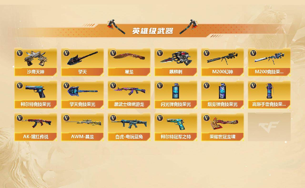 【英雄级武器】:M200-竞技荣光,柯尔特-竞技荣光,擎天-竞技荣光,高爆手雷-竞技荣光*3,烟雾弹-竞技荣光*3,闪光弹-竞技荣光*3,荣耀世冠-龙啸,QBZ03-金色蔷薇,Scar Light-白虎,白虎-电玩蓝兔,M4A1-雷神,M4A1-黑龙,M4A1-黑骑士*2,M4A1-死神,RPK-盘龙,加特林-炼狱,汤姆逊-烈龙*6,AK47-火麒麟*2,Barrett-毁灭,M200-幻神,黑武士-锦绣游龙,AK-47-猩红传说,AWM-昌龙,柯尔特-冠军之特*2,沙鹰-天神,沙鹰-修罗*2,麒麟刺,擎天,屠龙*2