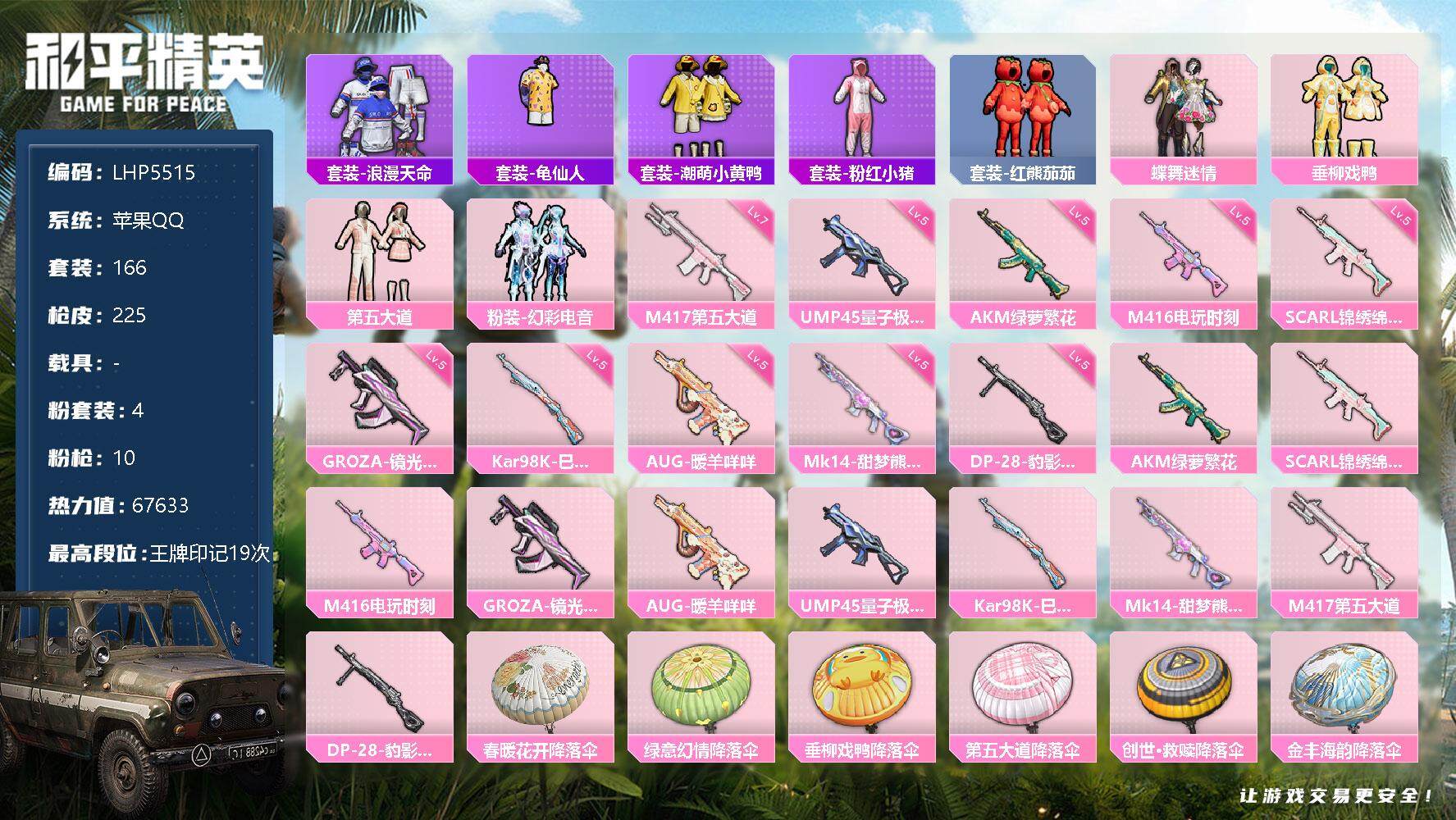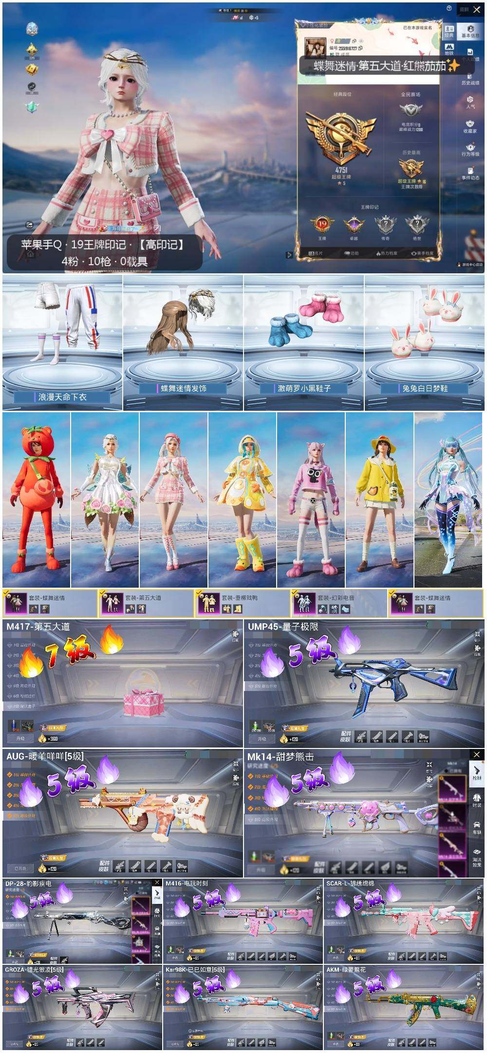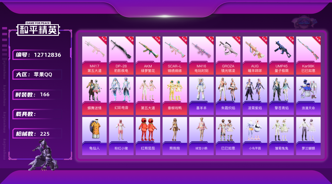 [12712836]地铁满天赋 苹果 手Q-4粉装-10特效枪-6.7w热力值-19王牌印记-166套装-225枪皮【热门品类】:套装-浪漫天命,套装-龟仙人,套装-潮萌小黄鸭,套装-粉红小猪,套装-红熊茄茄【粉色套装】:粉装-蝶舞迷情,粉装-垂柳戏鸭,粉装-第五大道,粉装-幻彩电音【粉色枪皮等级】:AKM-绿萝繁花(五级),SCAR-L-锦绣绵绵(五级),M416-电玩时刻(五级),GROZA-镜光银凌(五级),AUG-暖羊咩咩(五级),UMP45-量子极限(五级),Kar98K-巳巳如意(五级),Mk14-甜梦熊击(五级),M417-第五大道(七级),DP-28-豹影疾电(五级)