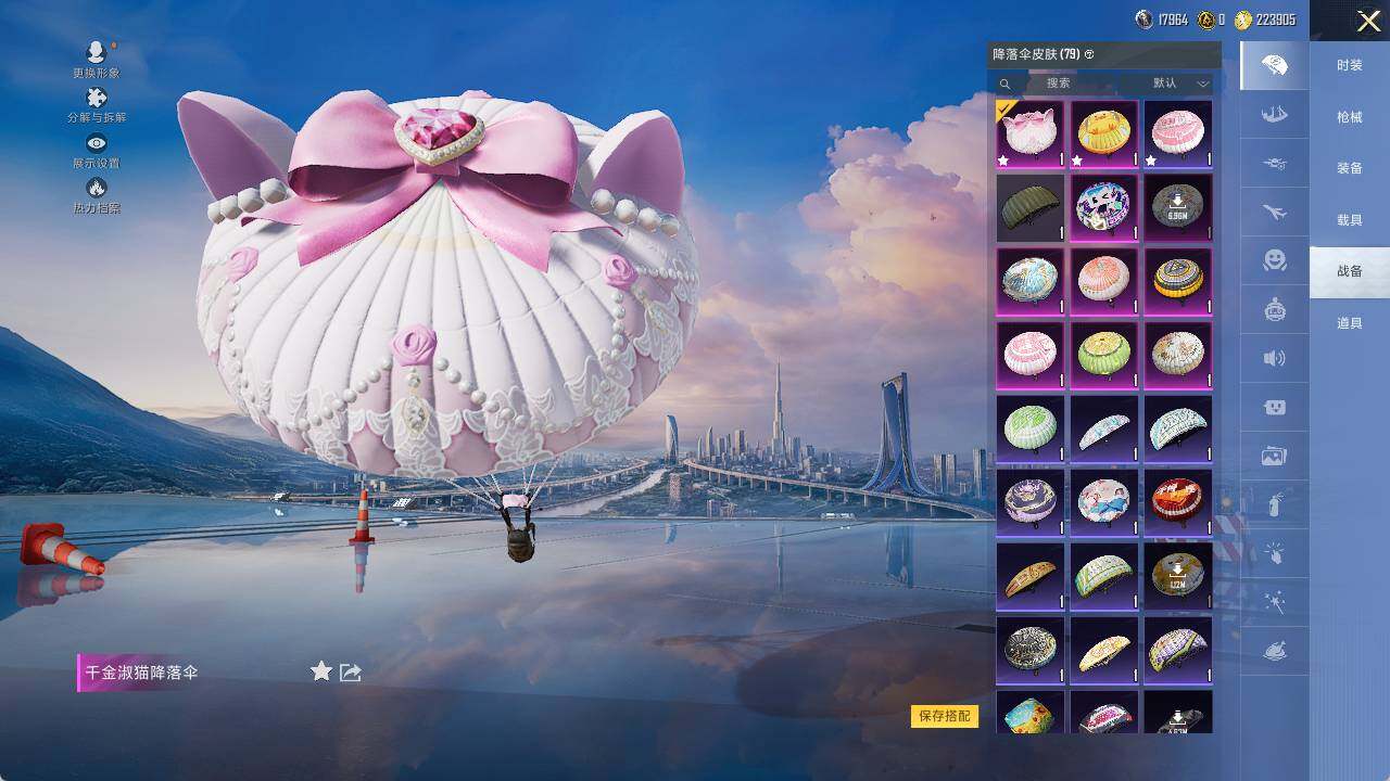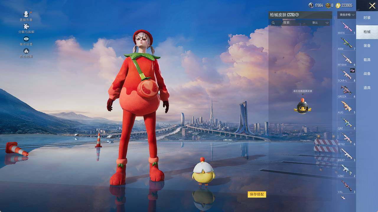 AKM-绿萝繁花,M416-电玩时刻,GROZA-镜光银凌,AUG-暖羊咩咩,UMP45-量子极限,Kar98K-巳巳如意,M417-第五大道