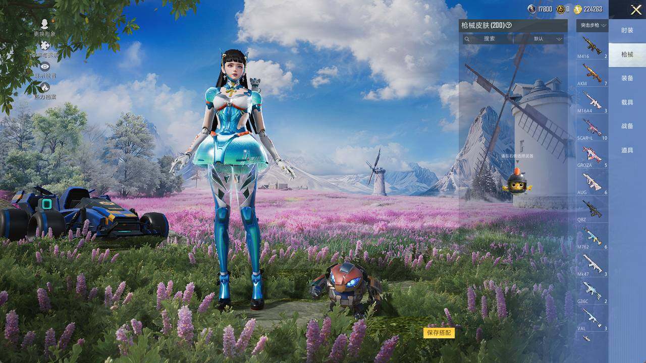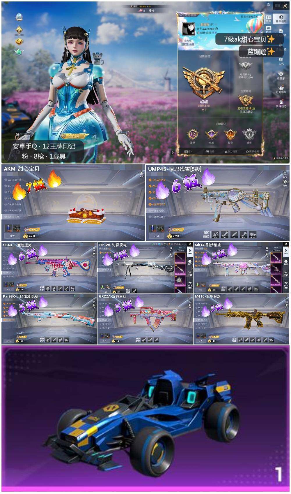 AKM-甜心宝贝,SCAR-L-童趣迷兔,M416-五爪金龙,GROZA-旋转彩虹,UMP45-相思残雪,Kar98K-巳巳如意