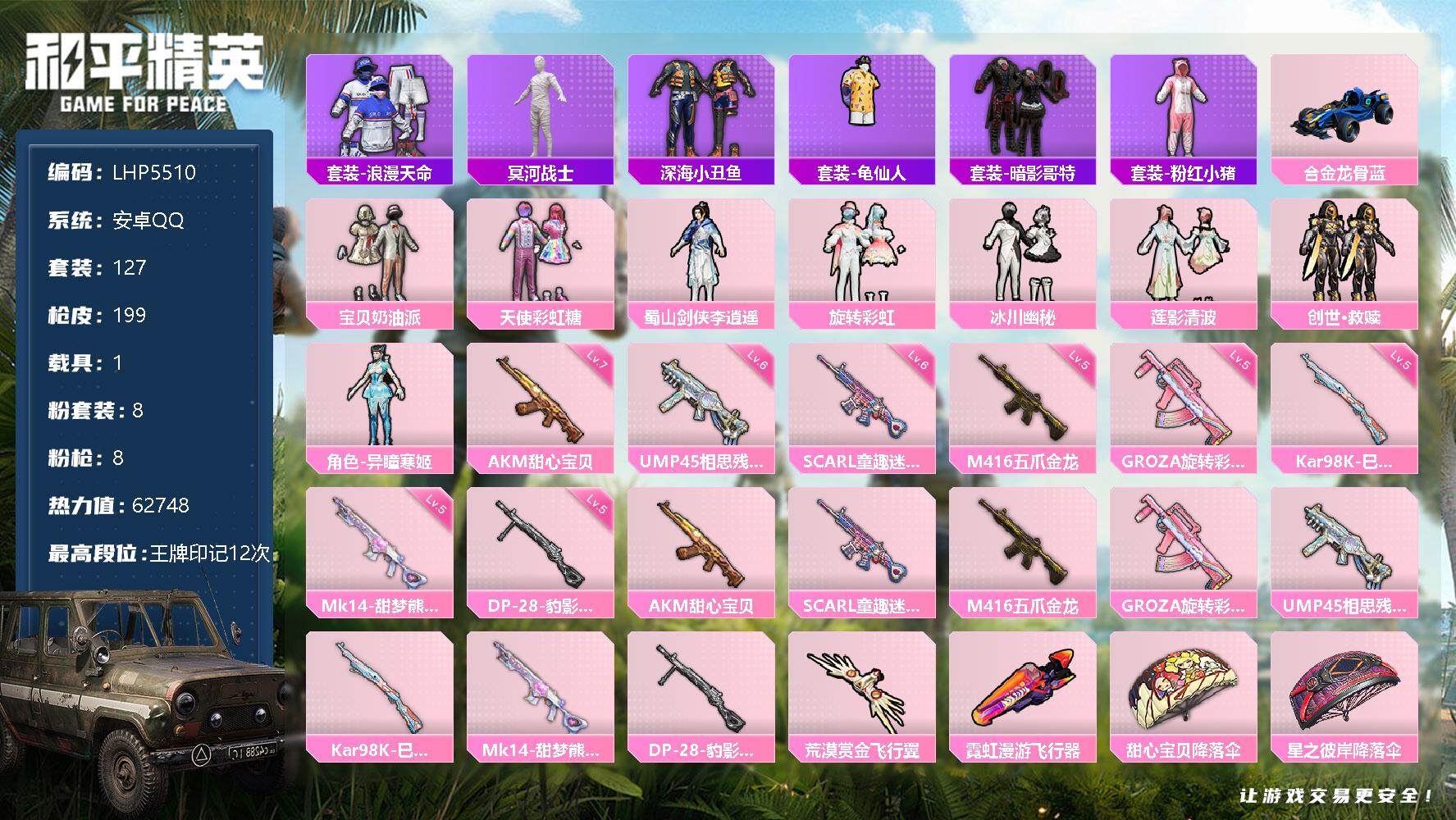 [12712926]素材身法号/地铁满天赋/老木乃伊 安卓 手Q-8粉装-8特效枪-1载具-2粉色飞行器-6.2w热力值-12王牌印记-127套装-199枪皮【热门品类】:套装-浪漫天命,套装-冥河战士,套装-深海小丑鱼,套装-龟仙人,套装-暗影哥特,套装-粉红小猪【粉色载具】:合金龙骨(蓝)【粉色套装】:粉装-宝贝奶油派,粉装-天使彩虹糖,蜀山剑侠-李逍遥,粉装-旋转彩虹,粉装-冰川幽秘,粉装-莲影清波,套装-创世·救赎,角色-异瞳寒姬【粉色枪皮等级】:AKM-甜心宝贝(七级),SCAR-L-童趣迷兔(六级),M416-五爪金龙(五级),GROZA-旋转彩虹(五级),UMP45-相思残雪(六级),Kar98K-巳巳如意(五级),Mk14-甜梦熊击(五级),DP-28-豹影疾电(五级)【粉色飞行器】:荒漠赏金飞行翼,霓虹漫游飞行器