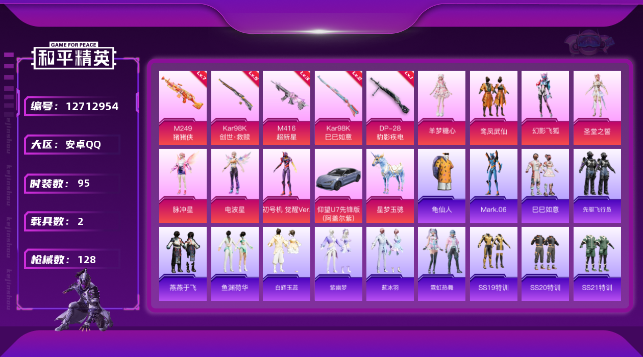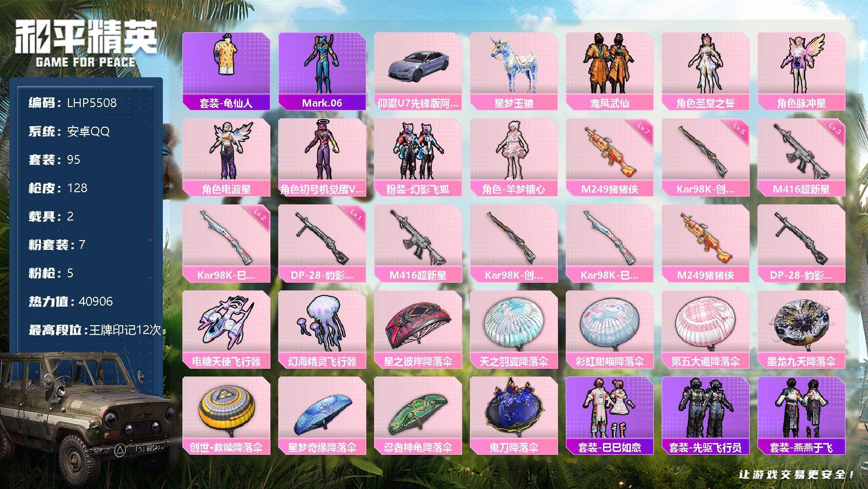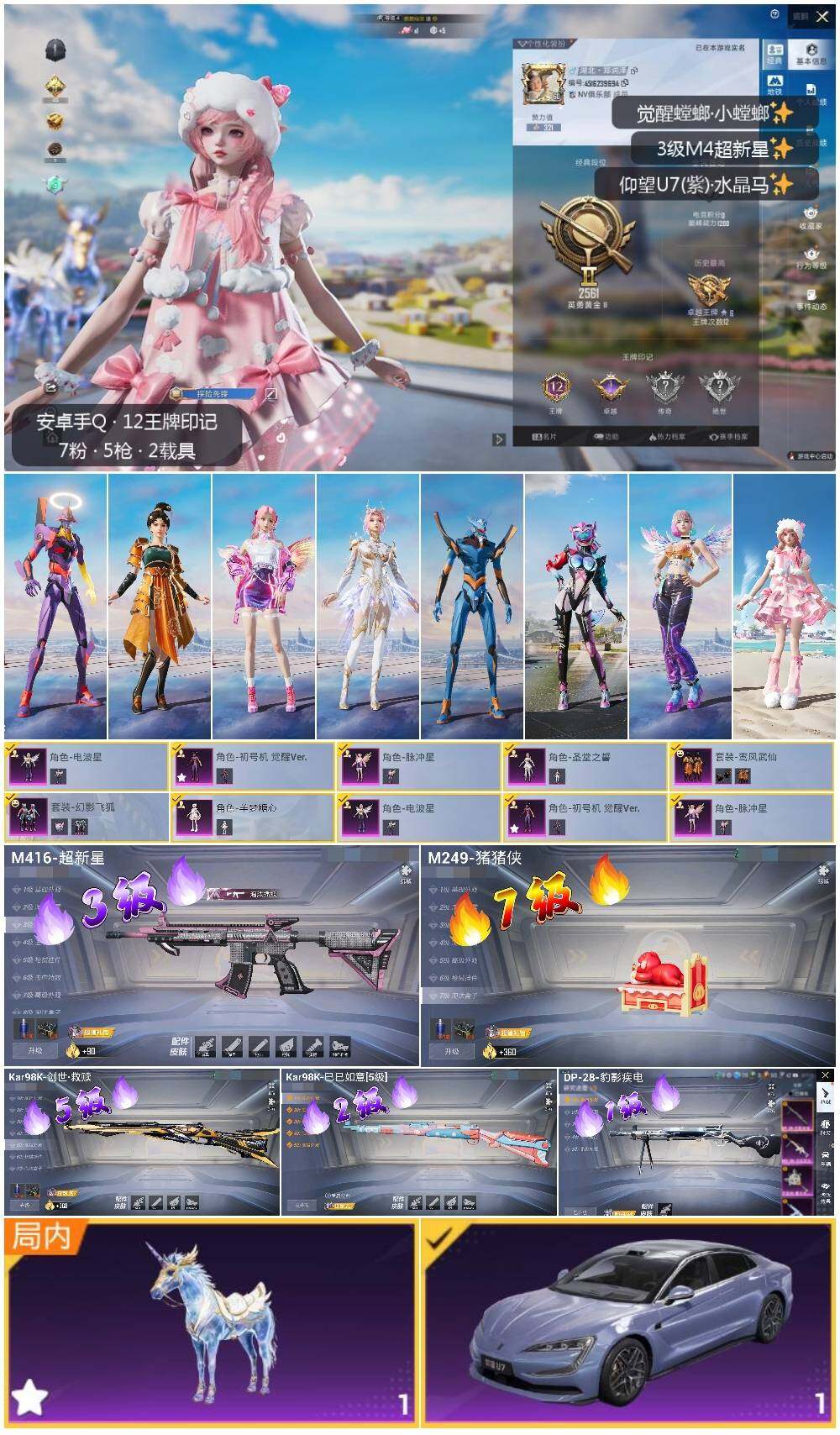 [12712954]素材身法号/扭蛋碎片730 安卓 手Q-7粉装-5特效枪-2载具-2粉色飞行器-4w热力值-12王牌印记-95套装-128枪皮【热门品类】:套装-龟仙人,角色-Mark.06【粉色载具】:仰望U7(阿盖尔紫),星梦玉骢【粉色套装】:粉装-鸾凤武仙,角色-圣堂之誓,角色-脉冲星,角色-电波星,角色-初号机 觉醒Ver.,粉装-幻影飞狐,角色-羊梦糖心【粉色枪皮等级】:M416-超新星(三级),Kar98K-创世·救赎(五级),Kar98K-巳巳如意(二级),M249-猪猪侠(七级),DP-28-豹影疾电(一级)【粉色飞行器】:电糖天使飞行器,幻海精灵飞行器
