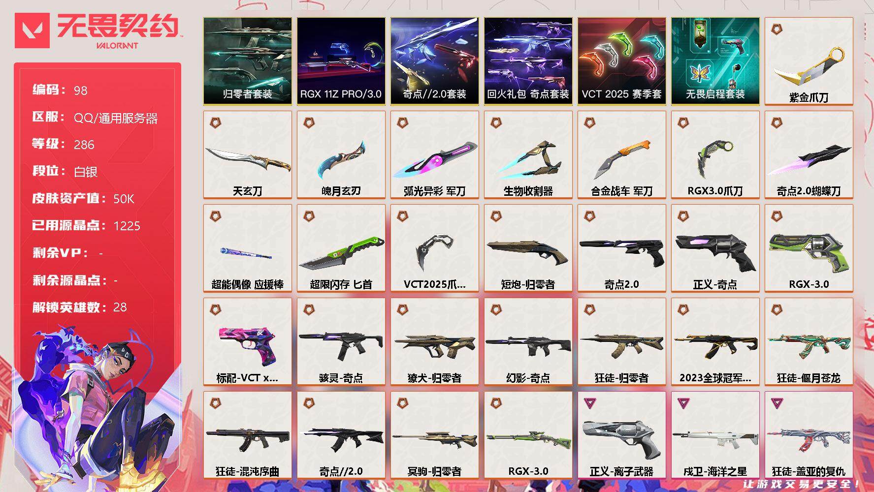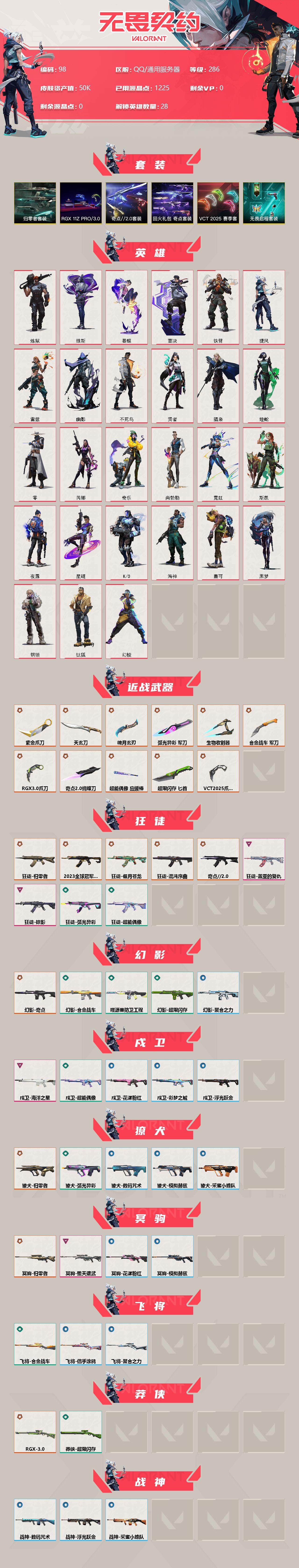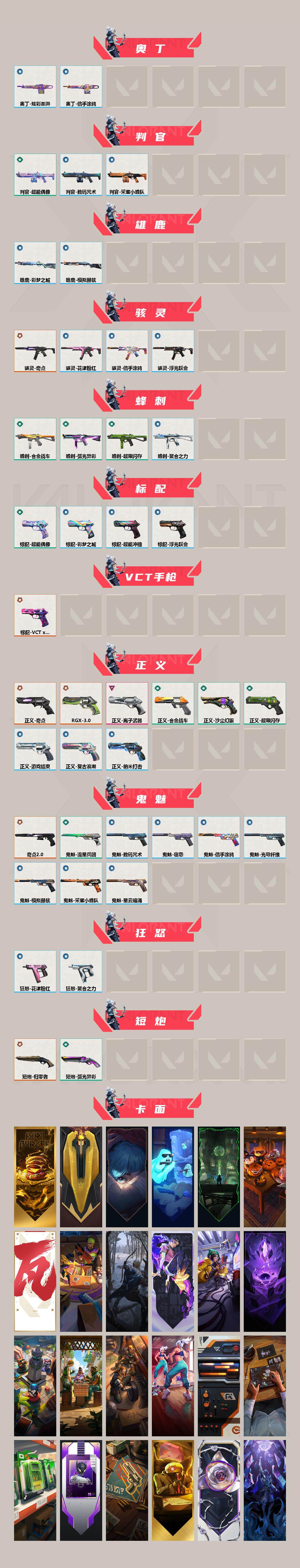[12713517]【套装】:VCT 2025 赛季套装,RGX 11z Pro//3.0套装,奇点//2.0套装,归零者套装,回火礼包:奇点套装,无畏启程套装 【英雄】:幻棱,炼狱,维斯,暮蝶,钛狐,壹决,铁臂,捷风,雷兹,幽影,不死鸟,贤者,猎枭,蝰蛇,零,芮娜,奇乐,尚勃勒,霓虹,斯凯,夜露,星礈,K/O,海神,盖可,黑梦,钢锁 【近战 武器】:近战武器-奇点//2.0 蝴蝶刀,近战武器-VCT 2025 爪刀,近战武器-紫金爪刀,近战武器-RGX 11z Pro//3.0 爪刀,近战武器-超能偶像 应援棒,近战武器-超限闪存 匕首,近战武器-合金战车 军刀,近战武器-弧光异彩 军刀,近战武器-魄月玄刃,近战武器-生物收割器,近战武器-天玄刀 【狂徒】:狂徒-2023全球冠军赛,狂徒-归零者,狂徒-混沌序曲,狂徒-奇点//2.0,狂徒-偃月苍龙,狂徒-掠影,狂徒-盖亚的复仇,狂徒-超能偶像,狂徒-弧光异彩 【幻影】:幻影-奇点,幻影-超限闪存,幻影-合金战车,幻影-噬源兽防卫工程,幻影-聚合之力 【戍卫】:戍卫-海洋之星,戍卫-超能偶像,戍卫-彩梦之城,戍卫-浮光跃金,戍卫-花漾粉红 【獠犬】:獠犬-归零者,獠犬-弧光异彩,獠犬-采蜜小蜂队,獠犬-模拟赫兹,獠犬-数码咒术 【冥驹】:冥驹-归零者,冥驹-堕天遗武,冥驹-花漾粉红,冥驹-模拟赫兹 【飞将】:飞将-合金战车,飞将-聚合之力,飞将-信手涂鸦 【莽侠】:莽侠-RGX 11z Pro//3.0,莽侠-超限闪存 【战神】:战神-采蜜小蜂队,战神-浮光跃金,战神-数码咒术 【奥丁】:奥丁-信手涂鸦,奥丁-炫彩澎湃 【判官】:判官-超能偶像,判官-采蜜小蜂队,判官-数码咒术 【雄鹿】:雄鹿-彩梦之城,雄鹿-模拟赫兹 【骇灵】:骇灵-奇点,骇灵-浮光跃金,骇灵-花漾粉红,骇灵-信手涂鸦 【蜂刺】:蜂刺-超限闪存,蜂刺-合金战车,蜂刺-弧光异彩,蜂刺-聚合之力 【标配】:标配-超能偶像,标配-彩梦之城,标配-超能冲撞,标配-浮光跃金 【VCT手枪】:标配-VCT x PRX 【正义】:正义-RGX 11z Pro//3.0,正义-奇点,正义-离子武器,正义-超限闪存,正义-合金战车,正义-沙尘幻旅,正义-复古浪潮,正义-纳米打击,正义-游戏结束 【鬼魅】:鬼魅-奇点//2.0,鬼魅-流星兵团,鬼魅-采蜜小蜂队,鬼魅-光导纤维,鬼魅-