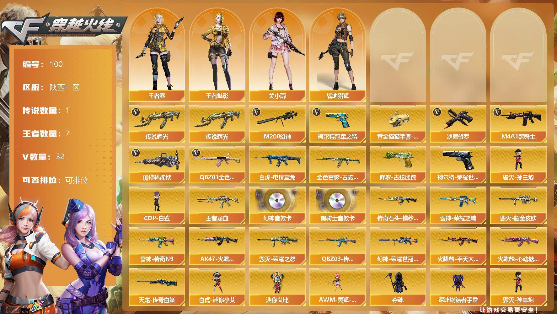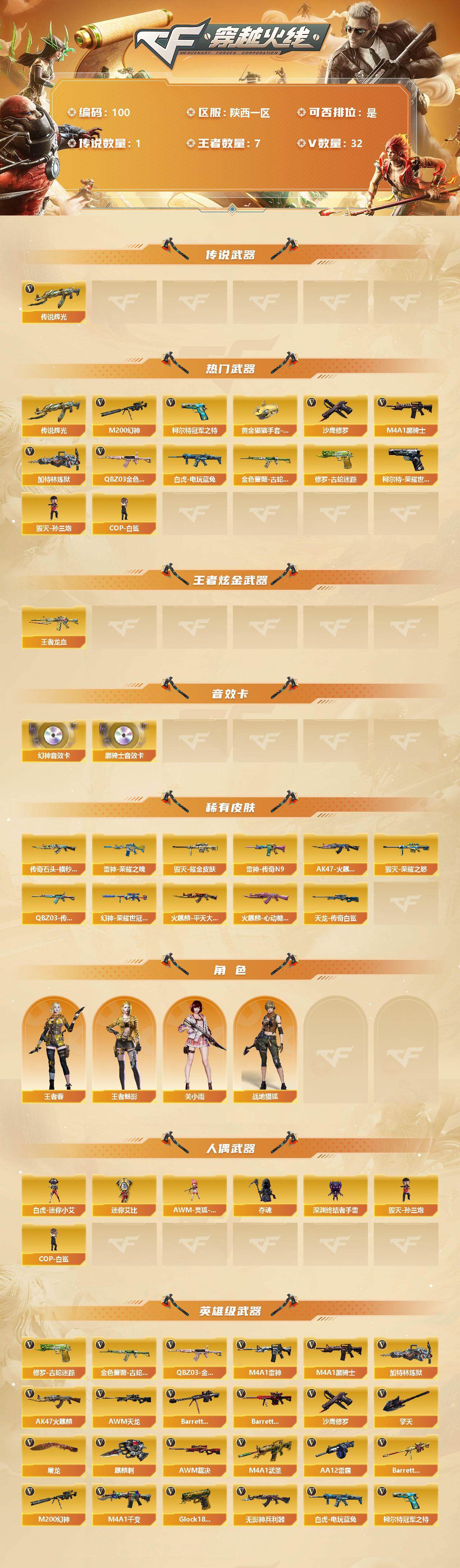 [12713640]陕西一区-32V-7王者-0炫金 【传说武器】:传说辉光 【热门武器】:传说辉光,QBZ03-金色蔷薇,M200-幻神,柯尔特-荣耀世冠白鲨2023,金色蔷薇-古蛇迷踪,修罗-古蛇迷踪,白虎-电玩蓝兔,柯尔特-冠军之特,M4A1-黑骑士,加特林-炼狱,毁灭-孙三炮,COP-白鲨,沙鹰-修罗,黄金猫猫手套-白鲨 【王者炫金武器】:王者龙血 【音效卡】:M200-幻神音效卡,M4A1-黑骑士音效卡 【稀有皮肤】:M200-幻神-荣耀世冠白鲨,QBZ03-传奇宠儿,雷神-荣耀之魄,雷神-传奇N9,AK47-火麒麟-传奇EVEN,传奇石头-横秒之巅,火麒麟-平天大圣,火麒麟-心动糖果,毁灭-荣耀之怒,毁灭耀金皮肤,AWM-天龙-传奇白鲨 【角色】:王者春,王者-魅影,关小雨,战地猎狐 【人偶武器】:COP-白鲨,毁灭-孙三炮,白虎-迷你小艾,AWM-灵狐-15周年嘉年华,迷你艾比,夺魂,深渊终结者手雷 【英雄级武器】:M4A1-武圣,Glock18-武圣,QBZ03-金色蔷薇,金色蔷薇-古蛇迷踪,白虎-电玩蓝兔,无影-神兵利器,M4A1-雷神,M4A1-黑骑士,加特林-炼狱,AK47-火麒麟*2,AWM-天龙,Barrett-毁灭,Barrett-极光,AWM-裁决,AA-12-雷霆,Barrett-朱雀,M200-幻神,M4A1-千变,柯尔特-冠军之特,修罗-古蛇迷踪,沙鹰-修罗,麒麟刺,擎天,屠龙 【特殊枪械】:1黑骑士,1炼狱