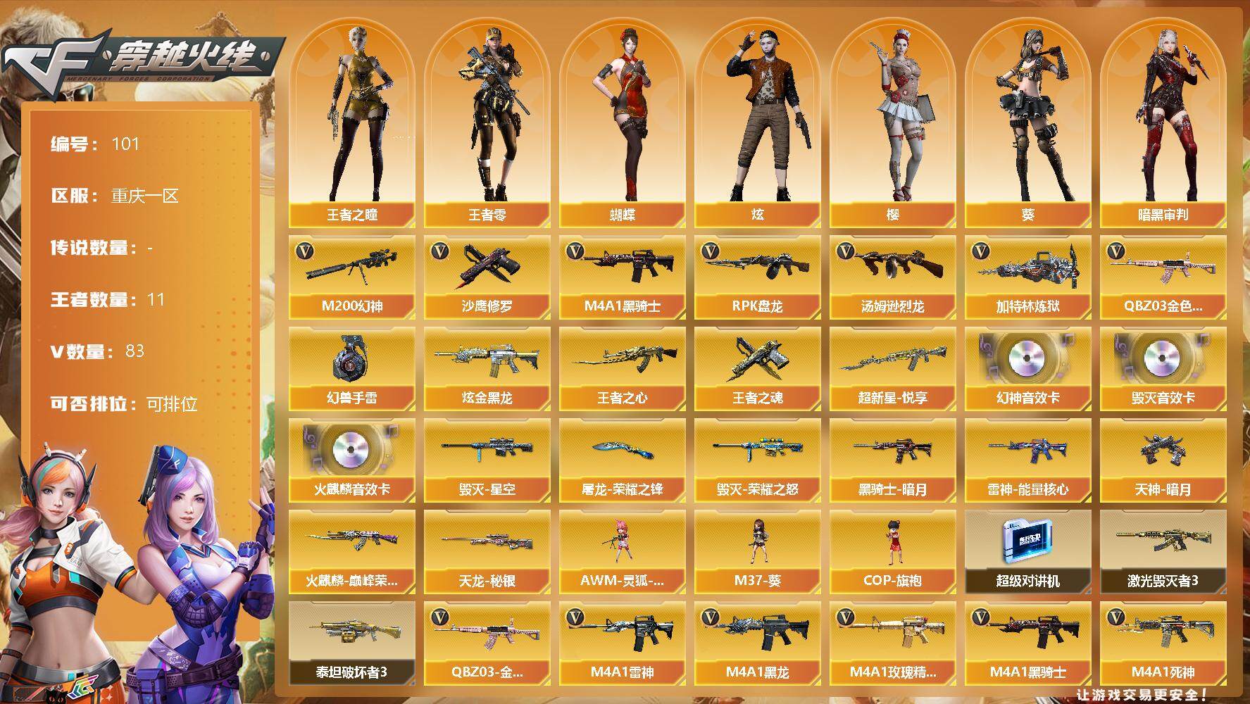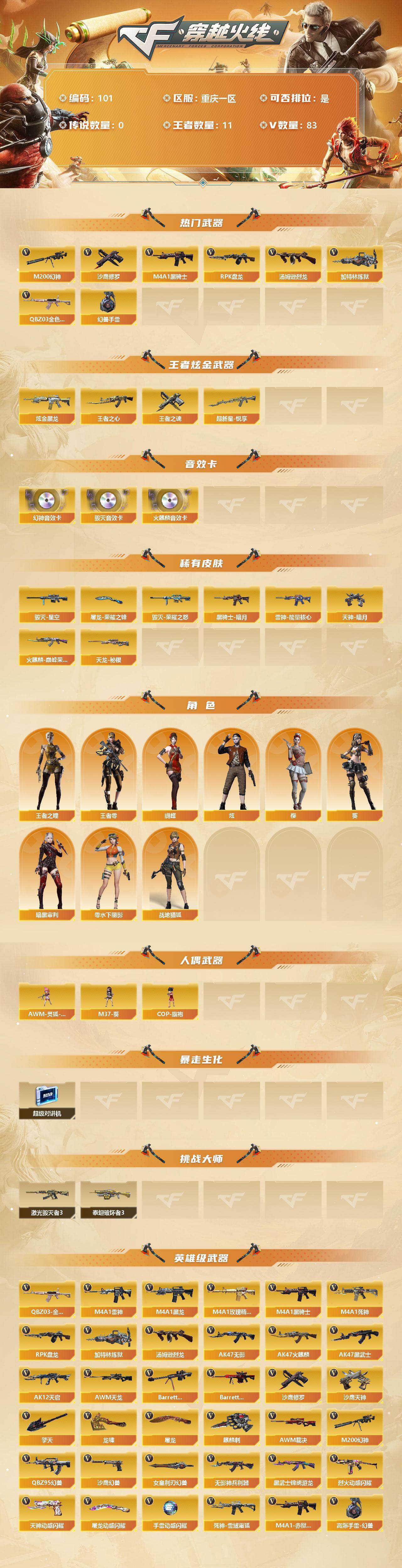 [12713709]重庆一区-83V-11王者-1炫金 【热门武器】:QBZ03-金色蔷薇,M200-幻神,M4A1-黑骑士,汤姆逊-烈龙*2,RPK-盘龙,加特林-炼狱*3,沙鹰-修罗,高爆手雷-幻兽*5 【王者炫金武器】:炫金黑龙,超新星-悦享,王者之心,王者之魂 【音效卡】:M200-幻神音效卡,AK47-火麒麟音效卡,Barrett-毁灭音效卡 【稀有皮肤】:雷神-能量核心,火麒麟-巅峰荣耀,黑骑士-暗月,毁灭-荣耀之怒,毁灭-星空,天龙-秘银,天神-暗月*2,屠龙-荣耀之锋 【角色】:王者-零,王者之瞳,零-水下丽影,葵,樱,蝴蝶,炫,战地猎狐,暗黑审判 【人偶武器】:AWM-灵狐-15周年嘉年华,M37-葵,COP-旗袍 【暴走生化】:超级对讲机 【挑战大师】:激光毁灭者III,AK47-泰坦破坏者III 【英雄级武器】:QBZ95-幻兽,沙鹰-幻兽*5,女皇利刃-幻兽,烈火-动感闪耀,天神-动感闪耀,屠龙-动感闪耀,手雷-动感闪耀,QBZ03-金色蔷薇,无影-神兵利器,M4A1-雷神,M4A1-黑龙,M4A1-玫瑰精灵,M4A1-黑骑士,M4A1-死神,RPK-盘龙,加特林-炼狱*3,汤姆逊-烈龙*2,AK47-无影,AK47-火麒麟,AK47-黑武士,AK12-天启,AWM-天龙*2,Barrett-毁灭,Barrett-极光*2,AWM-裁决,M200-幻神,黑武士-锦绣游龙,死神-雪域霜狐,M4A1-赤狱骑士,沙鹰-天神,沙鹰-修罗,麒麟刺,擎天,龙啸,屠龙*3,高爆手雷-幻兽*5 【特殊枪械】:1黑骑士,2烈龙,1盘龙,3炼狱
