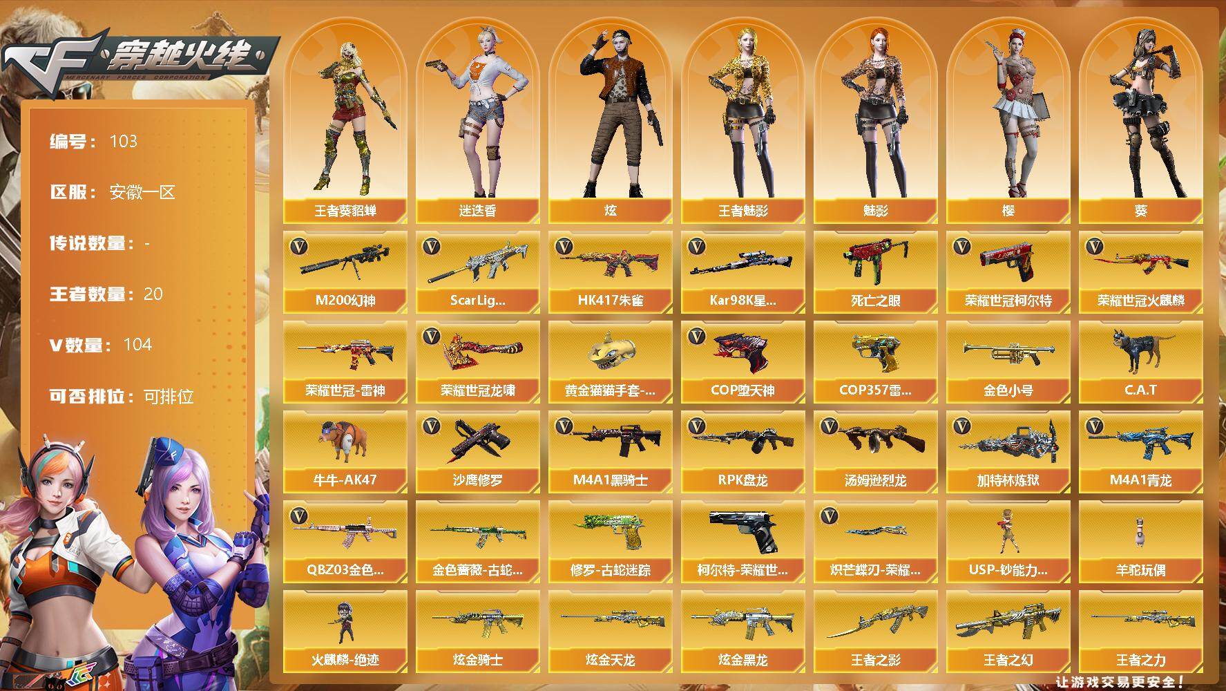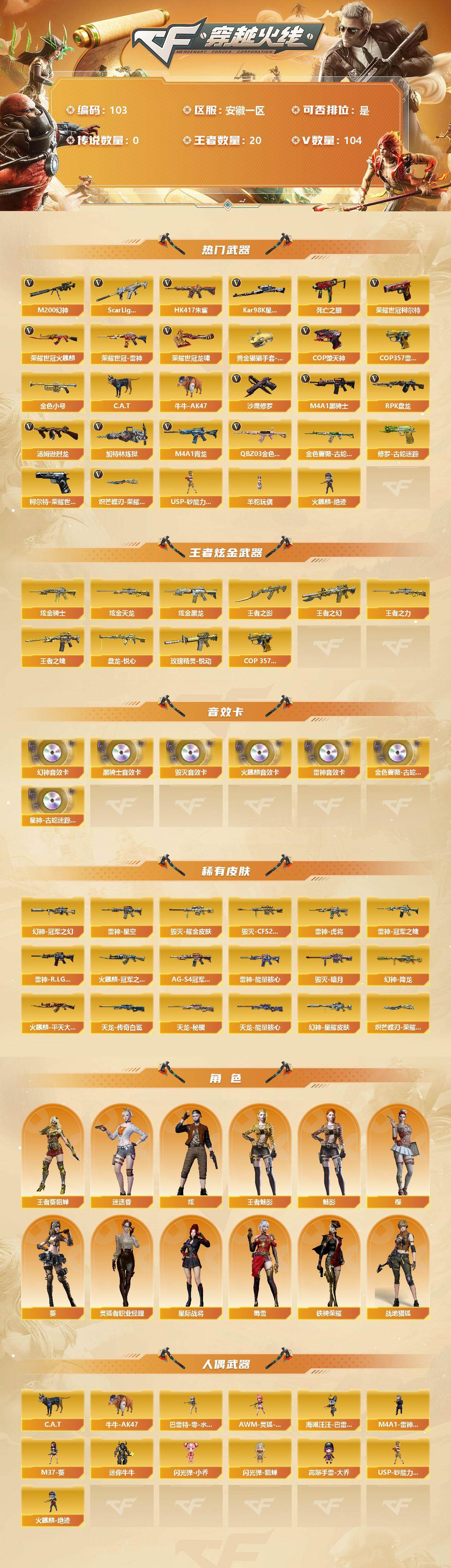[12713796]安徽一区-104V-20王者-4炫金 【热门武器】:QBZ03-金色蔷薇,Scar Light-白虎,HK417-朱雀,M4A1-青龙,M200-幻神,柯尔特-荣耀世冠白鲨2023,金色蔷薇-古蛇迷踪,修罗-古蛇迷踪,死亡之眼*2,荣耀世冠-火麒麟,荣耀世冠-雷神,荣耀世冠-柯尔特,Kar98K-星神,金色小号,C.A.T,牛牛-AK47,M4A1-黑骑士,汤姆逊-烈龙*4,RPK-盘龙*3,加特林-炼狱*7,USP-钞能力灵狐,羊驼玩偶*2,火麒麟-绝迹,COP-堕天神,COP 357-雷霆王者,沙鹰-修罗*4,炽芒蝶刃-荣耀世冠白鲨2023 皮肤,荣耀世冠-龙啸,黄金猫猫手套-白鲨 【王者炫金武器】:炫金骑士,炫金天龙,炫金黑龙*2,盘龙-悦心,王者之幻,玫瑰精灵-悦动,王者之影,王者之力,王者之魄,COP 357-雷霆王者 【音效卡】:星神-古蛇迷踪音效卡,M200-幻神音效卡,AK47-火麒麟音效卡,M4A1-雷神音效卡,M4A1-黑骑士音效卡*3,Barrett-毁灭音效卡,QBZ03-金色蔷薇-古蛇迷踪音效卡 【稀有皮肤】:幻神-冠军之幻,幻神-降龙,幻神-星耀 皮肤,雷神-能量核心*2,雷神-星空,雷神-虎将,雷神-冠军之魄,雷神-R.LGD-CFPLS18冠军,火麒麟-冠军之心,火麒麟-平天大圣,黑骑士-AG-S4冠军典藏,毁灭-暗月*3,毁灭耀金皮肤,毁灭-CFS2020,天龙-秘银,天龙-能量核心,AWM-天龙-传奇白鲨,炽芒蝶刃-荣耀世冠白鲨2023 皮肤 【角色】:王者-葵-貂蝉,王者-魅影,灵狐者-职业经理,葵,樱,魅影,炫,迷迭香,星际战将,战地猎狐,蜀雪,铁骑荣耀 【人偶武器】:USP-钞能力灵狐,火麒麟-绝迹,巴雷特-零-水下丽影,AWM-灵狐-15周年嘉年华,海滩汪汪-巴雷特,M4A1-雷神-精英刀锋,M37-葵,C.A.T,牛牛-AK47,迷你牛牛,闪光弹-小乔,闪光弹-貂蝉,高爆手雷-大乔 【暴走生化】:死亡之眼*2 【英雄级武器】:M4A1-堕天神,COP-堕天神,麒麟刺-堕天神,龙啸-堕天神,M4A1-武圣*4,Glock18-武圣,荣耀世冠-火麒麟,荣耀世冠-雷神,荣耀世冠-柯尔特,荣耀世冠-龙啸,QBZ03-金色蔷薇,Scar Light-白虎,HK417-朱雀,M4A1-青龙,金色蔷薇-古蛇迷踪,M4A1-雷神*2,