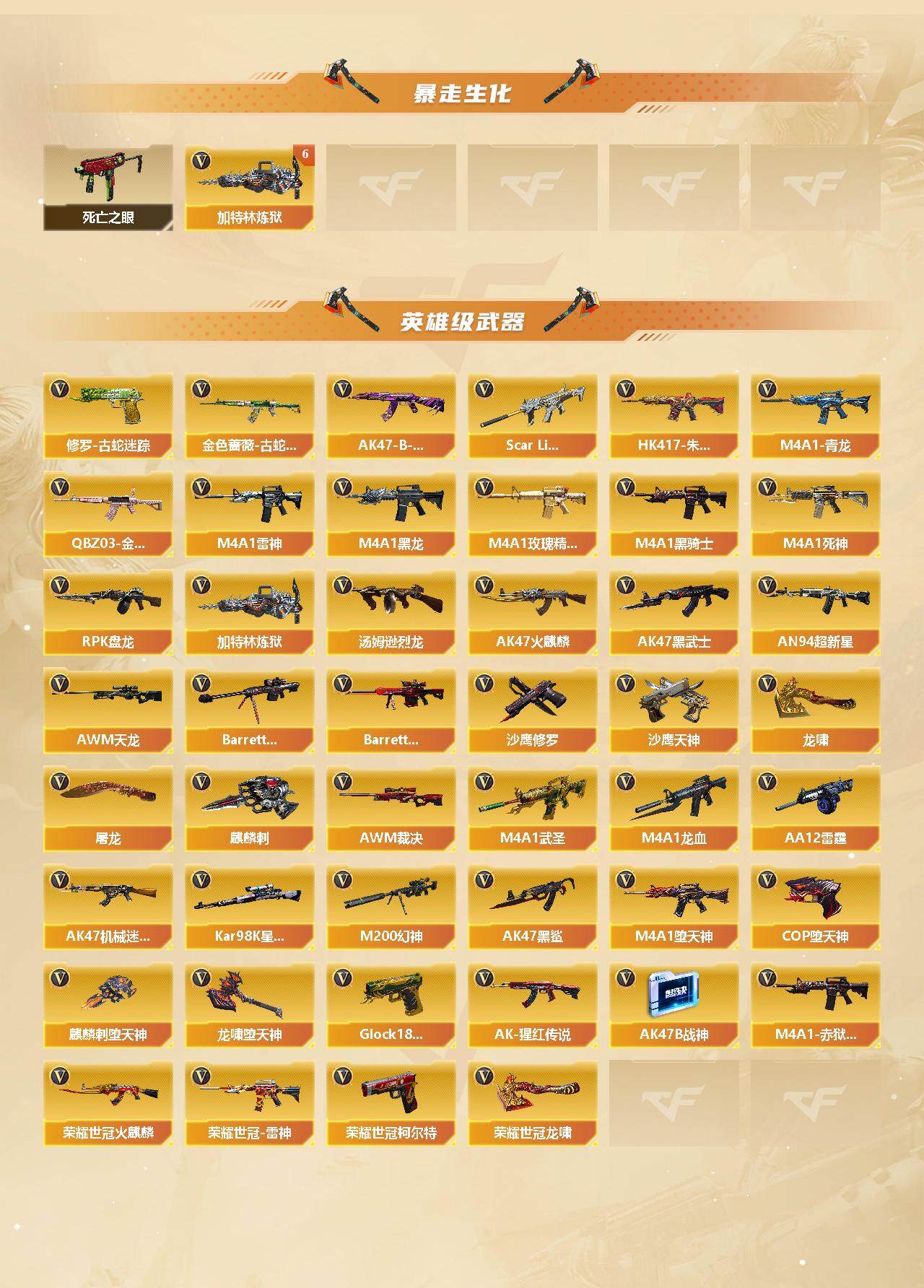【英雄级武器】:M4A1-堕天神,COP-堕天神,麒麟刺-堕天神,龙啸-堕天神,M4A1-武圣*4,Glock18-武圣,荣耀世冠-火麒麟,荣耀世冠-雷神,荣耀世冠-柯尔特,荣耀世冠-龙啸,QBZ03-金色蔷薇,Scar Light-白虎,HK417-朱雀,M4A1-青龙,金色蔷薇-古蛇迷踪,M4A1-雷神*2,